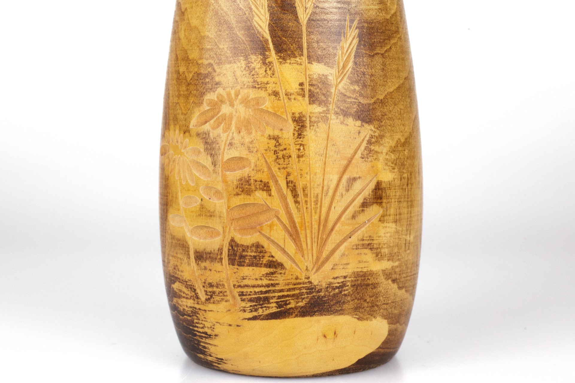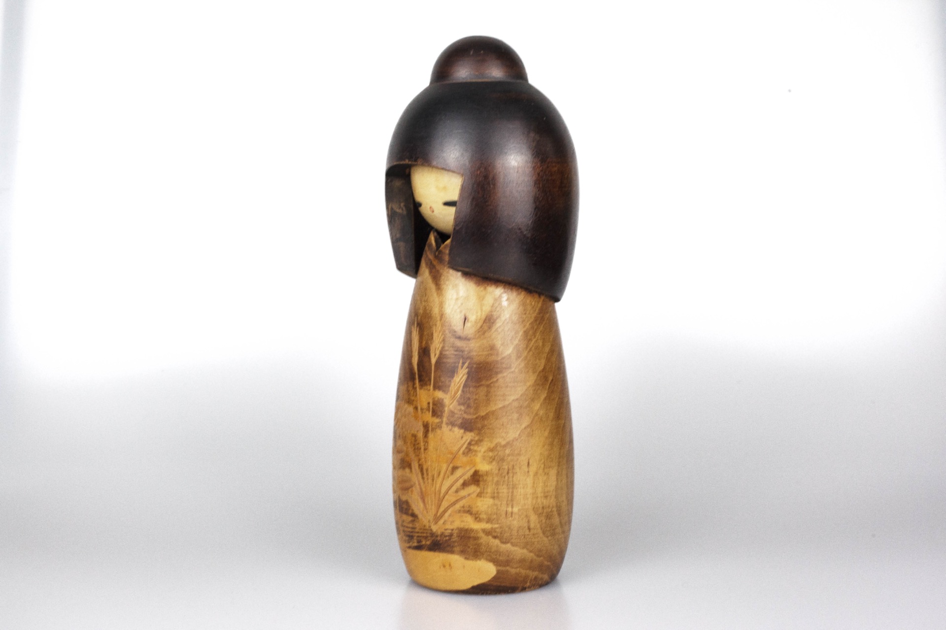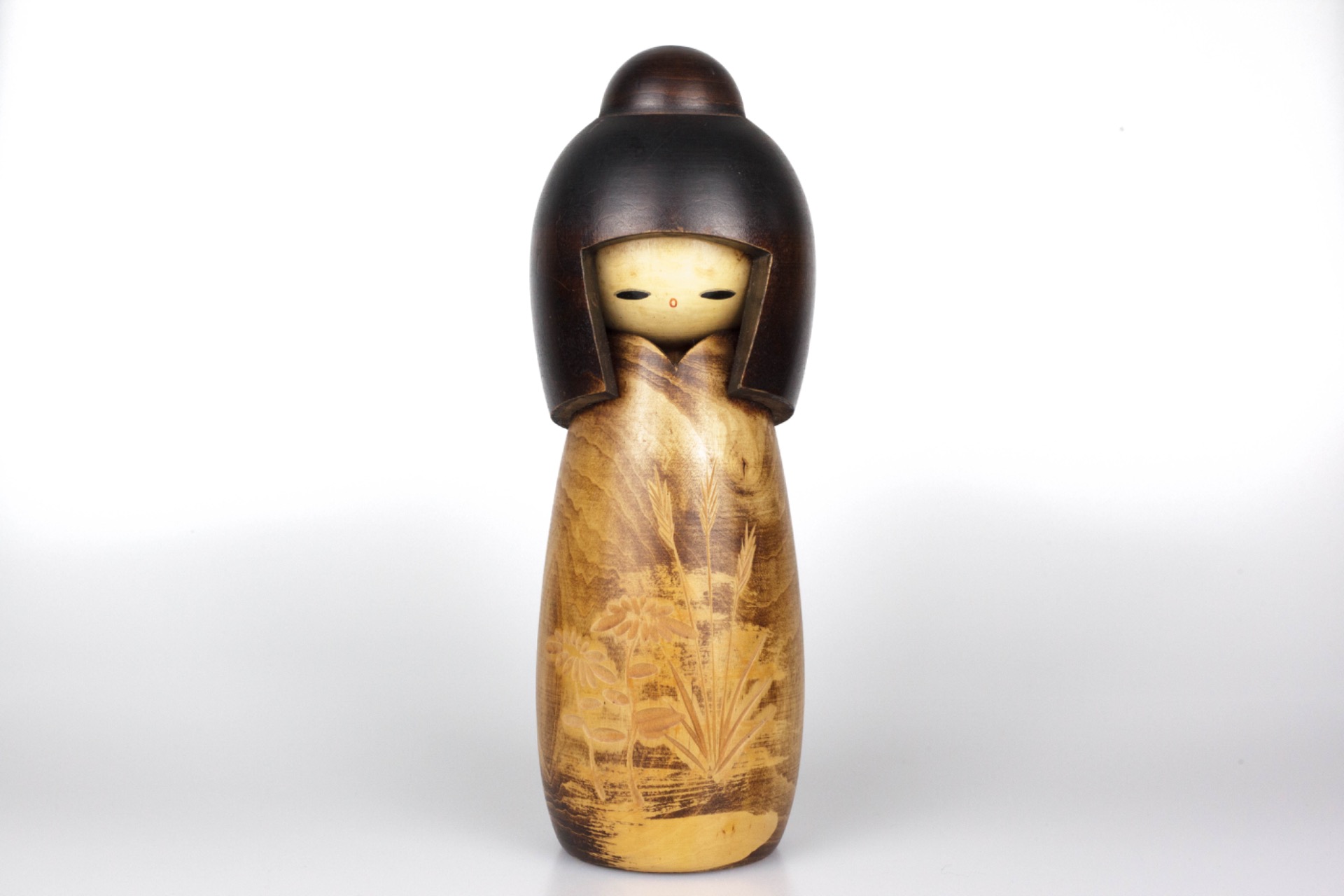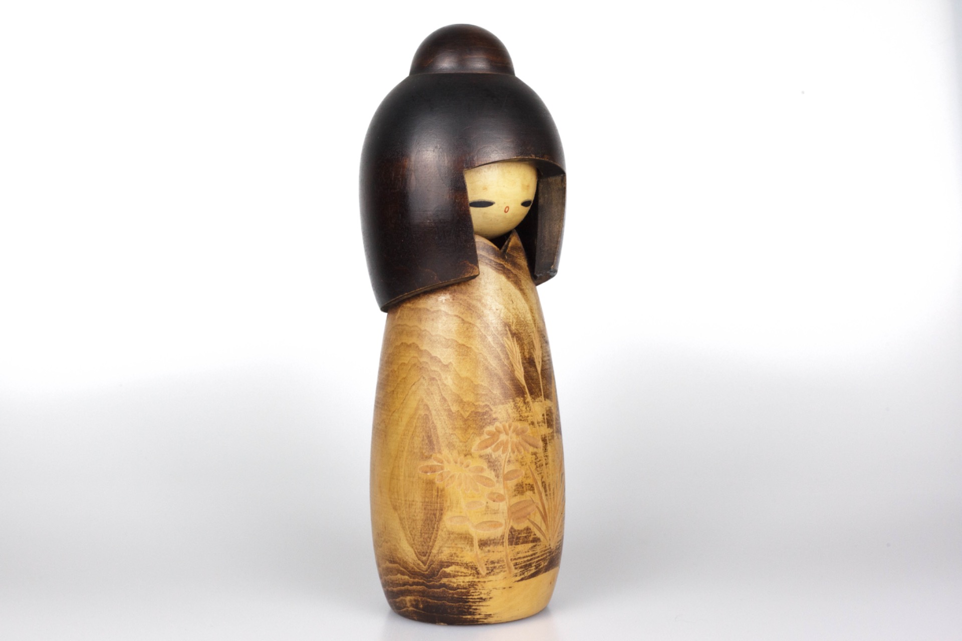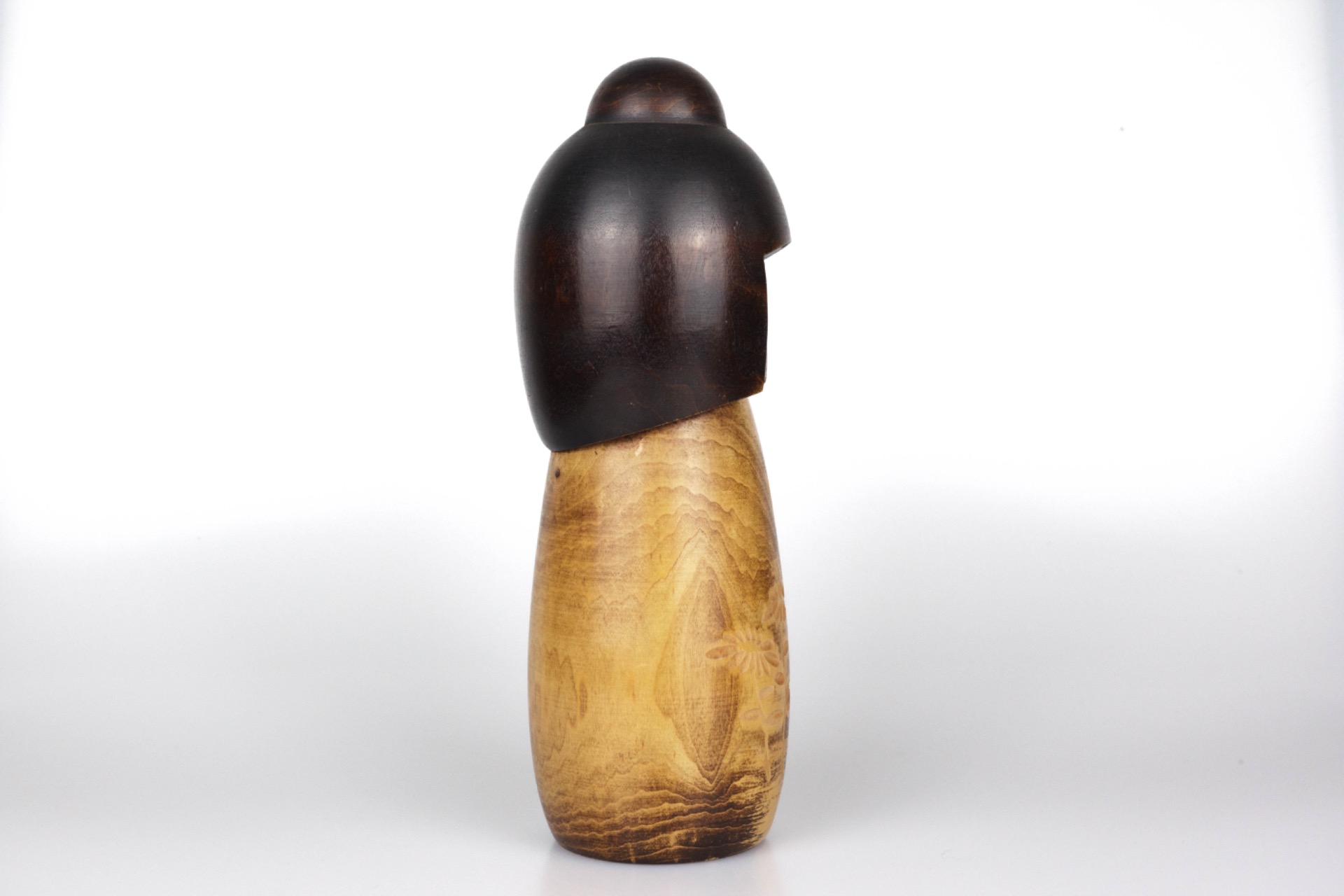 Een sfeervolle Sōsaku Kokeshi in natuurlijk hout met handgeëtste florale decoratie op de kimono.