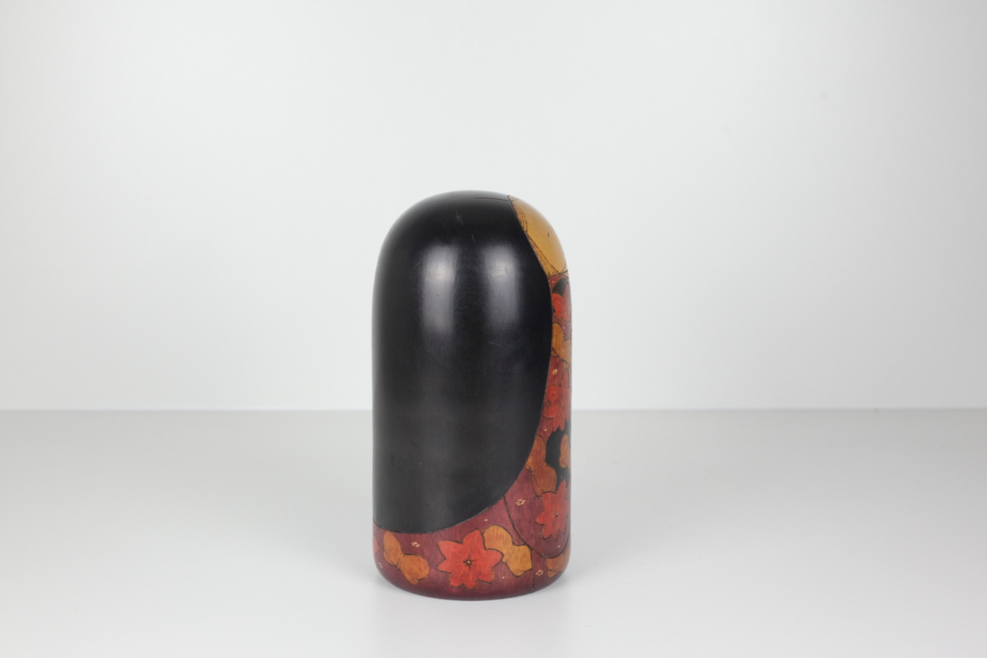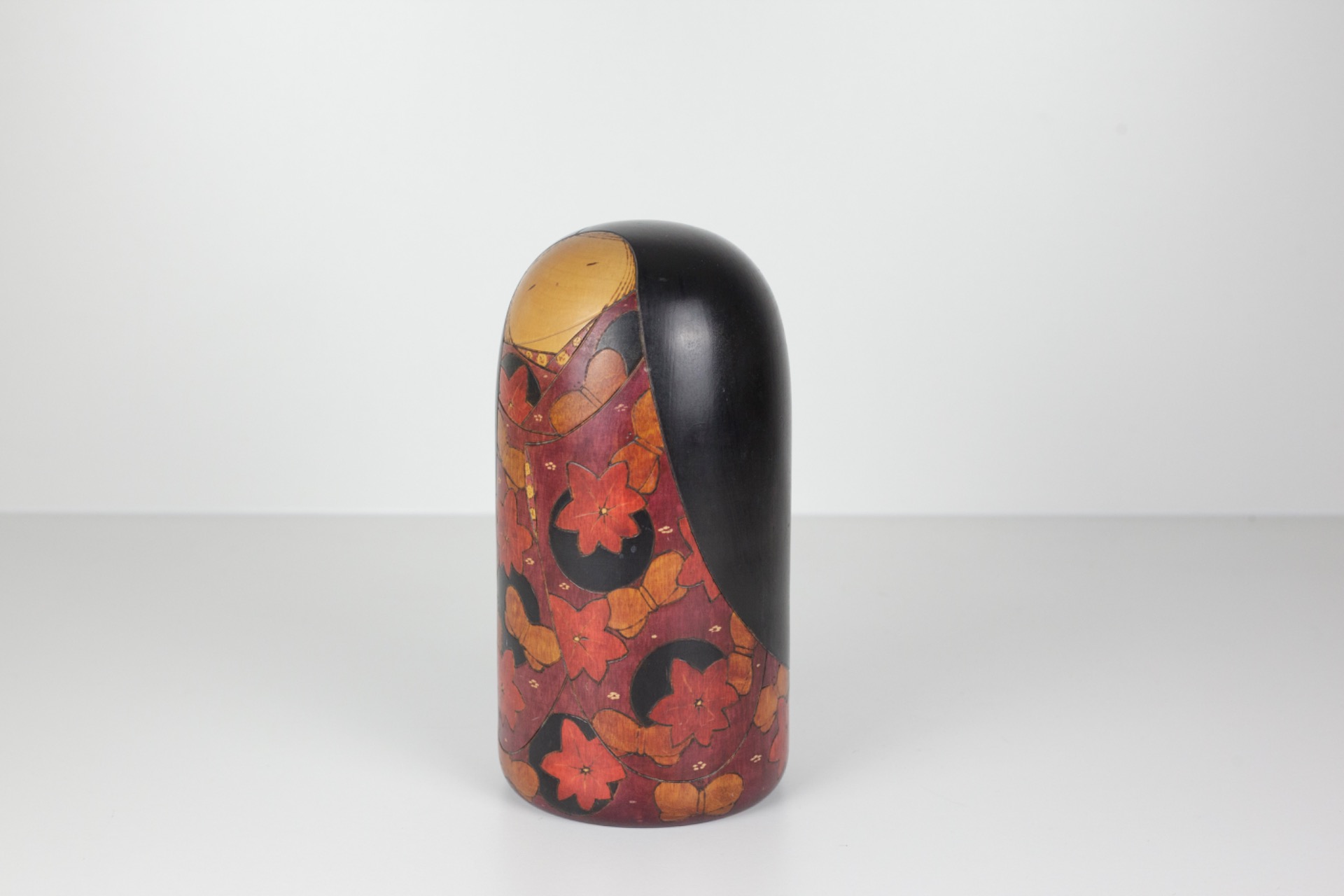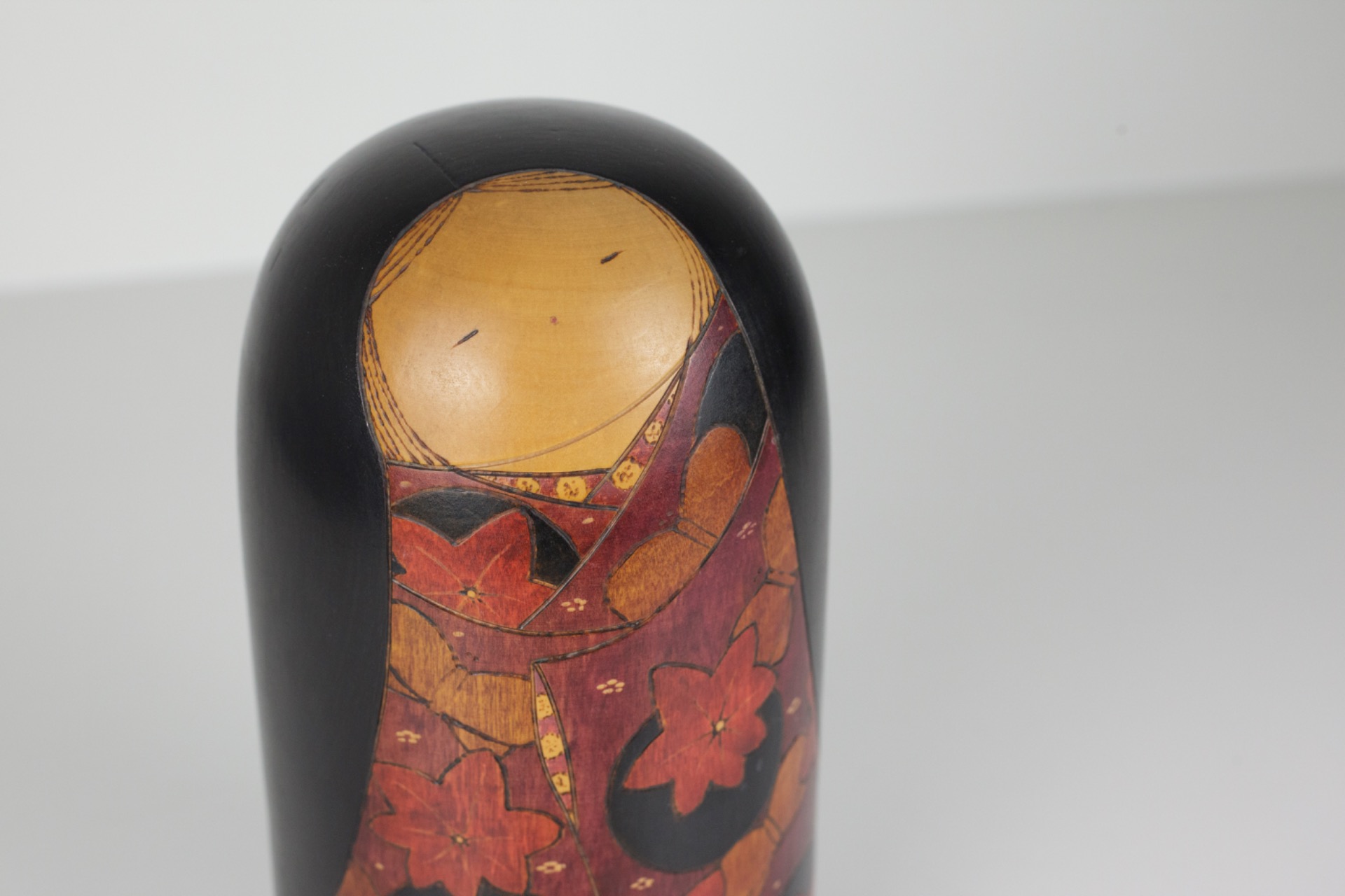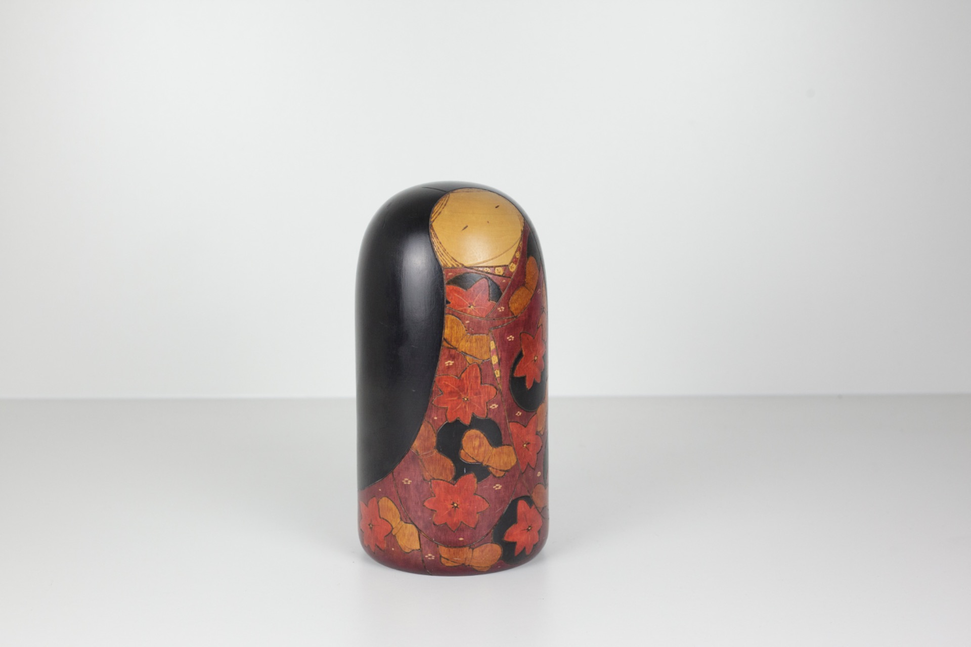 Het donkere kapsel houdt het geheel mooi in balans en geeft de Kokeshi een rustige, bijna statige uitstraling.