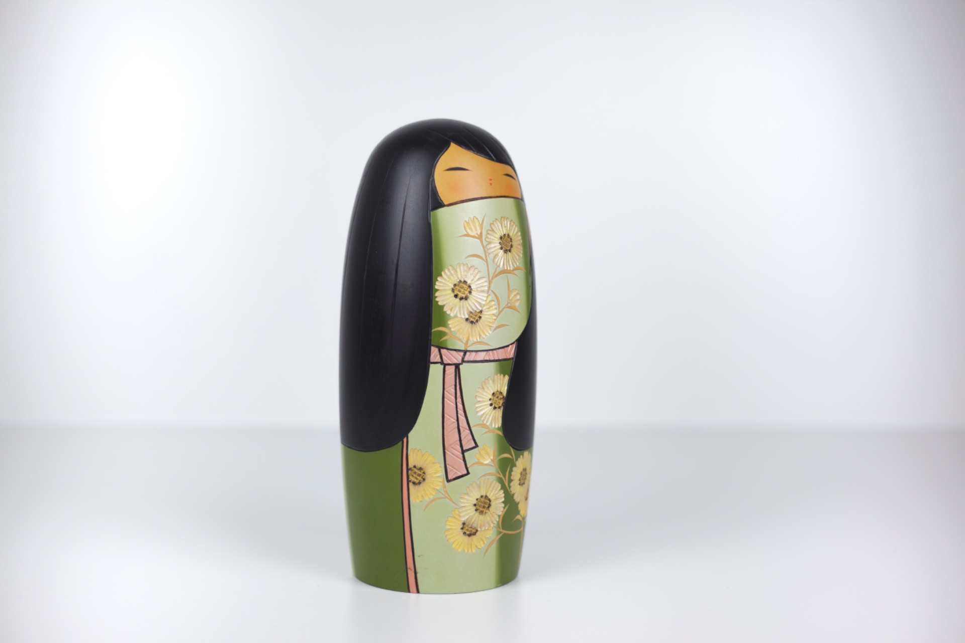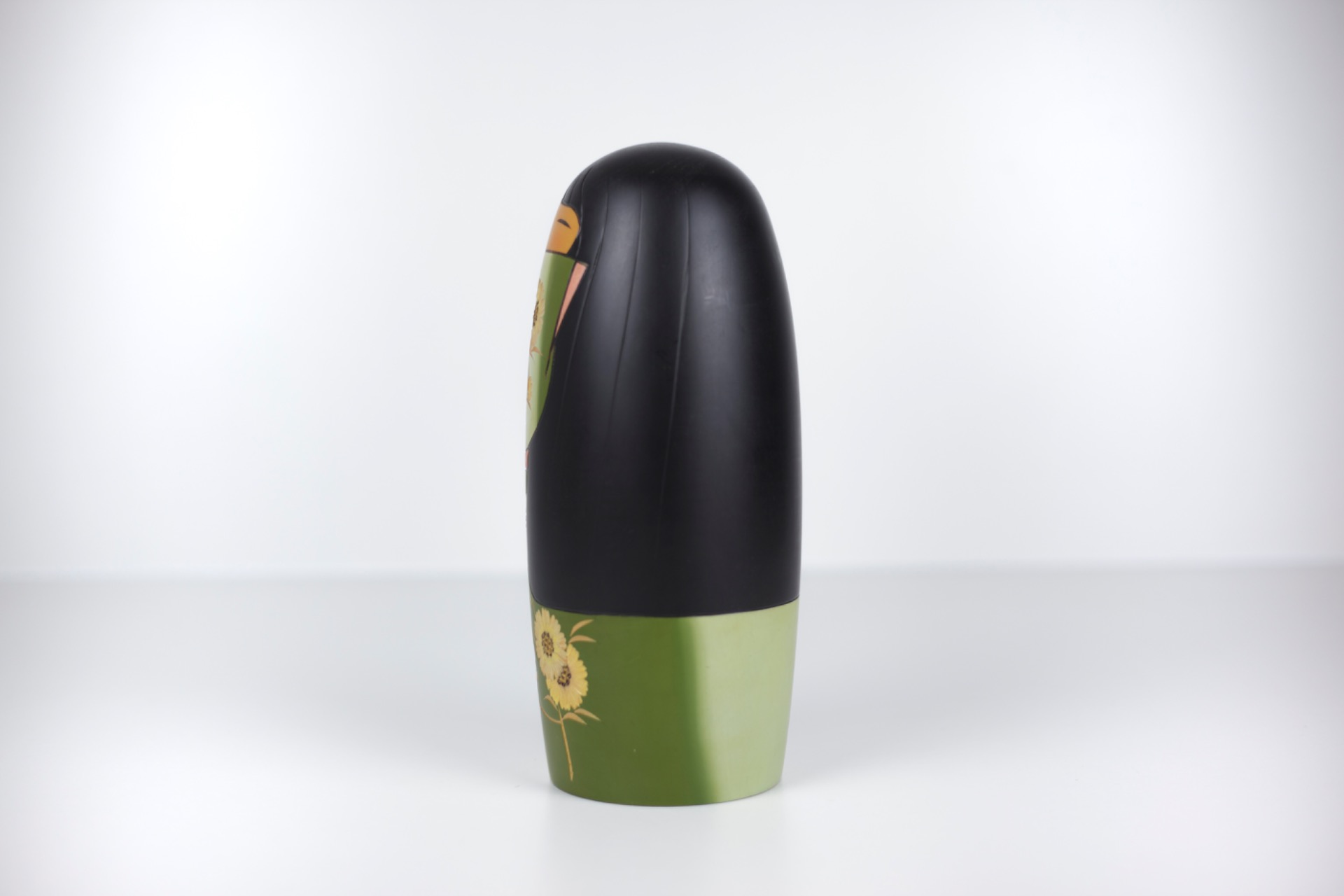 Deze creatieve Kokeshi van Kaoru Nozawa valt op door haar sterke verticaliteit en grafische uitstraling. De combinatie van zachte kleuren, krachtige lijnen en florale motieven geeft het beeld een eigen, herkenbaar karakter.