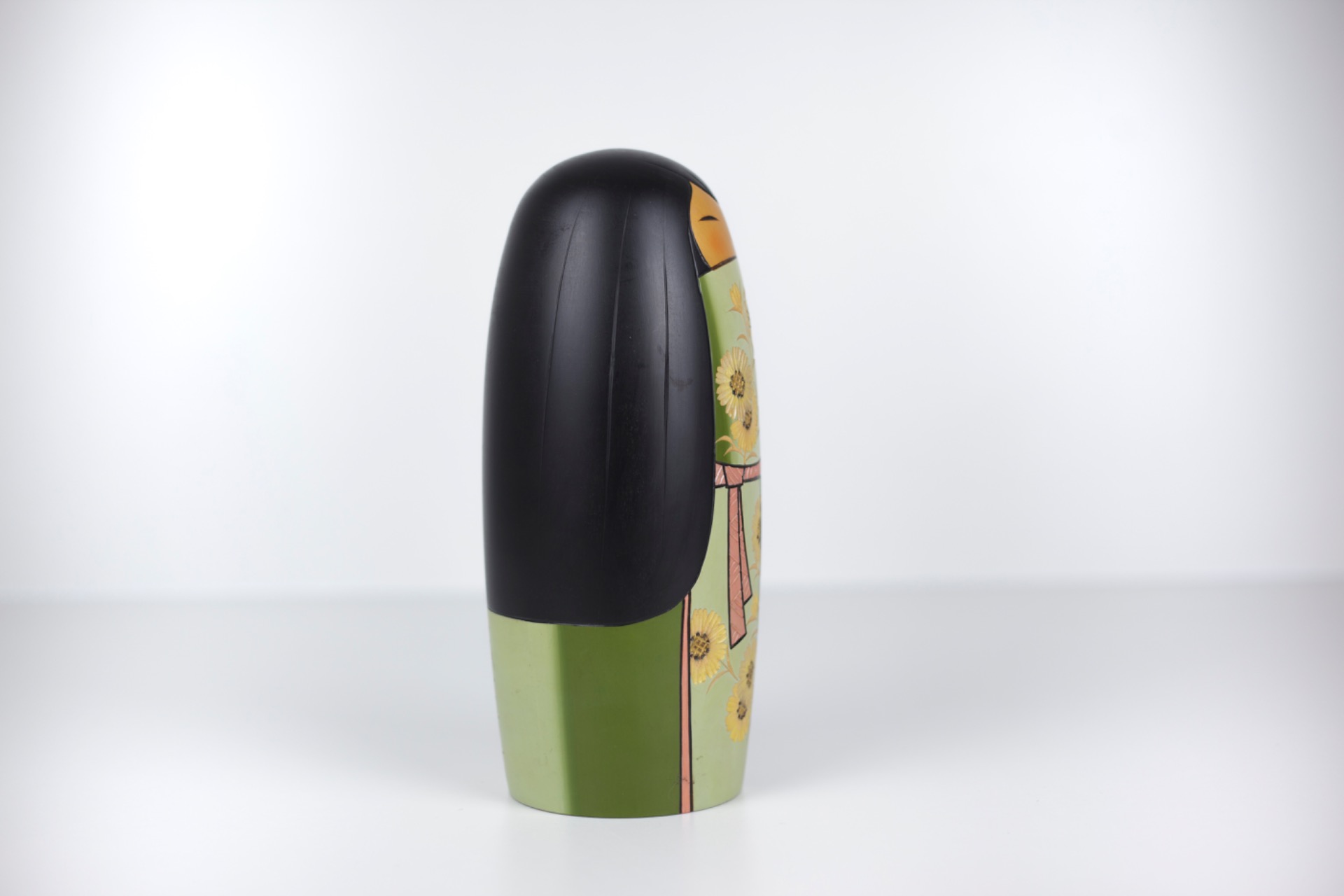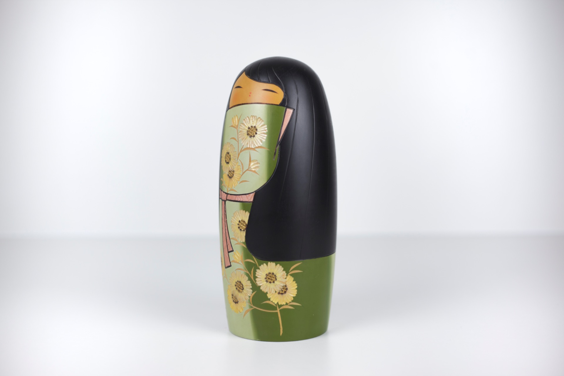 Deze Kokeshi werd vervaardigd door Kaoru Nozawa (野沢薫), een Japanse kunstenaar binnen de creatieve Kokeshi-traditie, een erkende sōsaku-kunstenaar met solide reputatie.. Haar werk wordt gekenmerkt door een verfijnde balans tussen vorm en decoratie, met een bijzondere aandacht voor zachte kleurharmonieën en florale motieven.