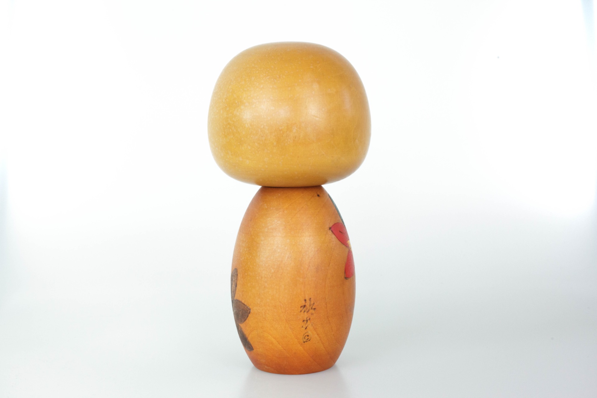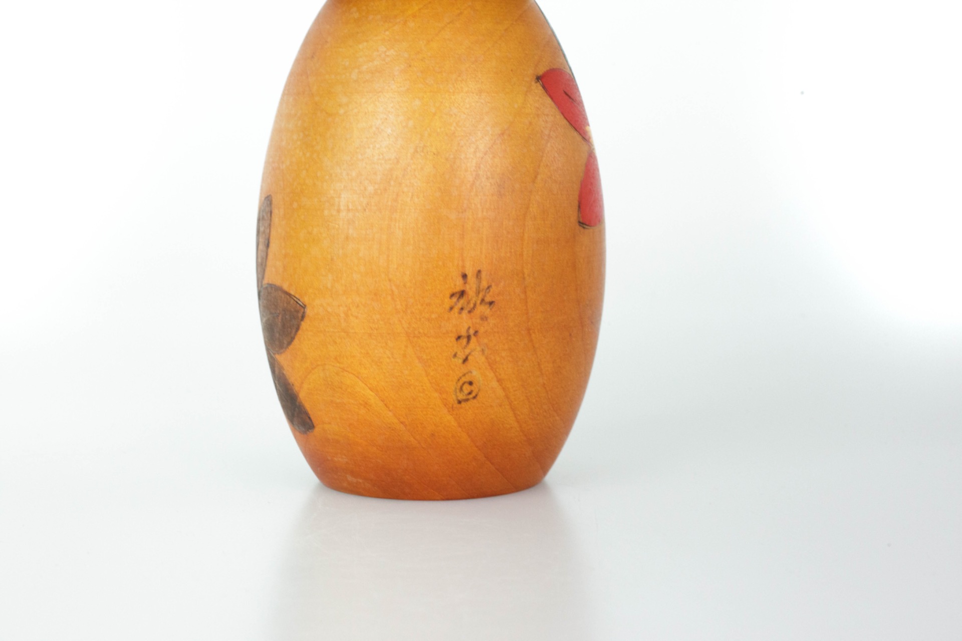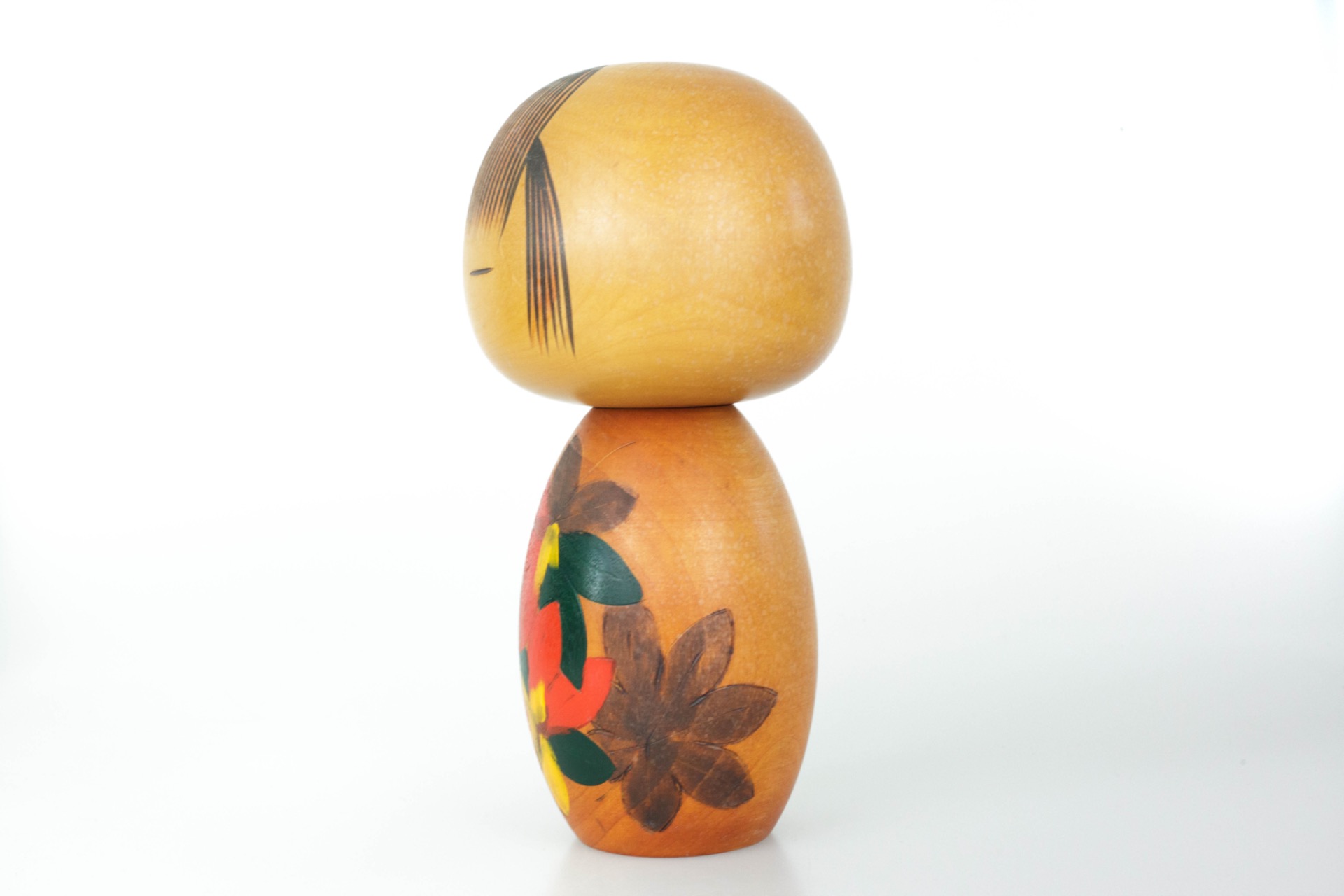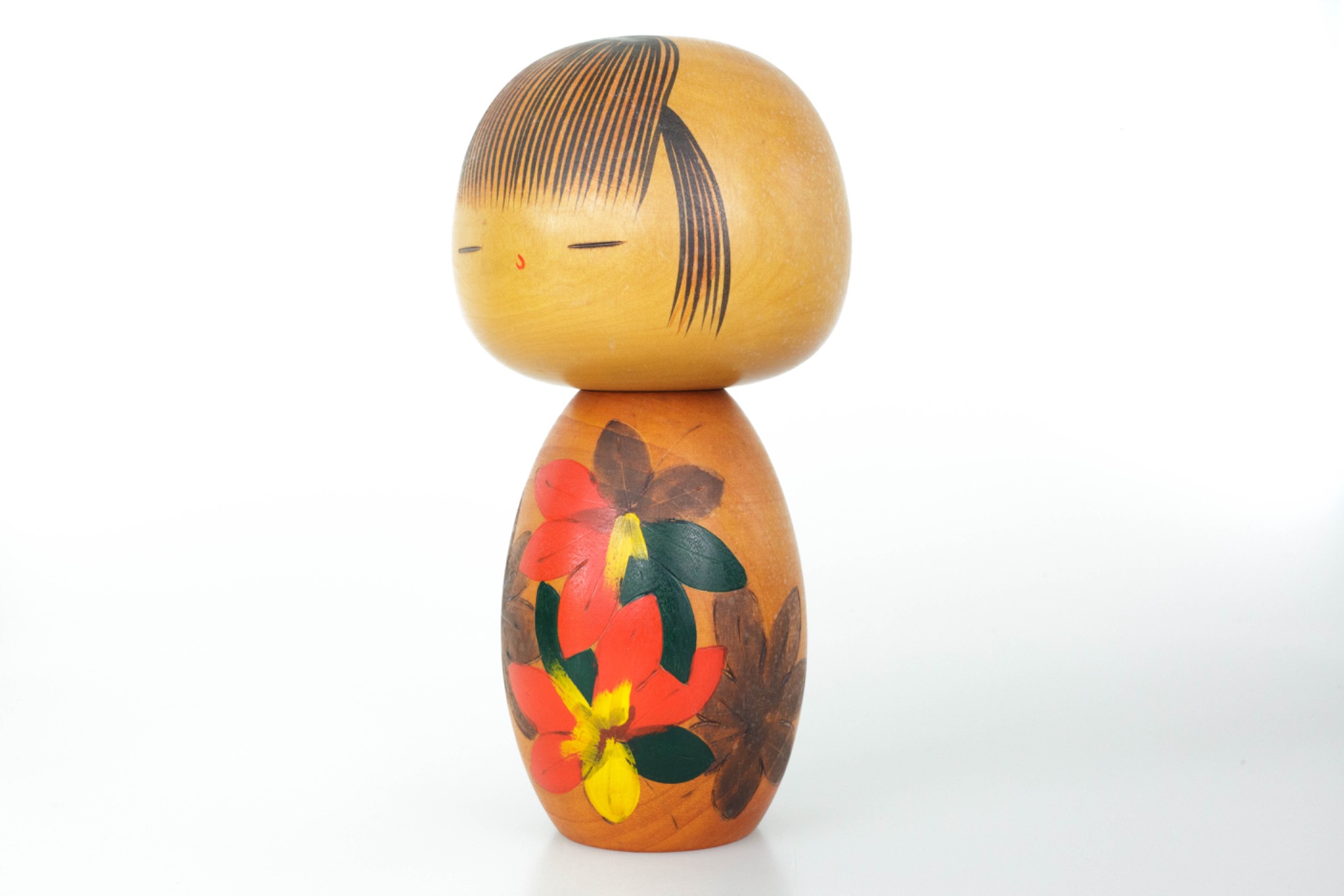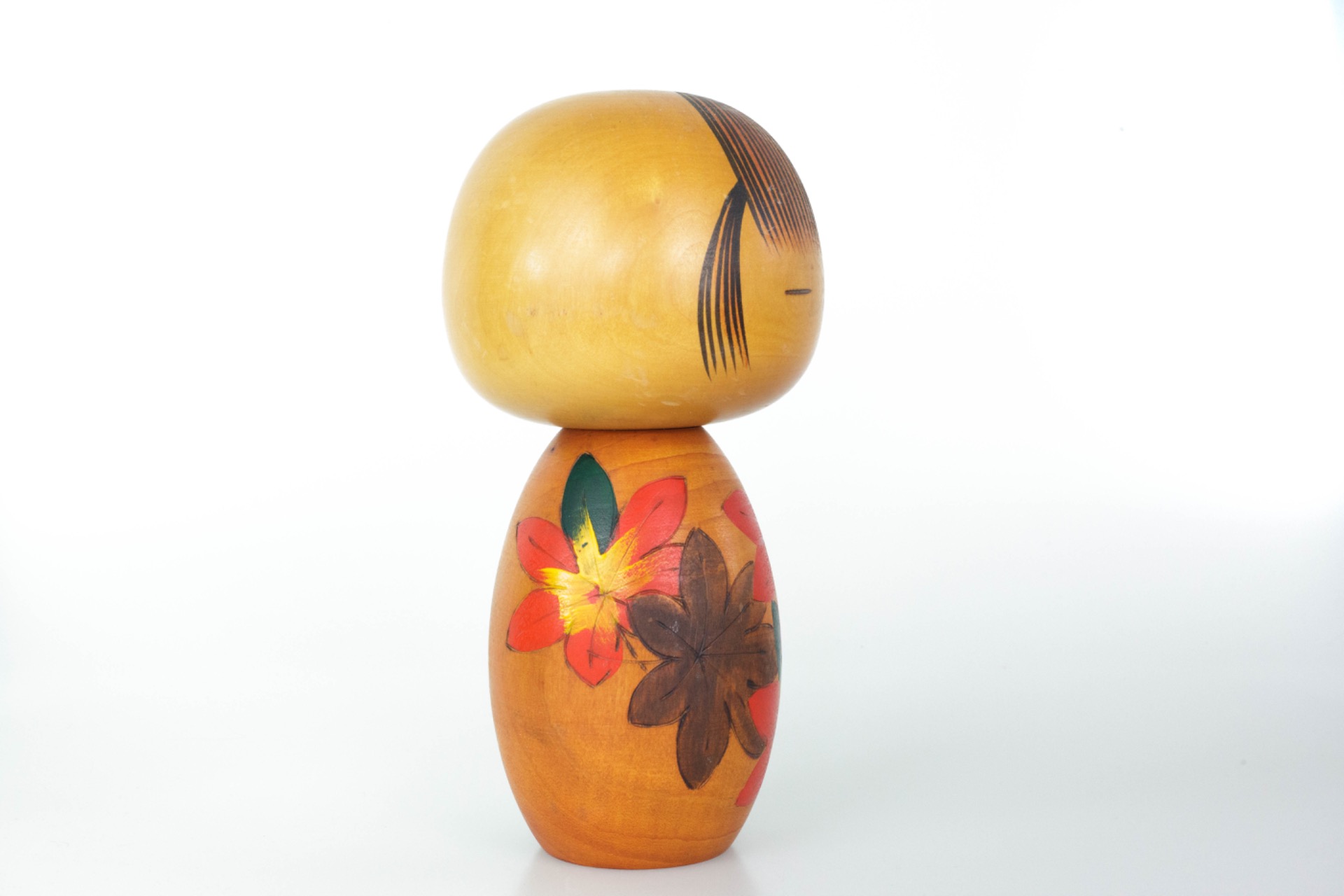 Deze charmante Kokeshi van Yuji Kawase (川瀬佑司) ademt eenvoud en harmonie uit. Het ronde hoofd met serene, gesloten ogen straalt een gevoel van rust uit, terwijl de felgekleurde bloemen op het lichaam een levendig contrast vormen. Het bloemenmotief – in rood, geel en groen – symboliseert vitaliteit en de cyclus van de seizoenen.