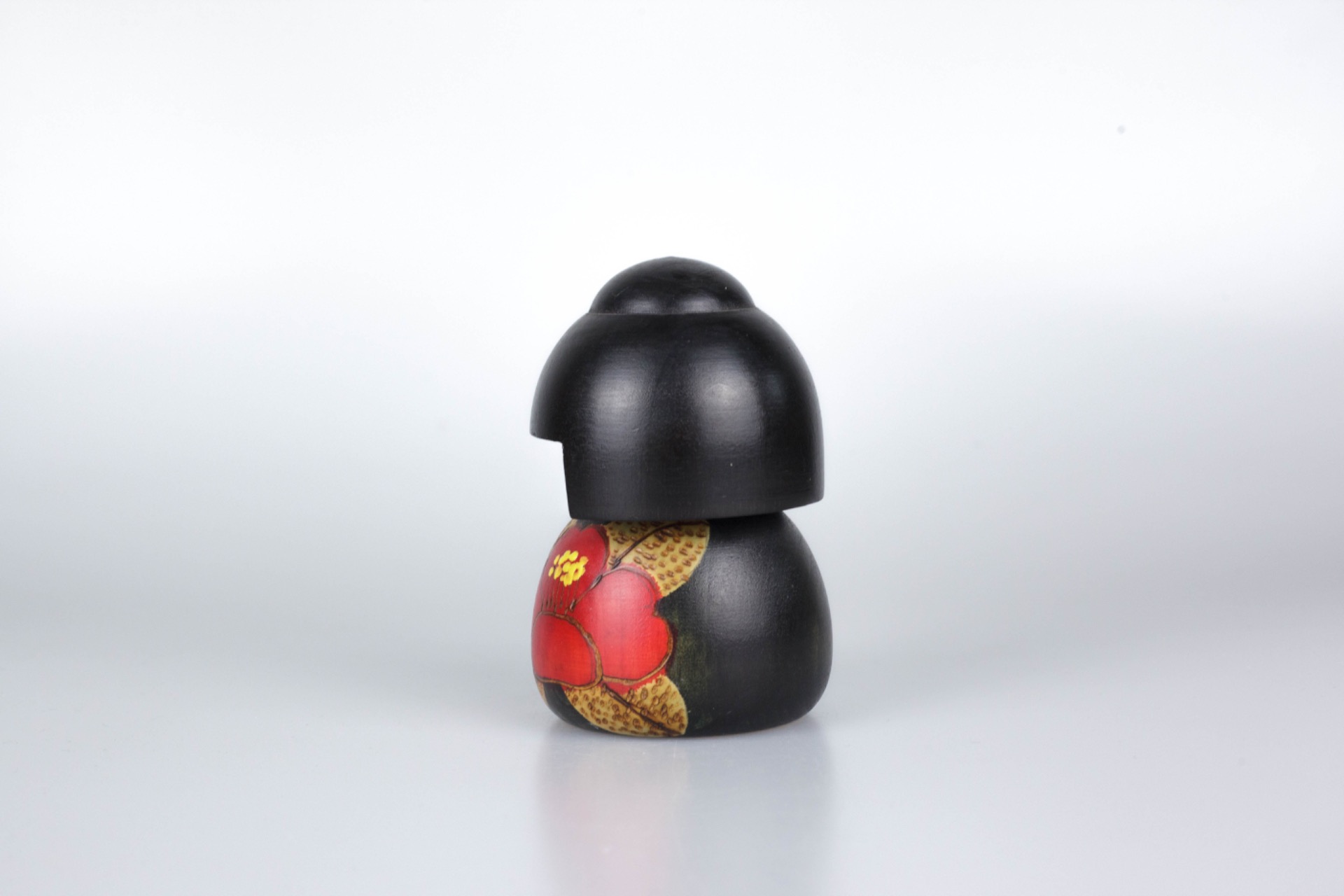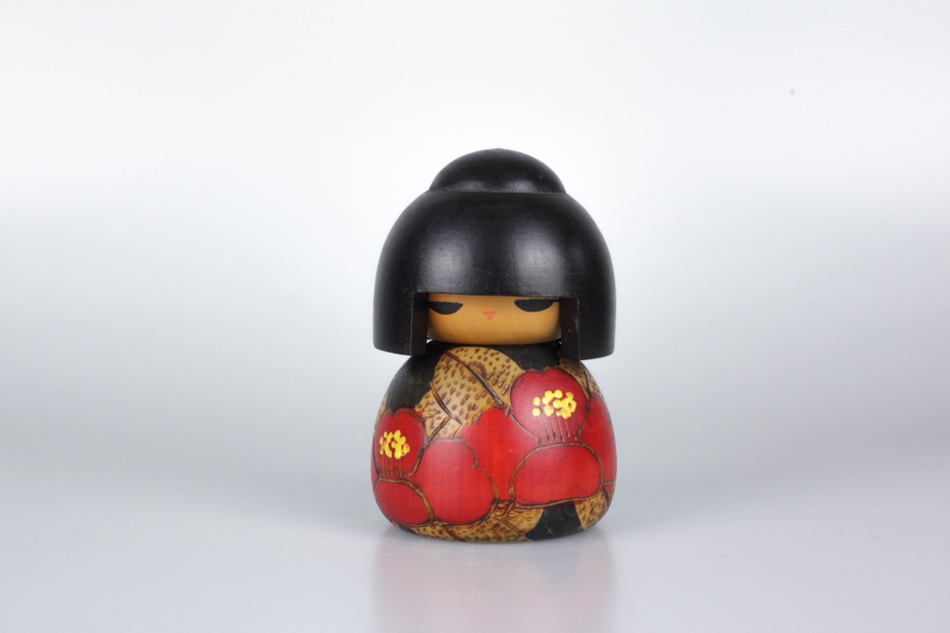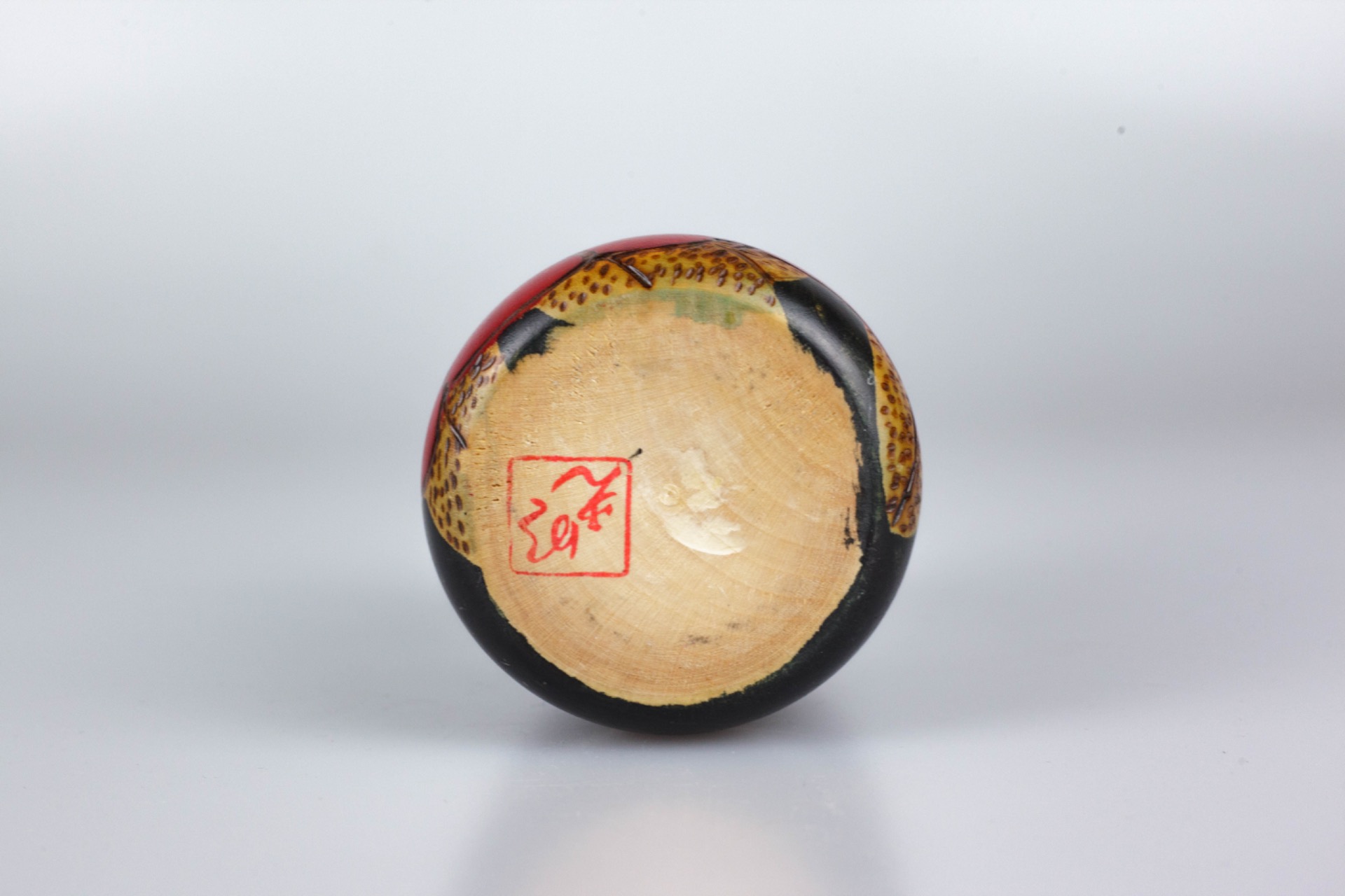 A delightful small Kokeshi by Akimitsu featuring a rich red kimono with floral motifs. Its compact form and warm tones make it a charming example of Japanese craftsmanship and everyday beauty.