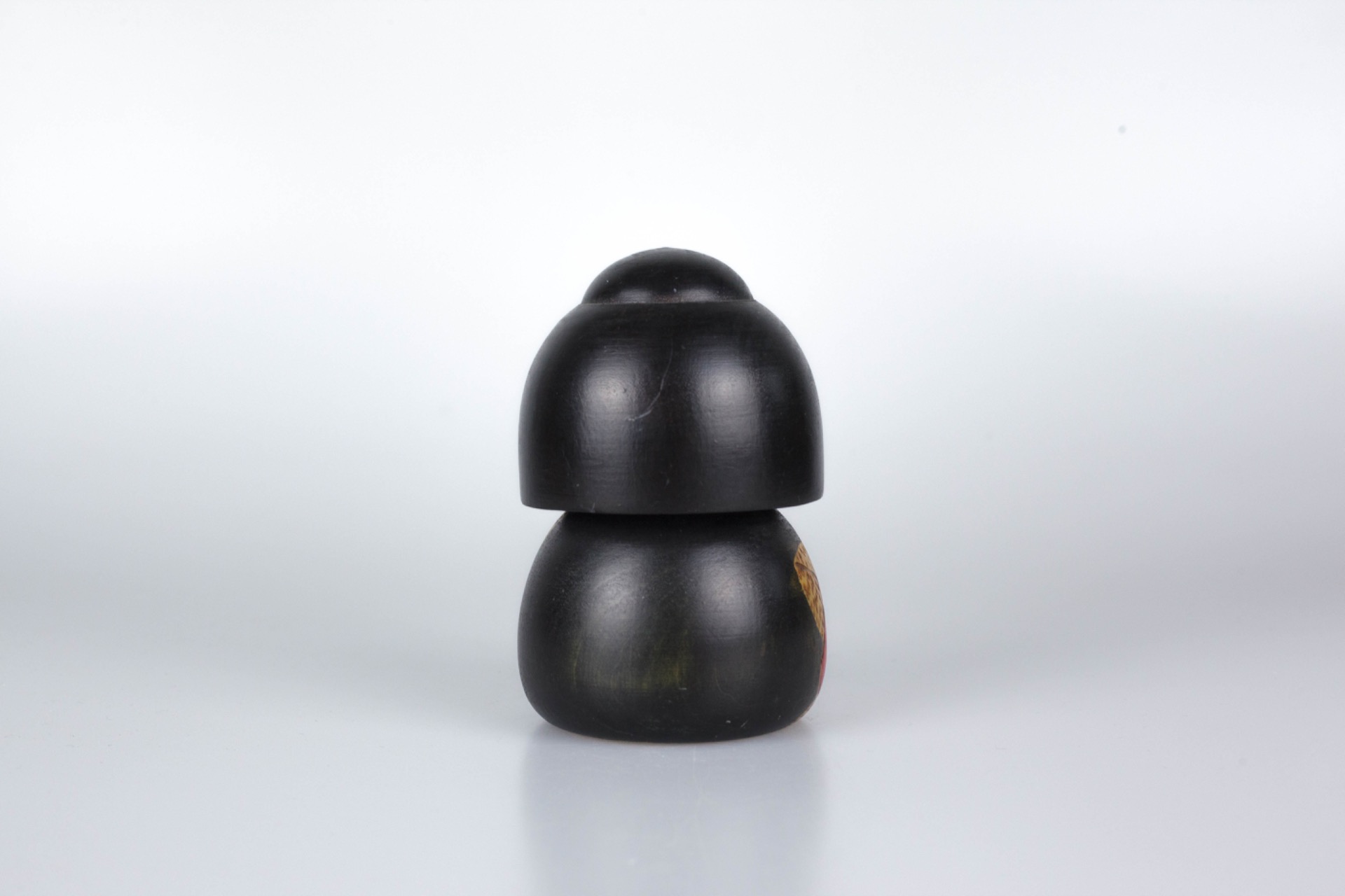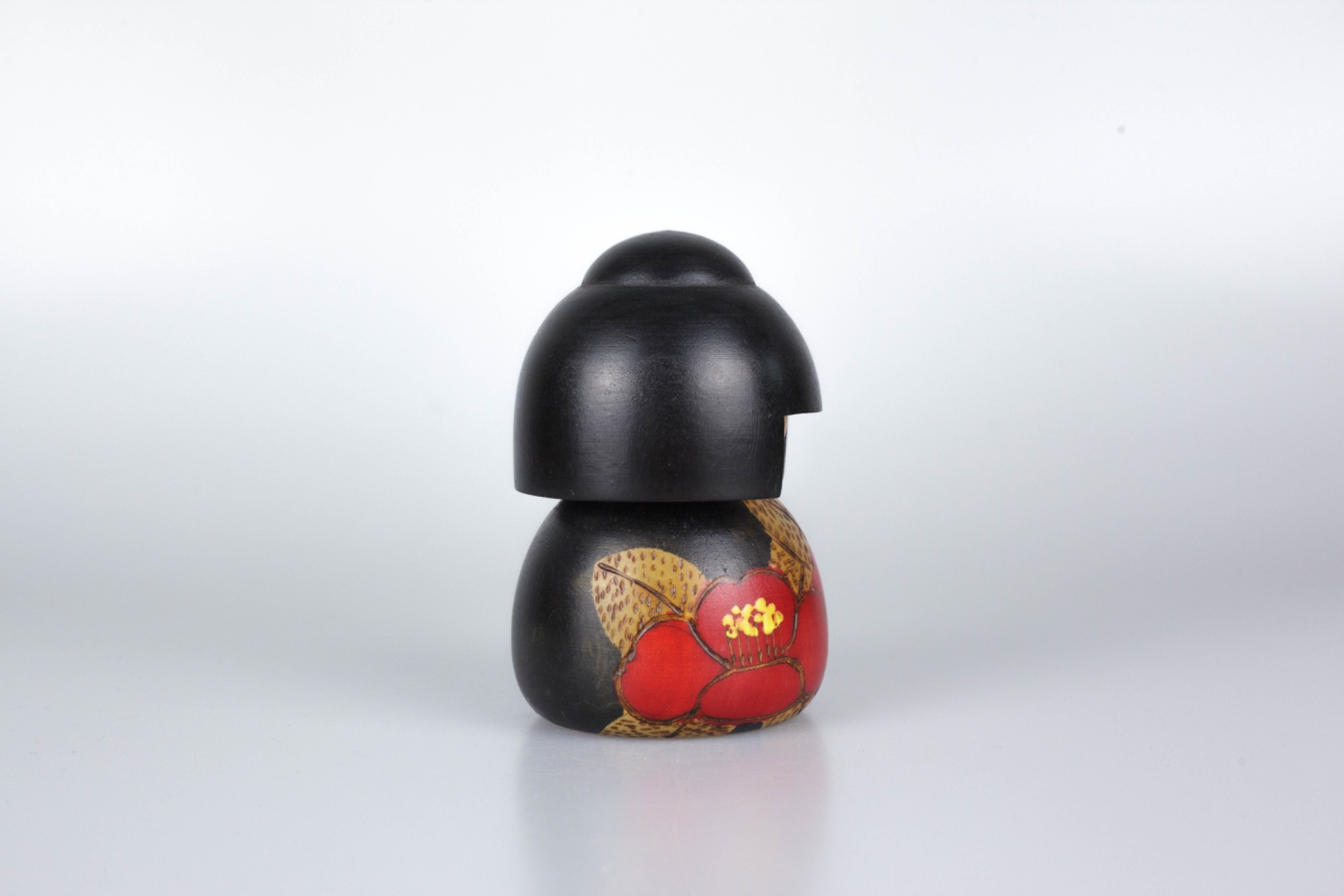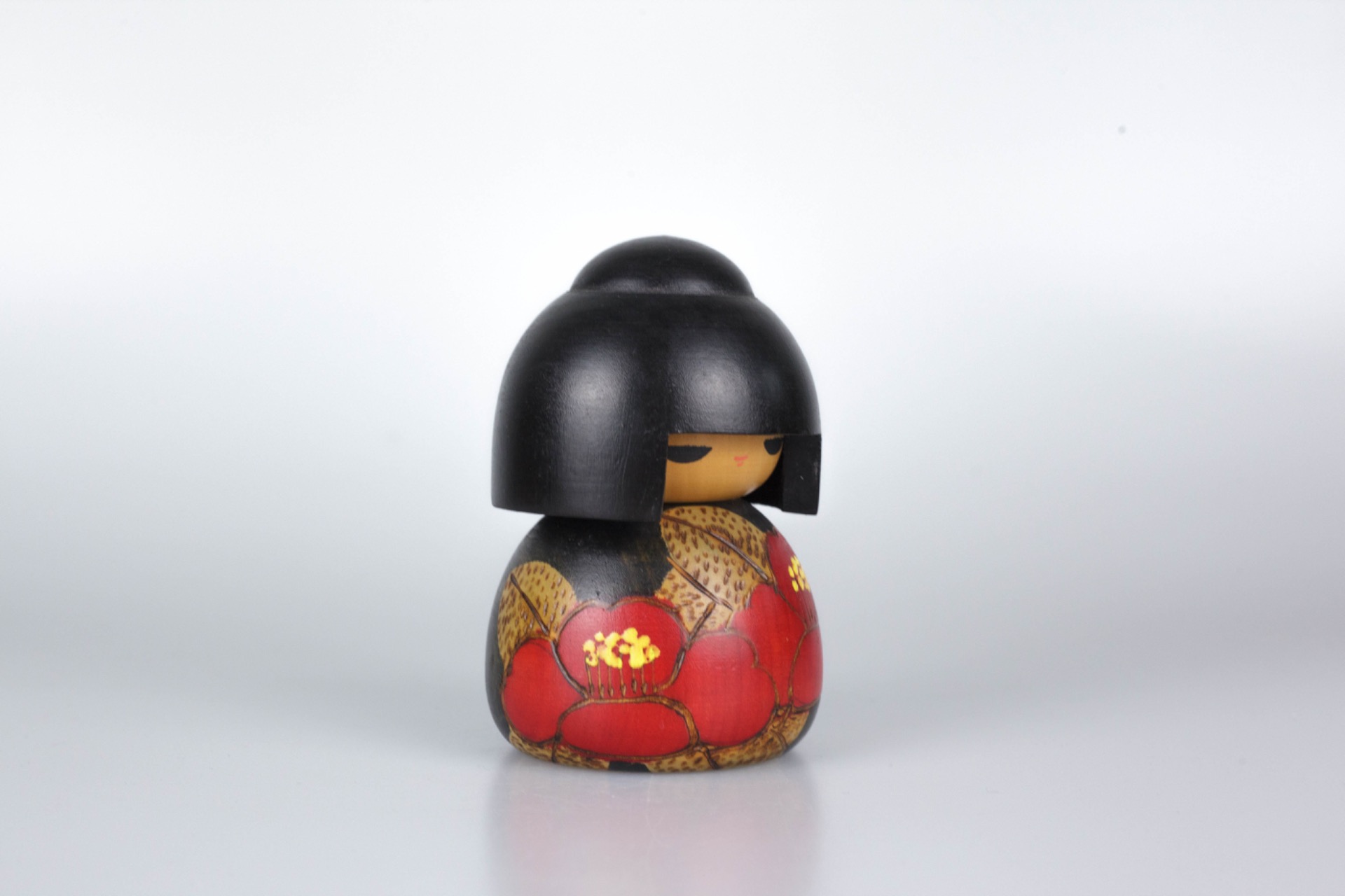 A delightful small Kokeshi by Akimitsu featuring a rich red kimono with floral motifs. Its compact form and warm tones make it a charming example of Japanese craftsmanship and everyday beauty.