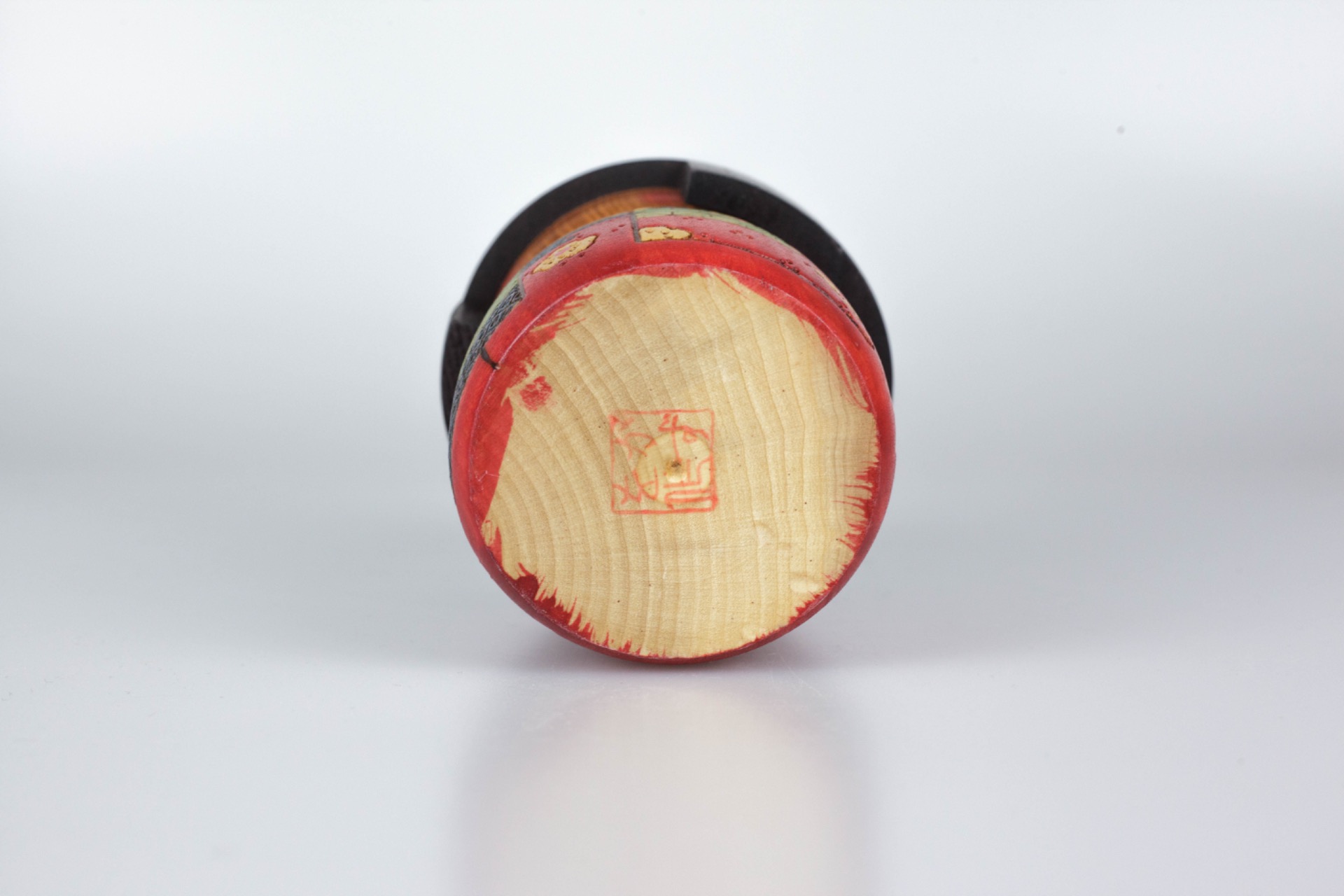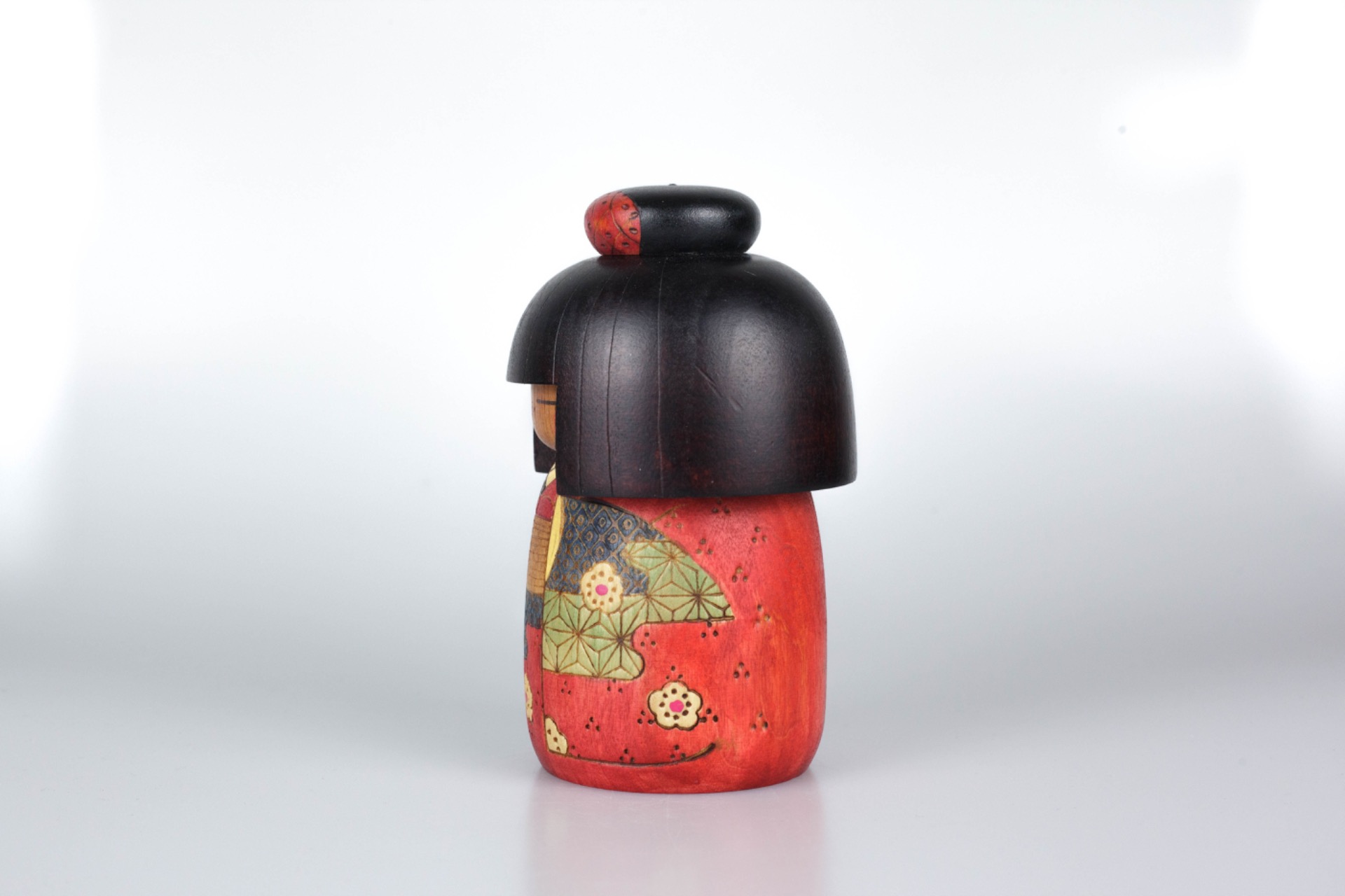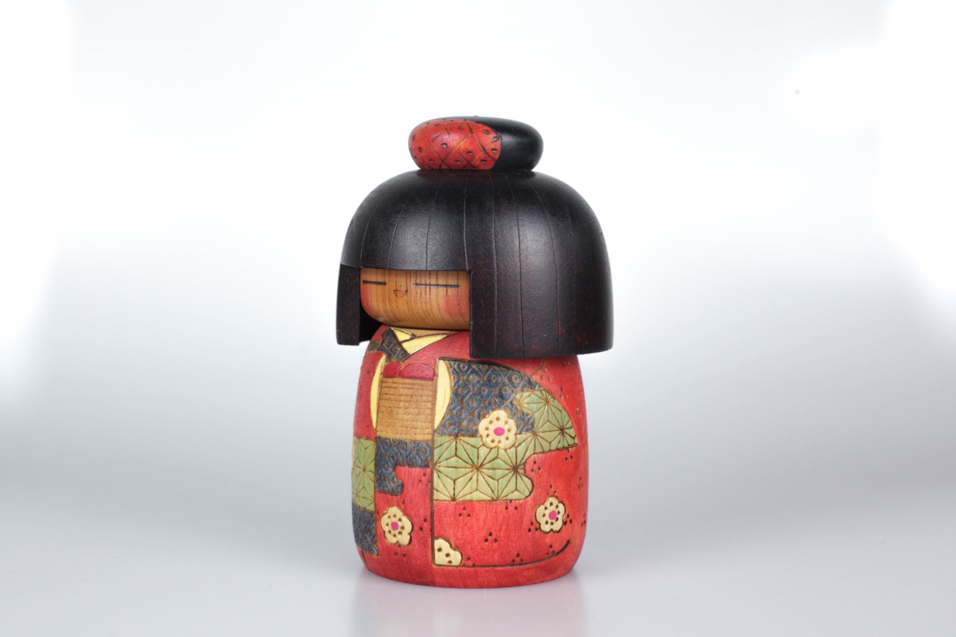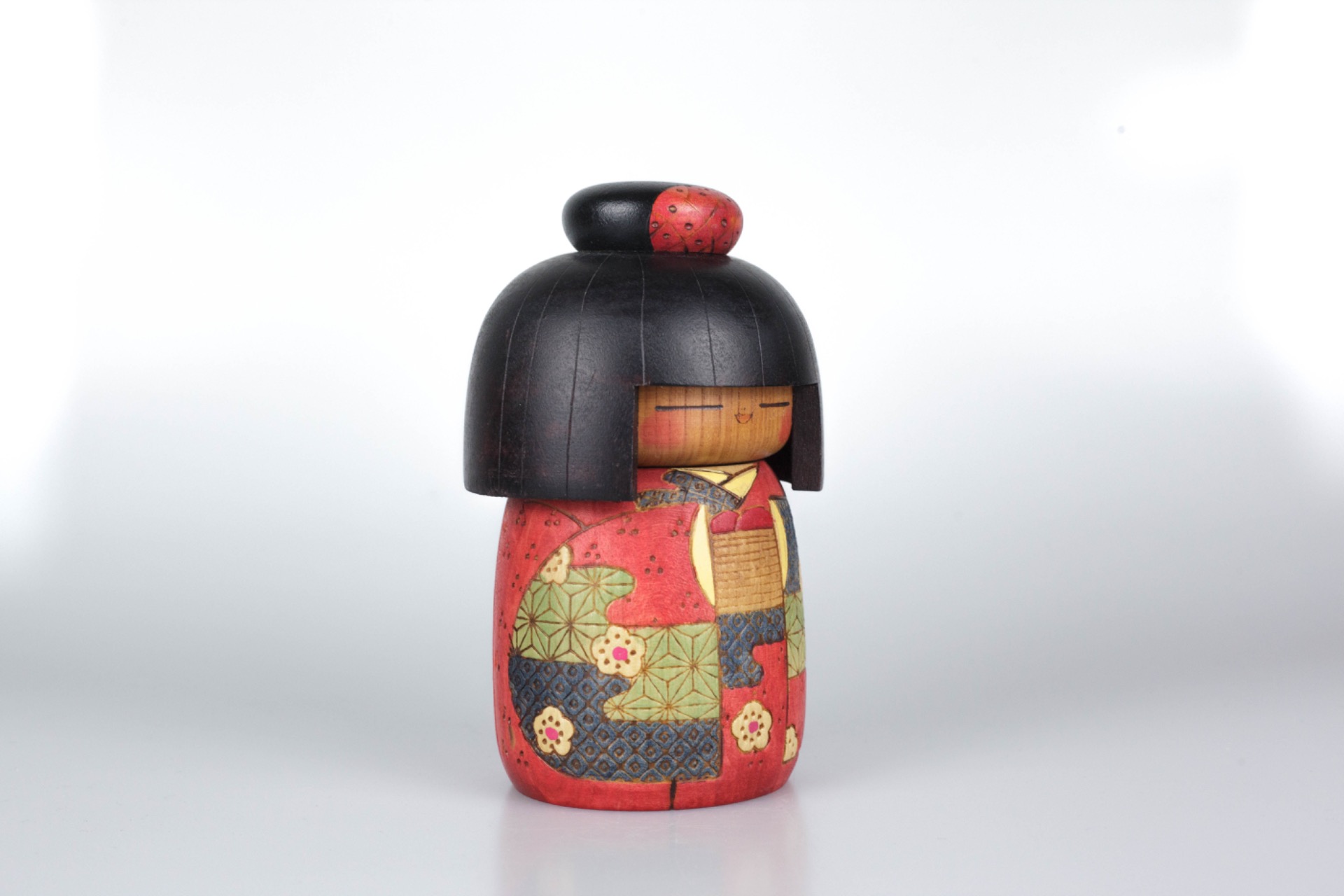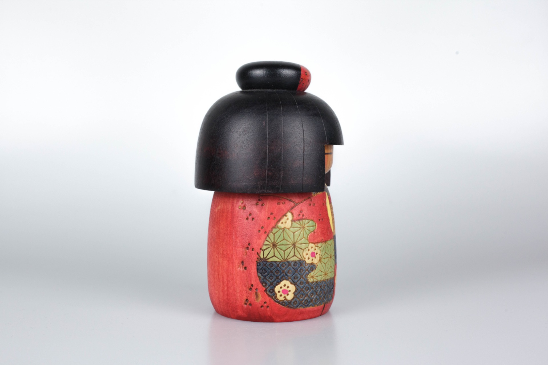 A vivid and intricately detailed Kokeshi by Kazuo Takamizawa. The colorful patchwork kimono and serene expression embody the artistry and joy of mid-century Japanese craftsmanship — a small yet striking collector's piece.
