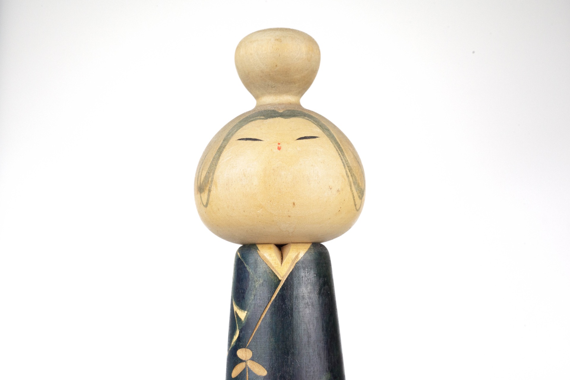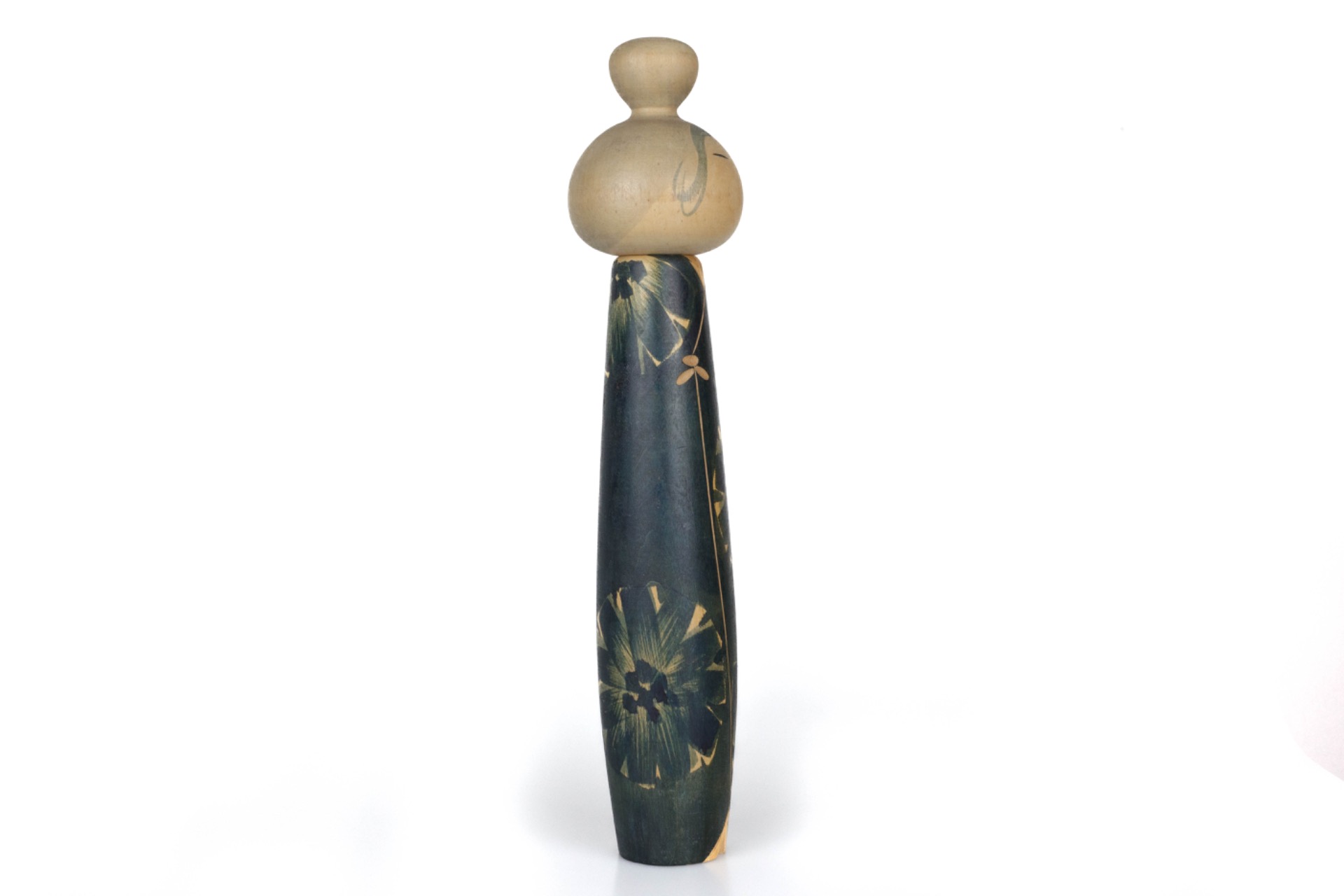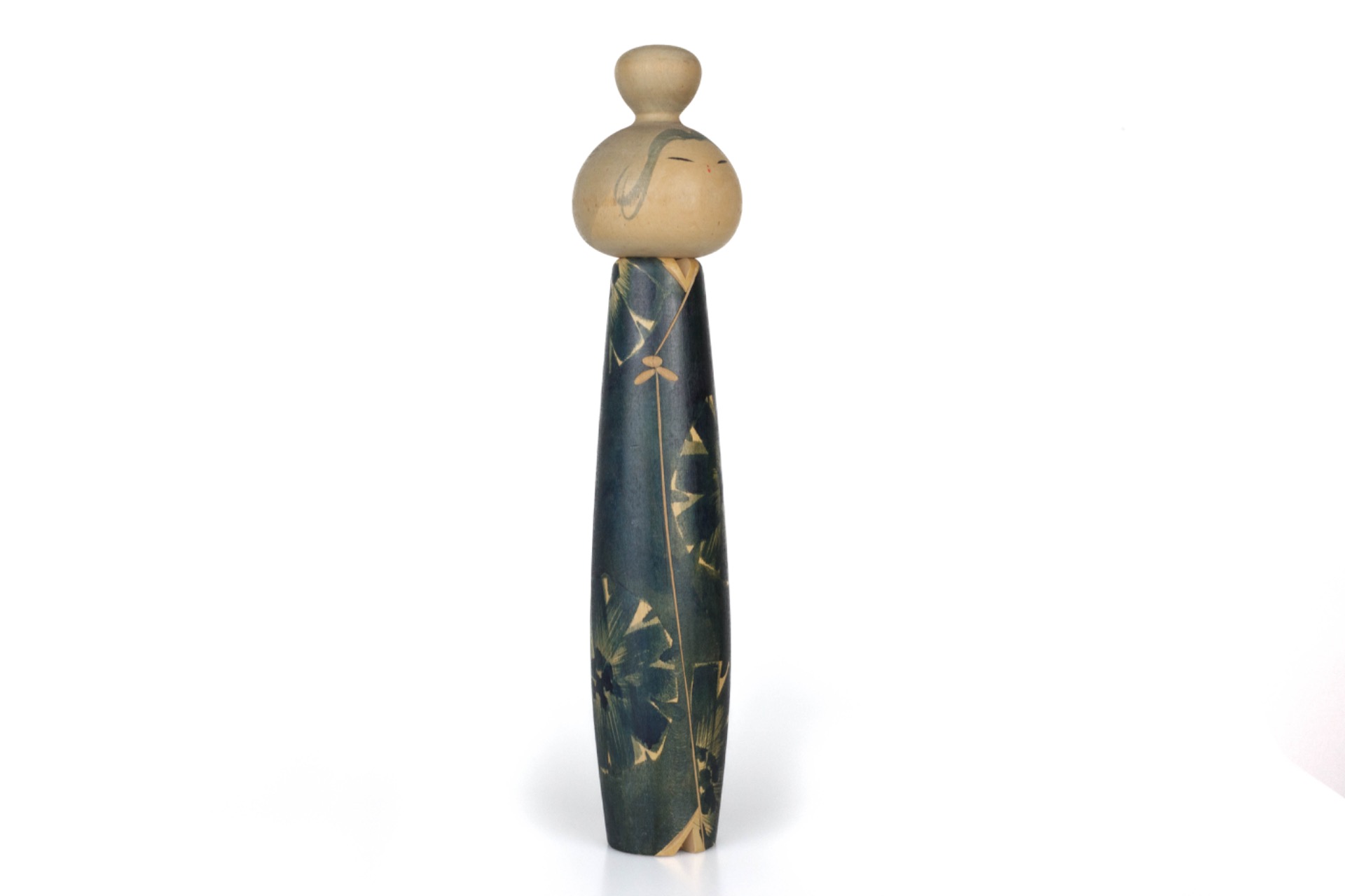 Creative Kokeshi "Kiku" (菊) by Kuribayashi Isetsu (栗林一節) with a serene expression and subtle brushwork.
