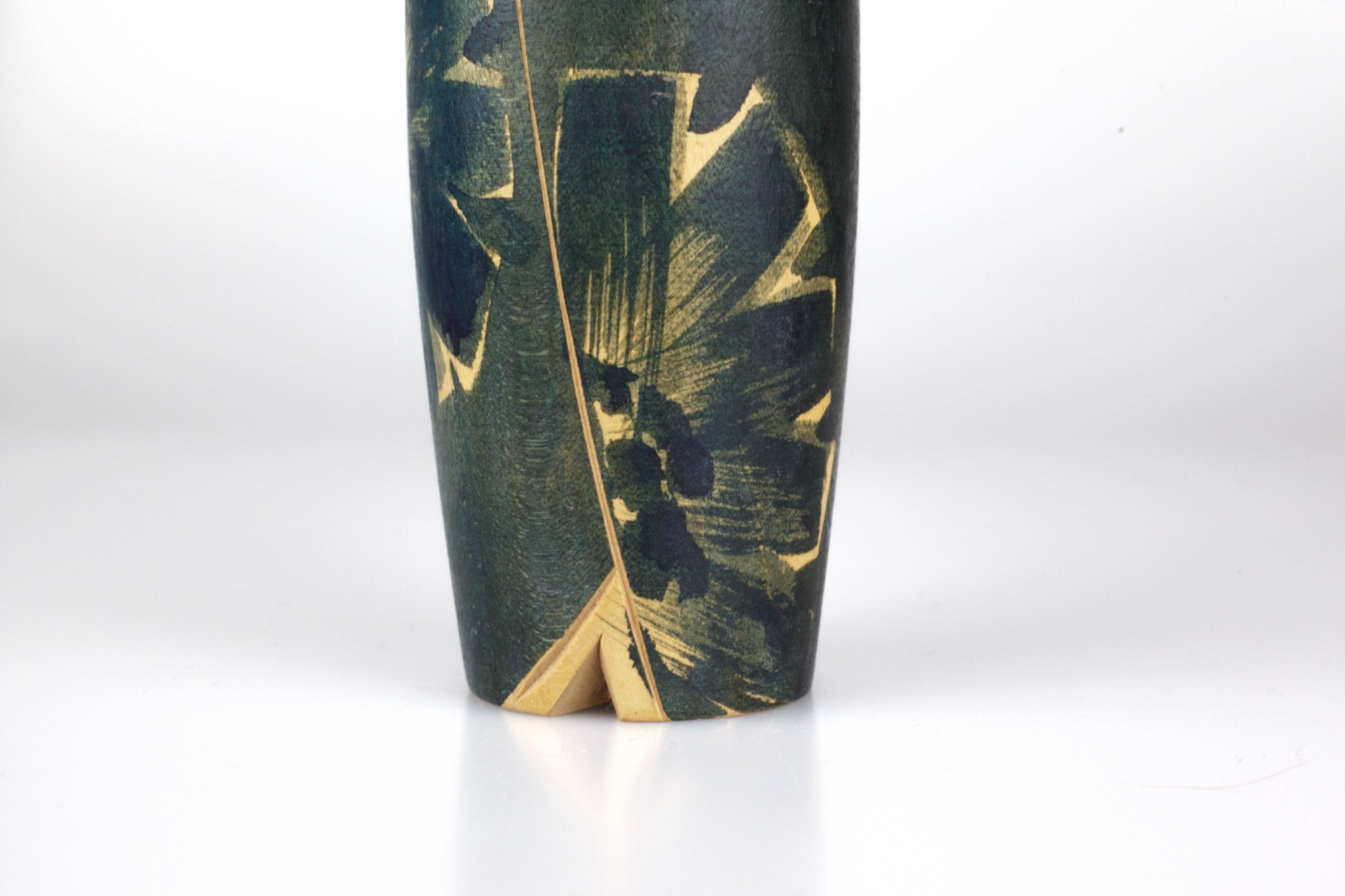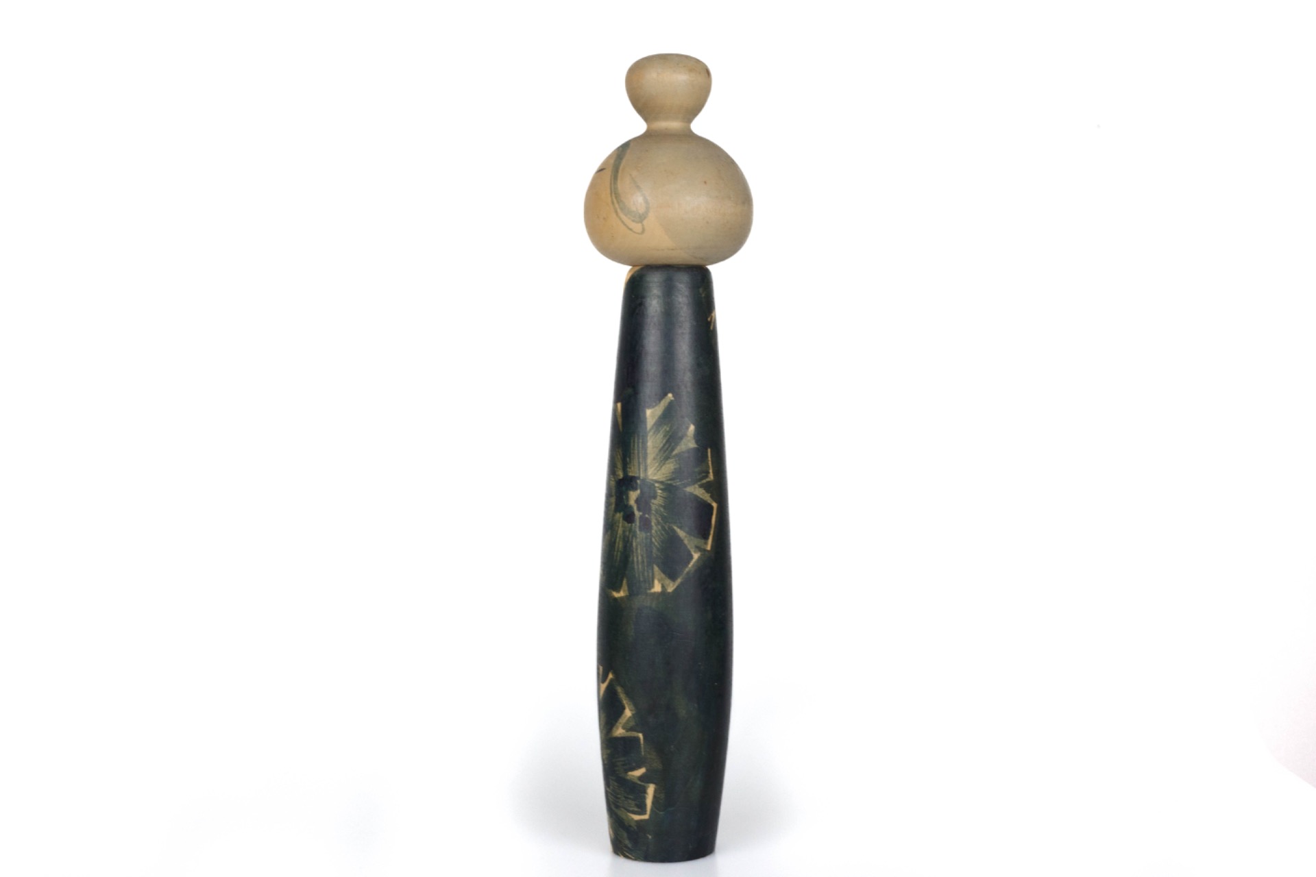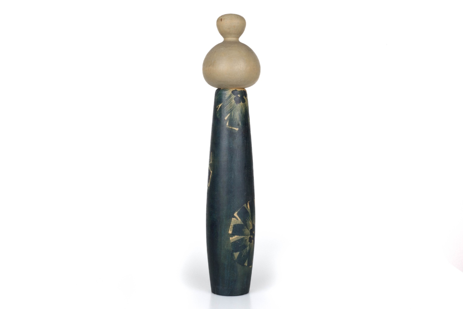 Creative Kokeshi "Kiku" (菊) by Kuribayashi Isetsu (栗林一節) with a serene expression and subtle brushwork.