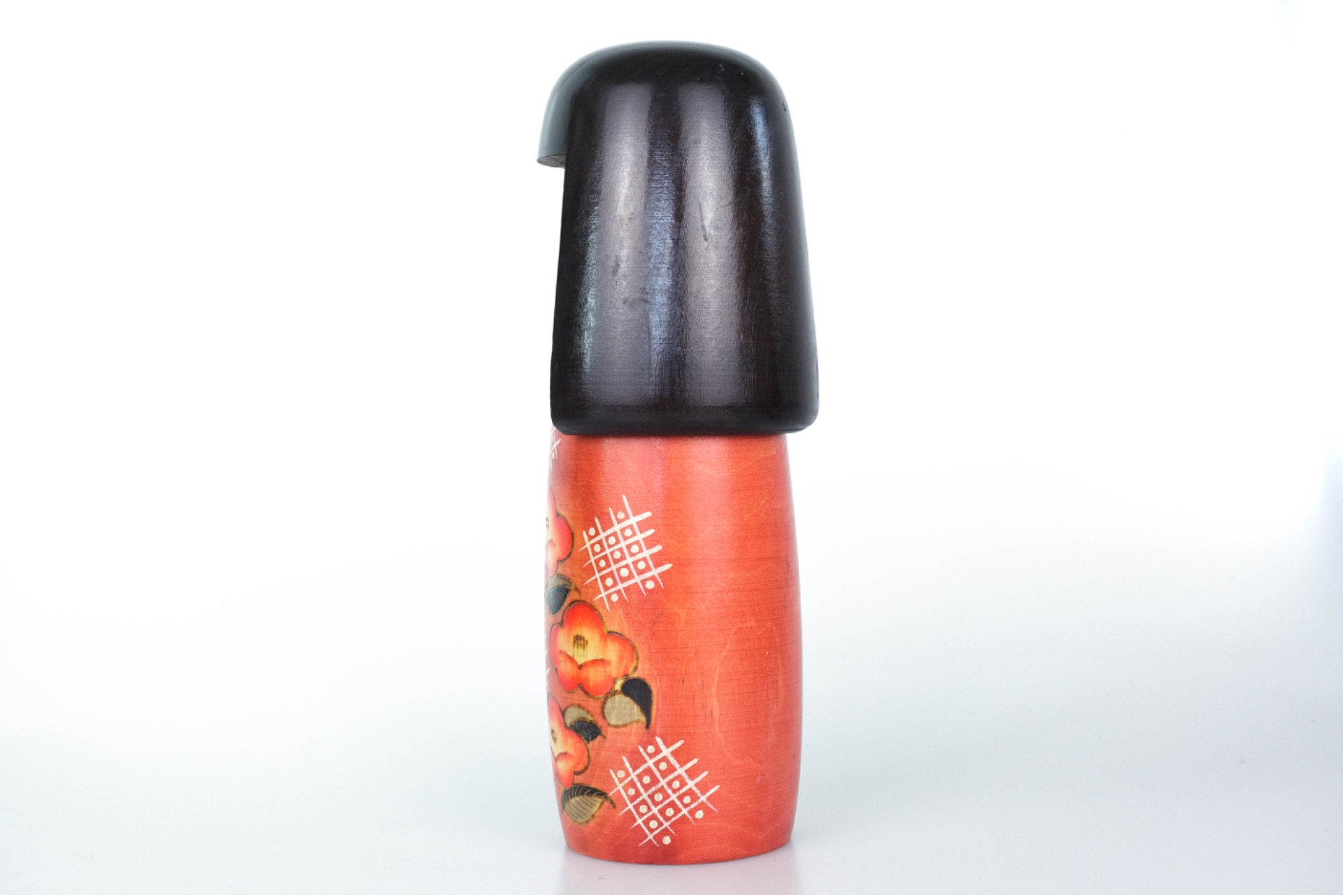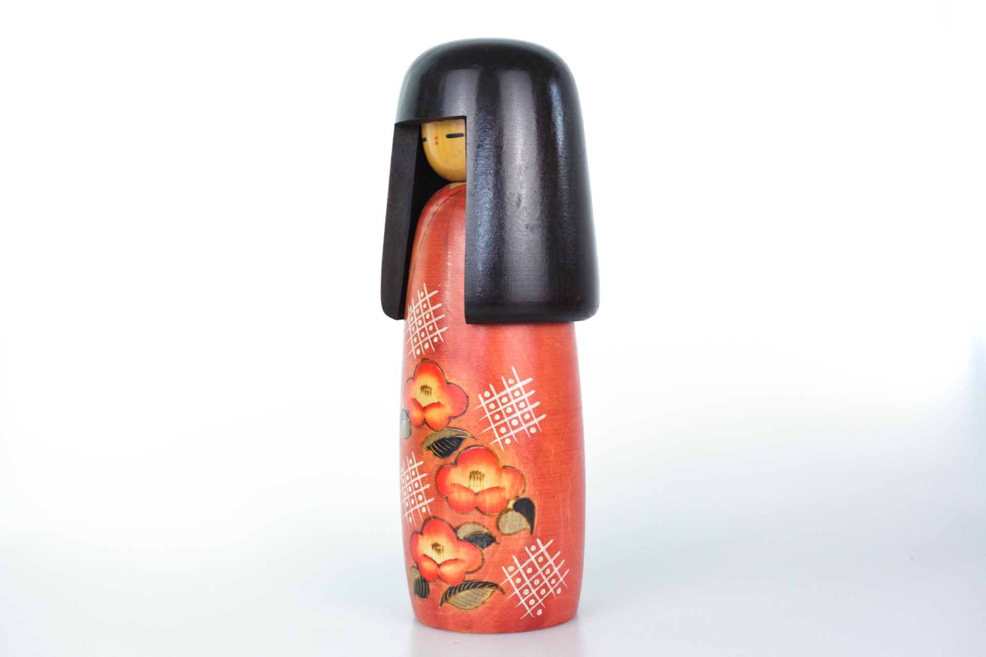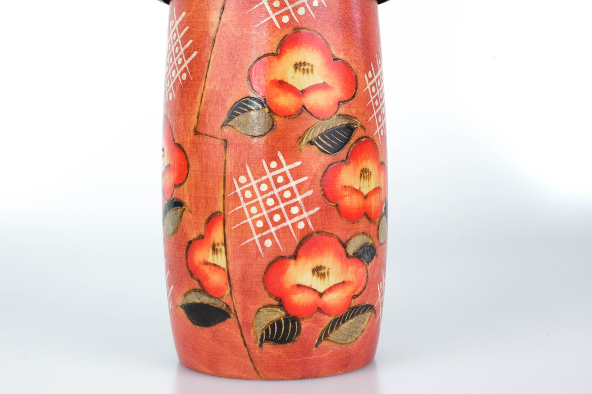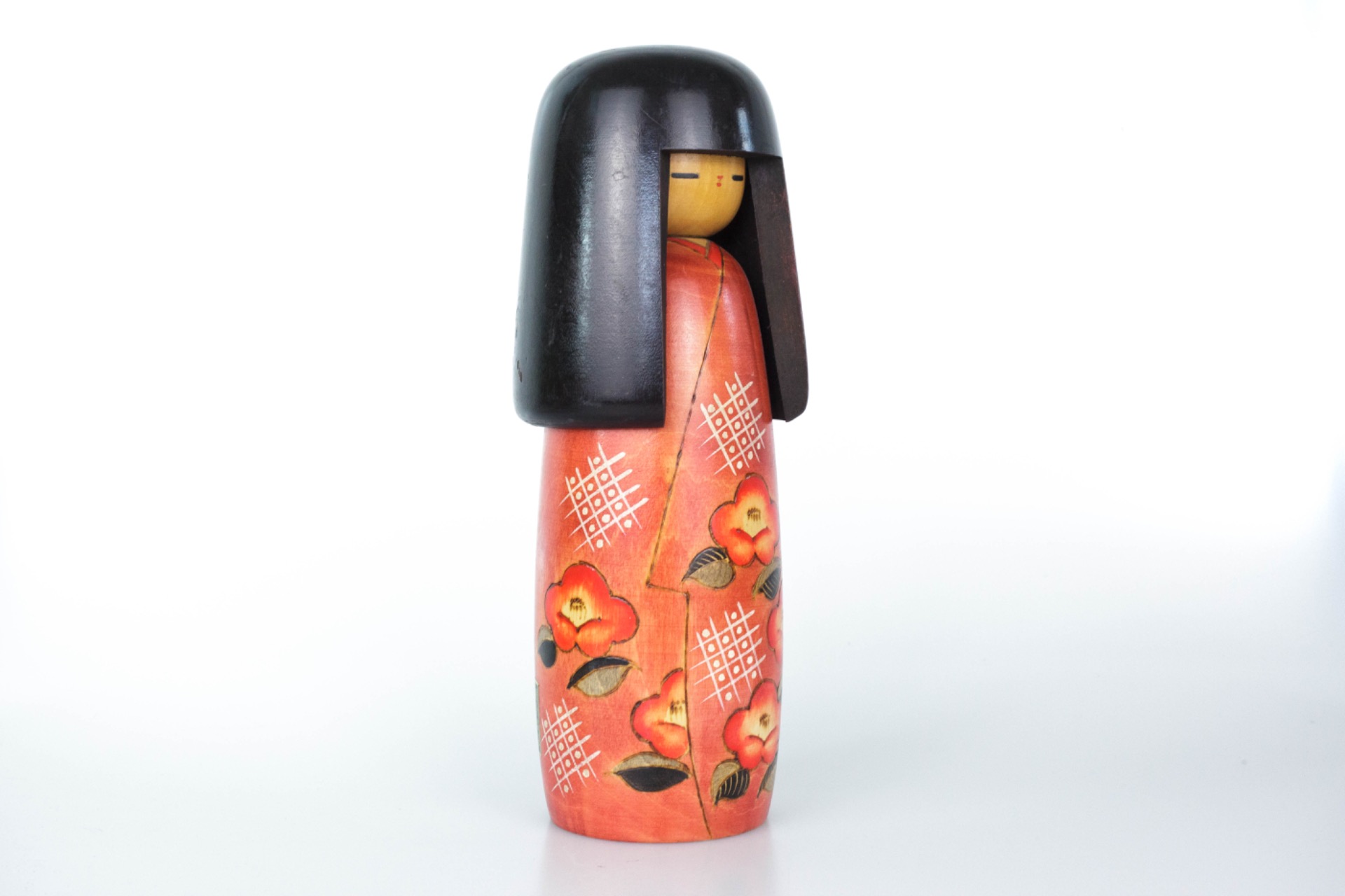 This graceful Kokeshi by Kojo Tanaka (田中耕助) radiates refinement and harmony. Her deep black hairstyle contrasts beautifully with the warm orange-red kimono, richly decorated with blooming camellias. In Japan, this flower is a symbol of beauty and admiration – a fitting theme for such an artistic creation.