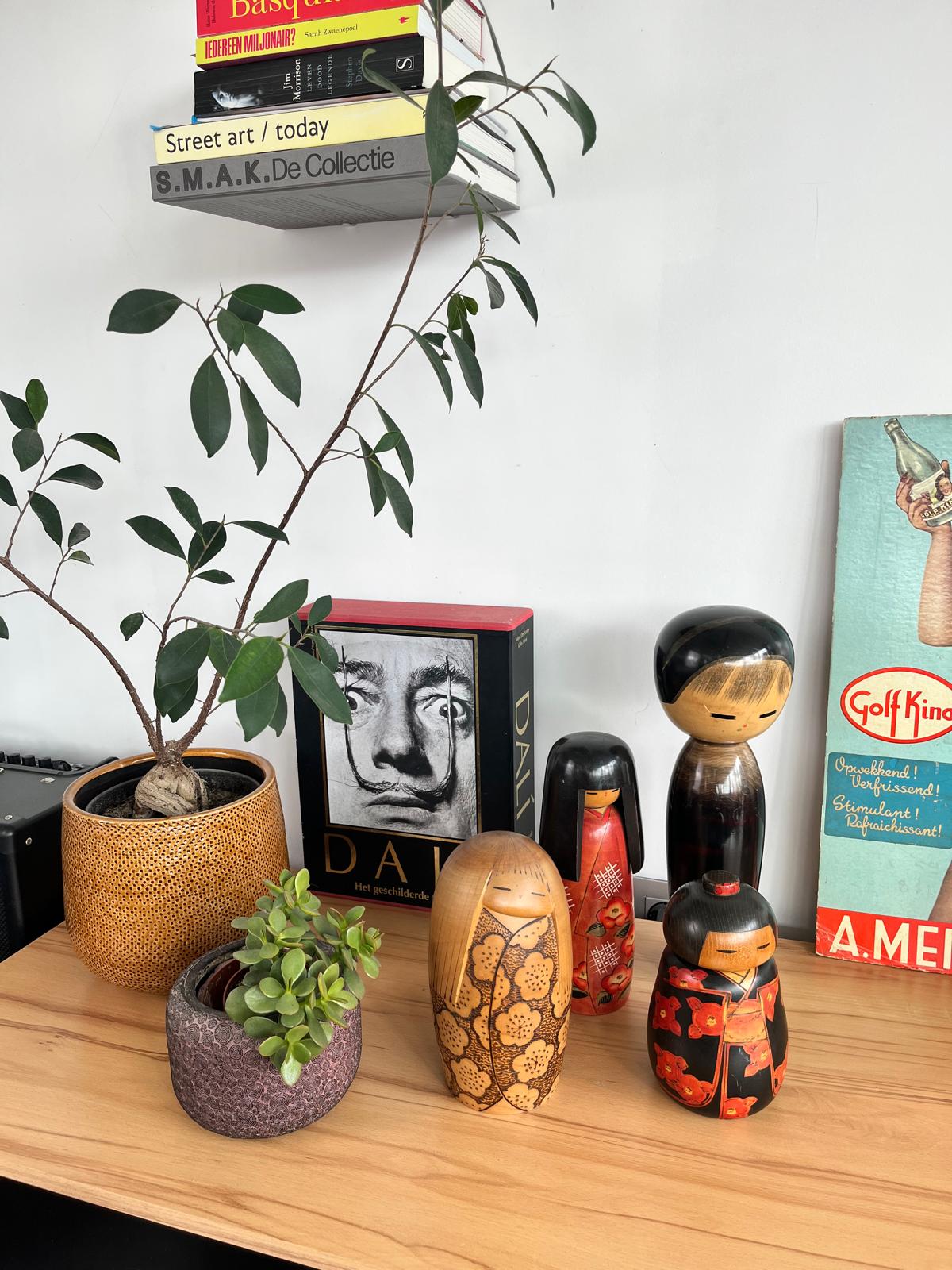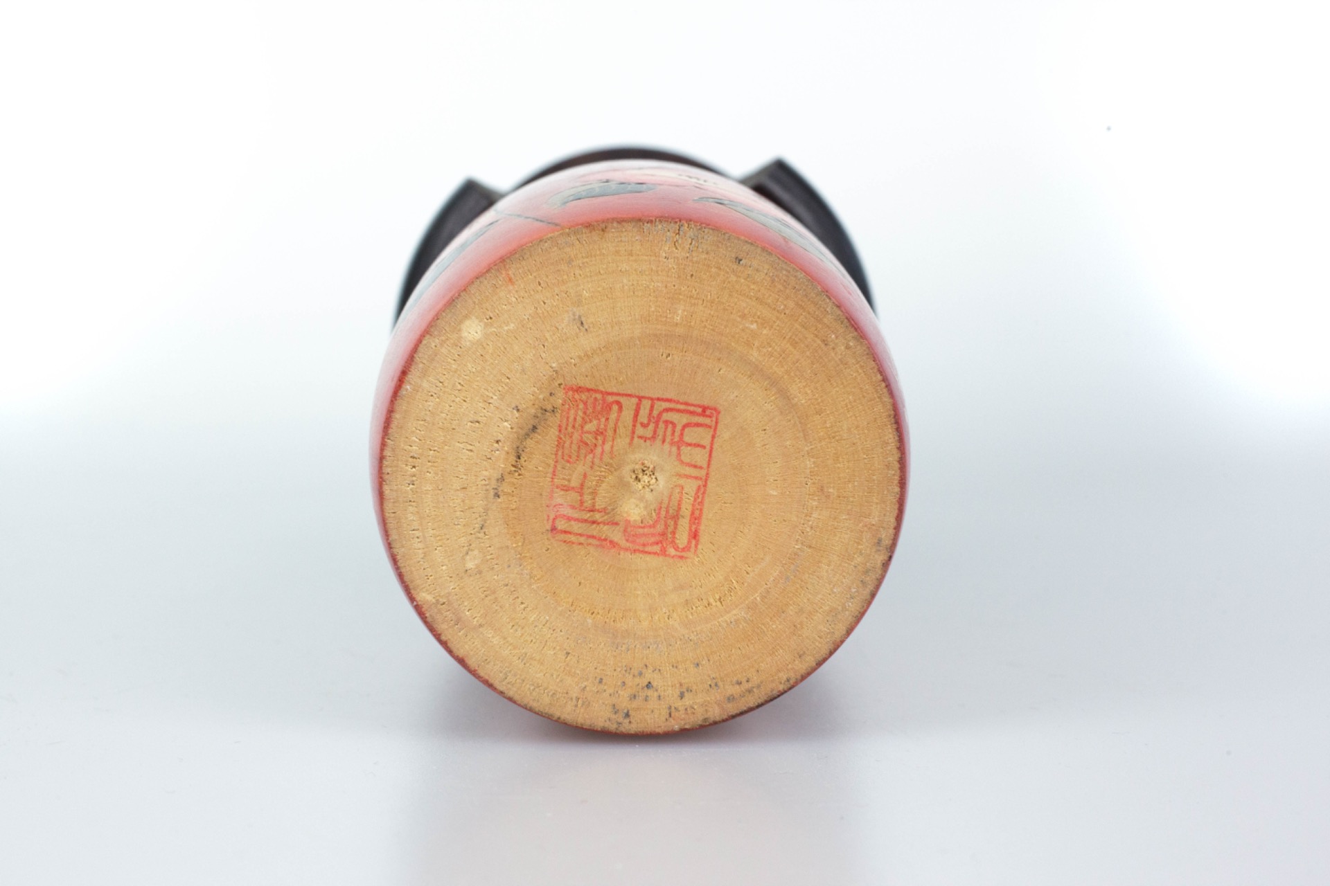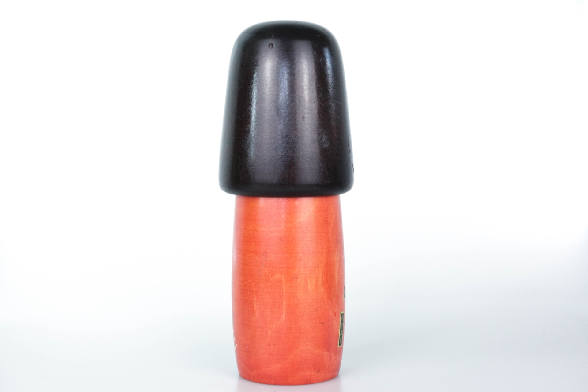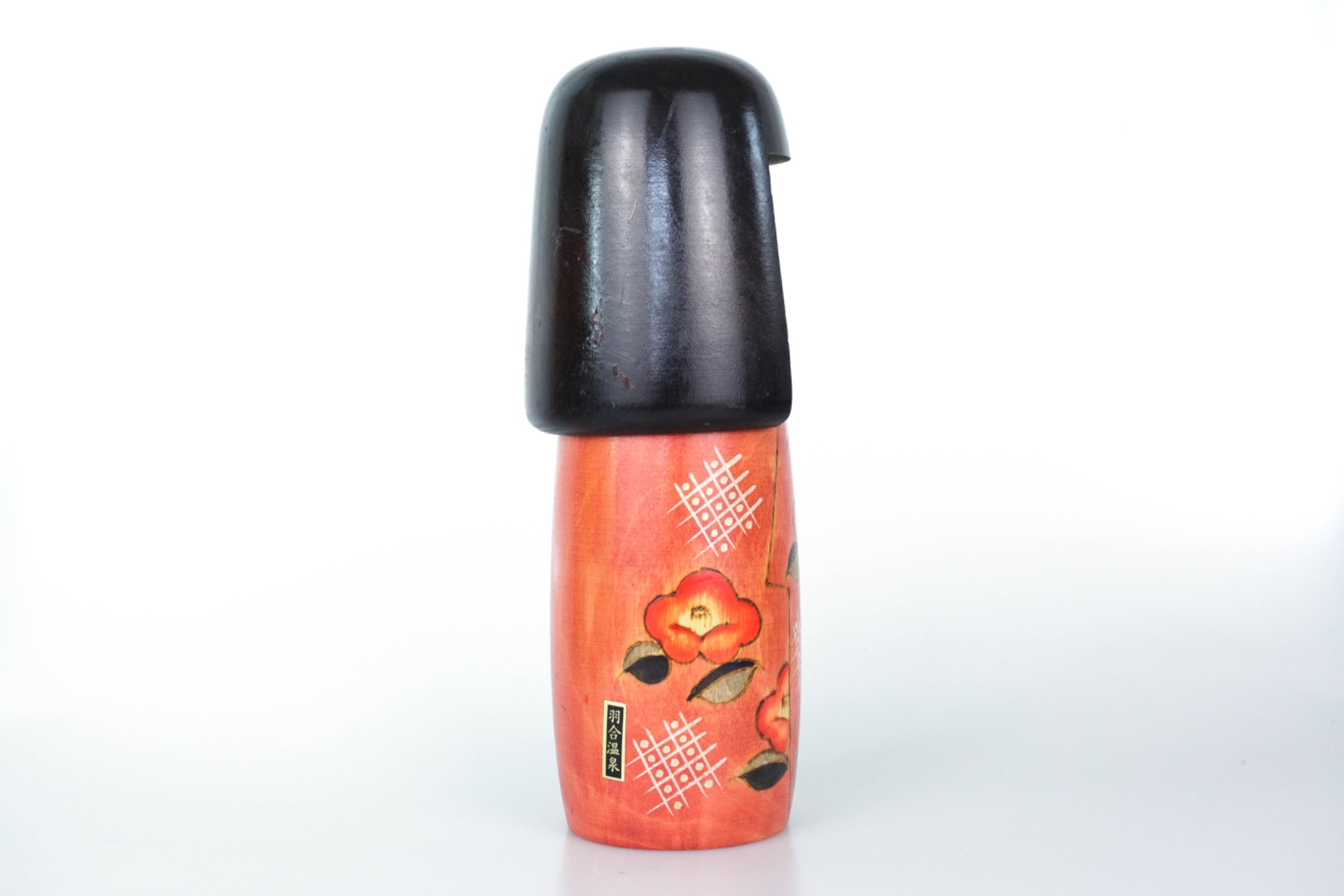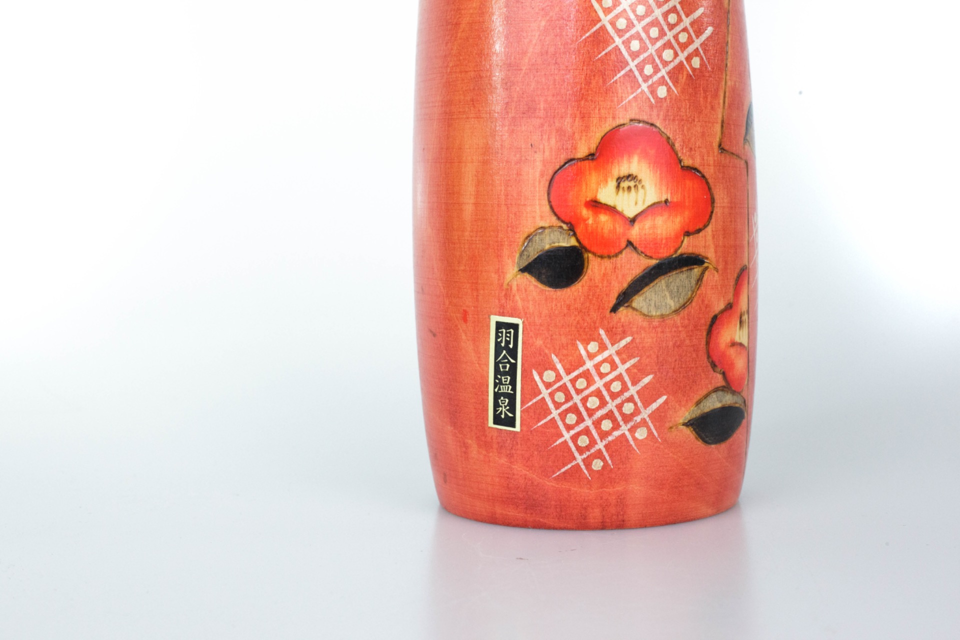 This graceful Kokeshi by Kojo Tanaka (田中耕助) radiates refinement and harmony. Her deep black hairstyle contrasts beautifully with the warm orange-red kimono, richly decorated with blooming camellias. In Japan, this flower is a symbol of beauty and admiration – a fitting theme for such an artistic creation.