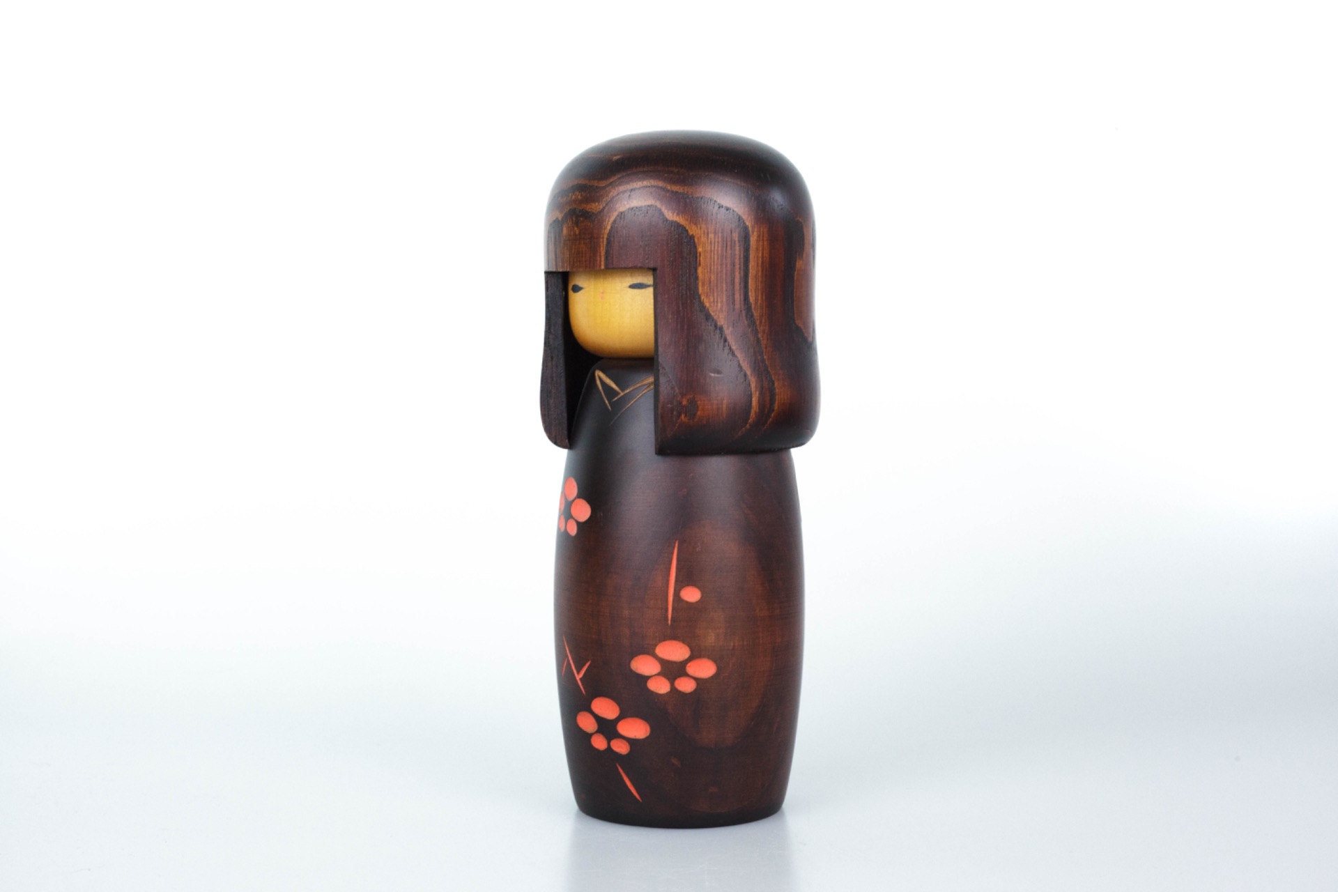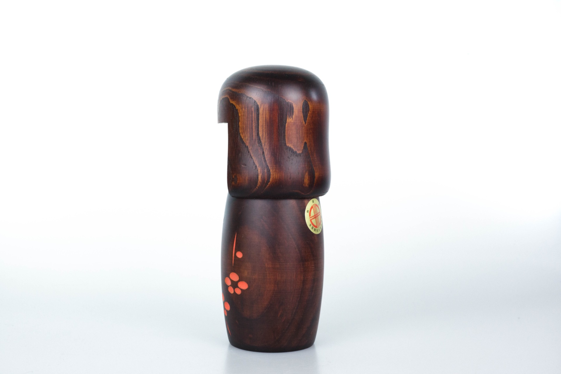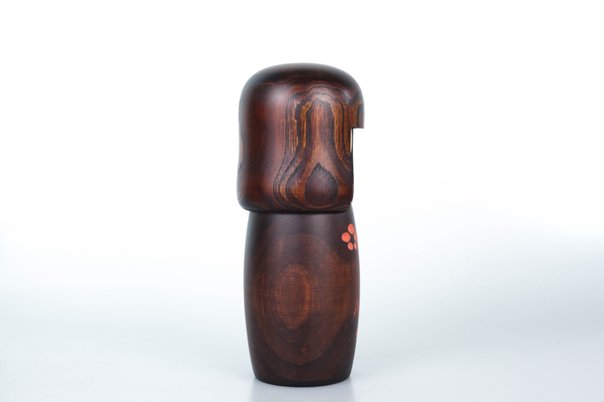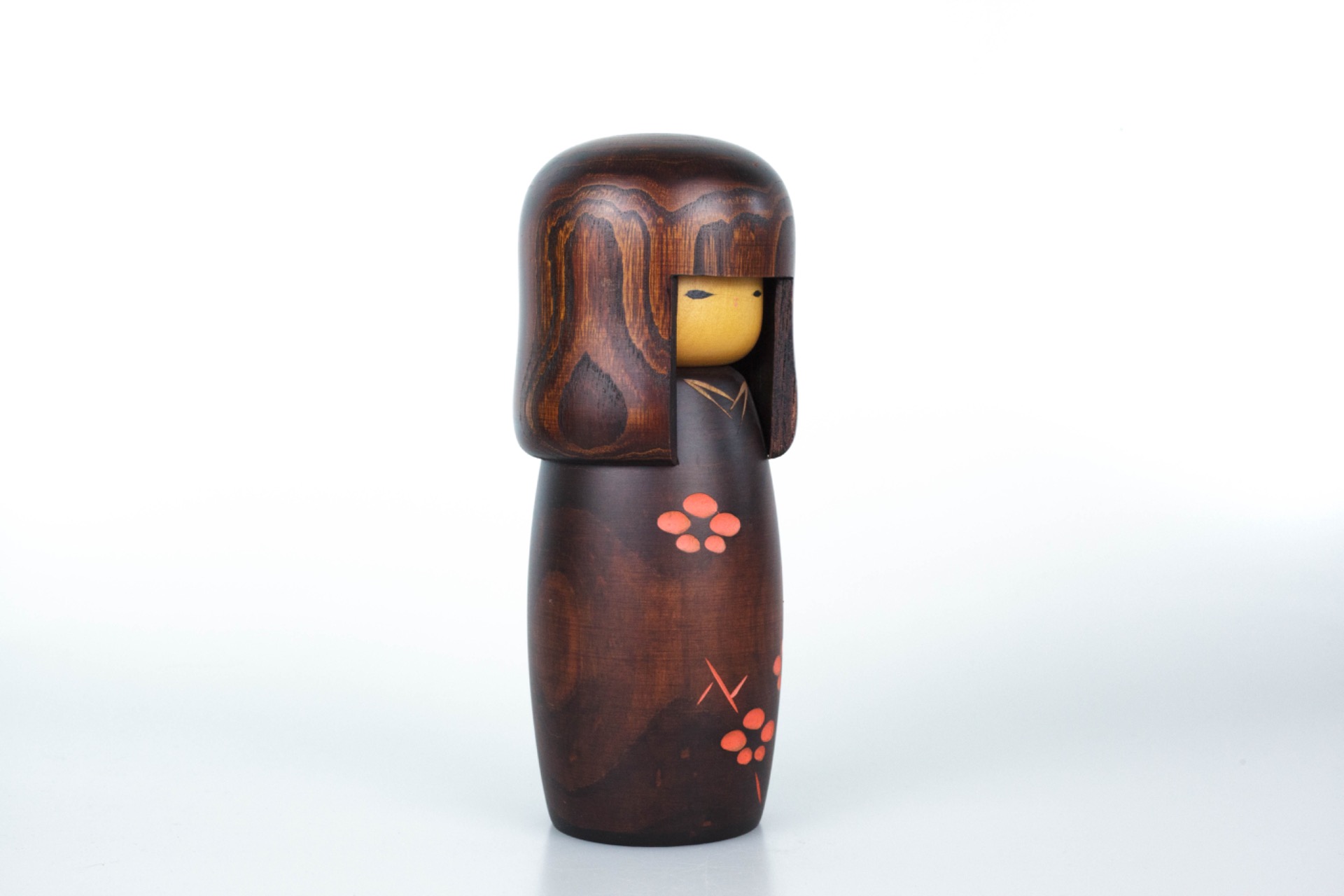 This elegant Kokeshi by Usaburō (卯三郎) is a fine example of the creative (Sōsaku) style. The dark stained wood is delicately contrasted with subtle red floral accents, giving the doll a refined and understated character. Usaburō is renowned for his innovative designs that merge tradition with modernity. An ideal piece for both new and seasoned collectors.