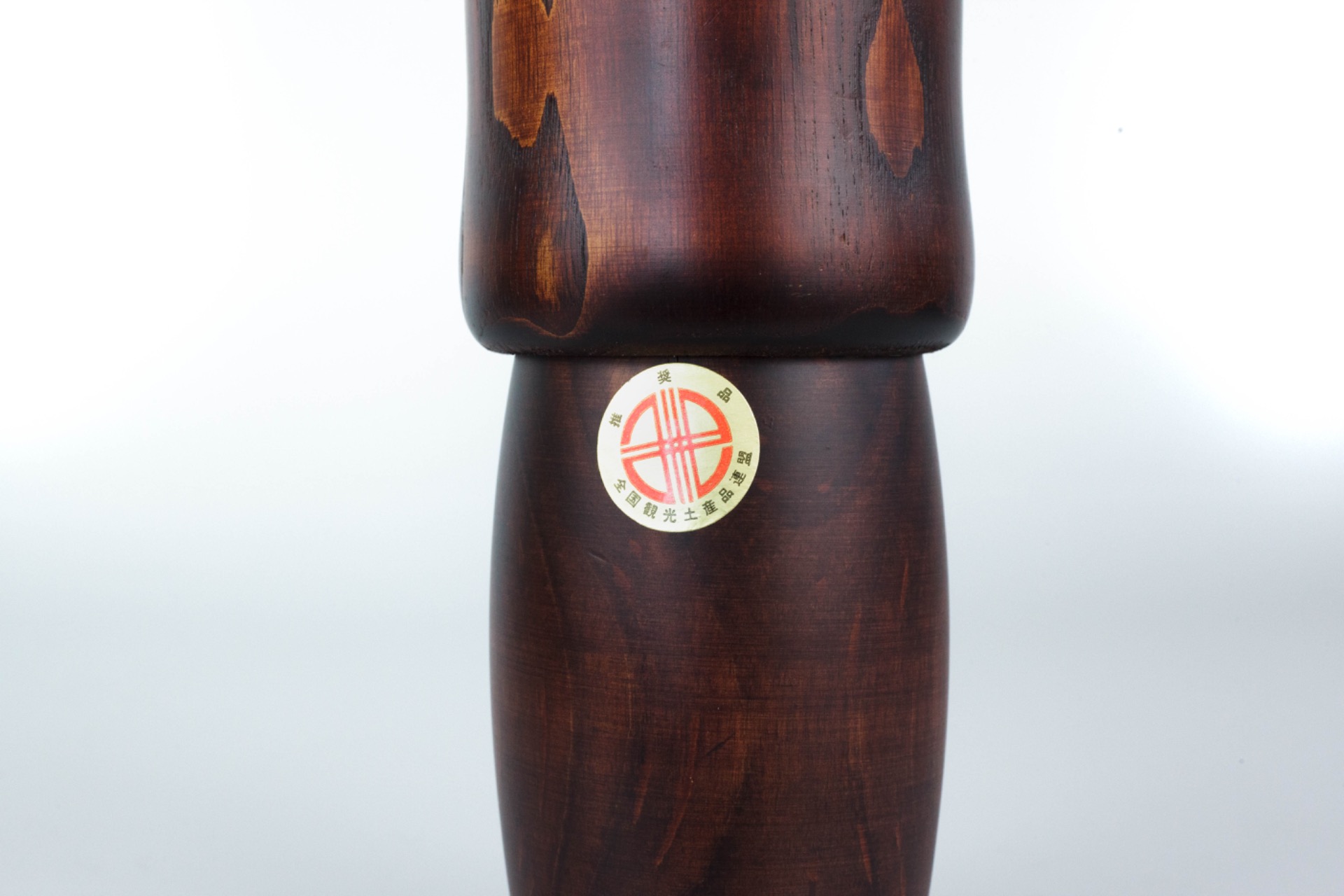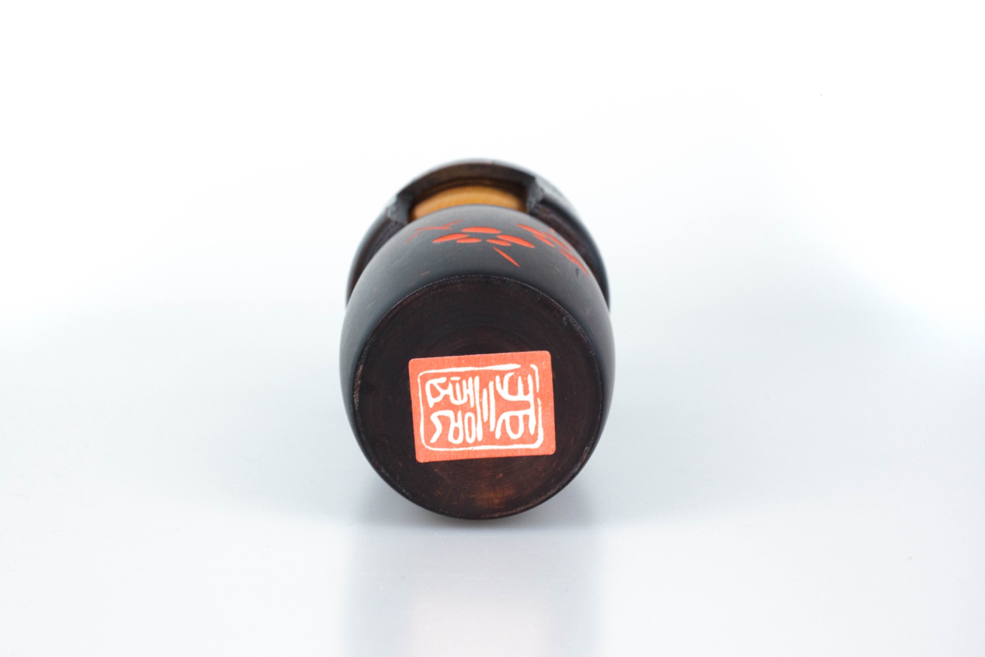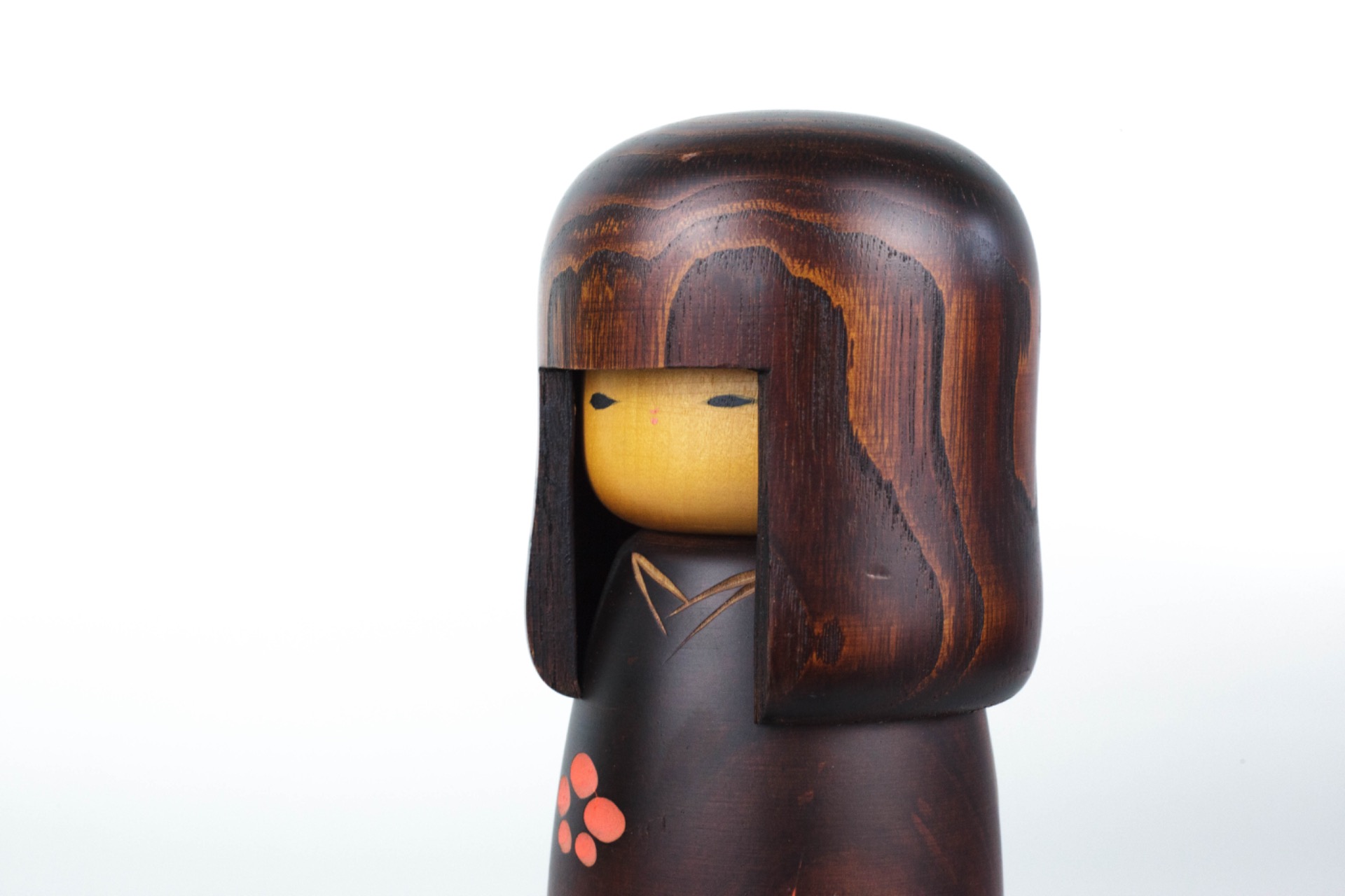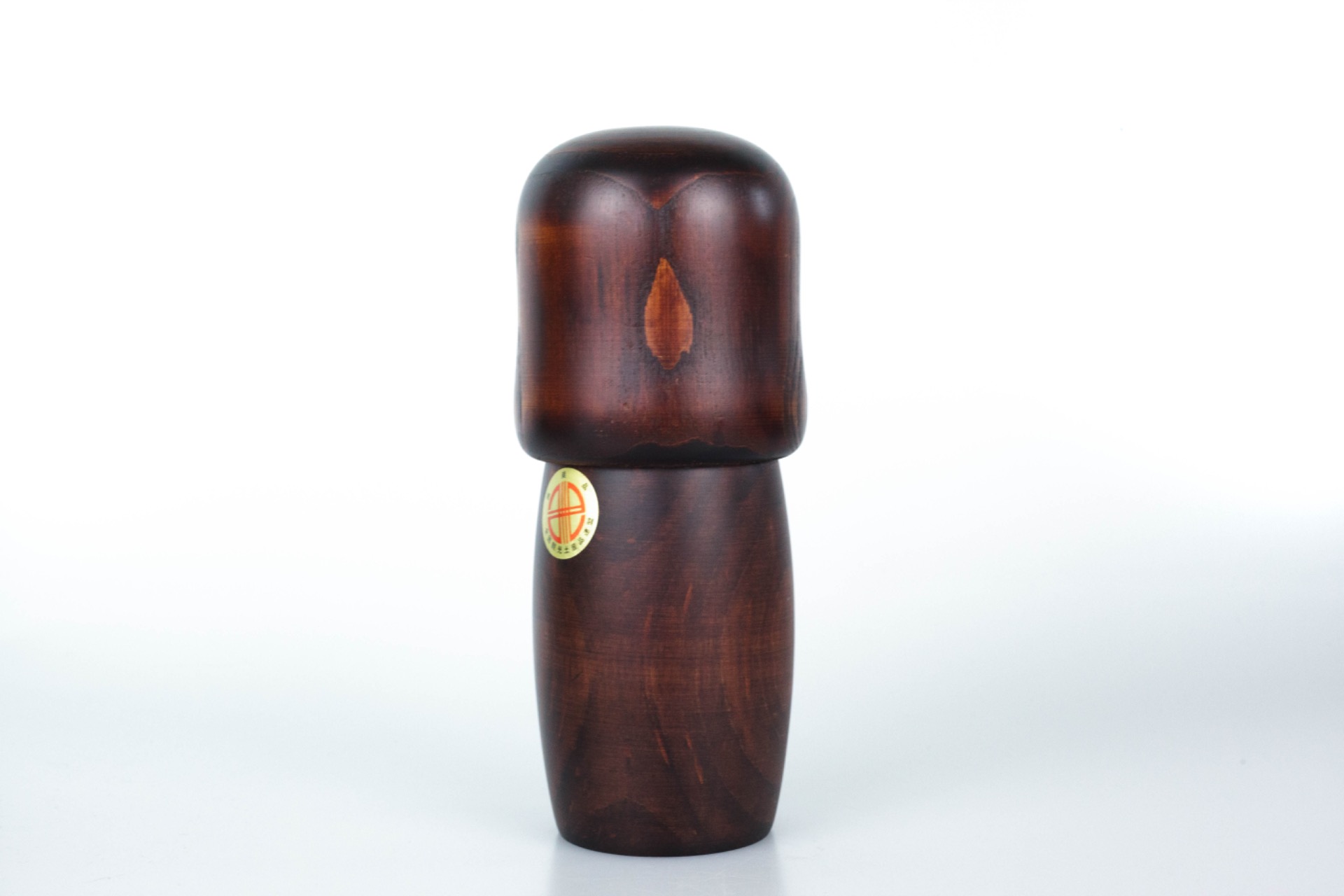 This elegant Kokeshi by Usaburō (卯三郎) is a fine example of the creative (Sōsaku) style. The dark stained wood is delicately contrasted with subtle red floral accents, giving the doll a refined and understated character. Usaburō is renowned for his innovative designs that merge tradition with modernity. An ideal piece for both new and seasoned collectors.