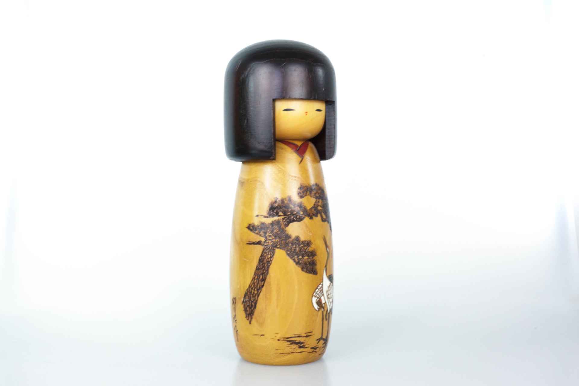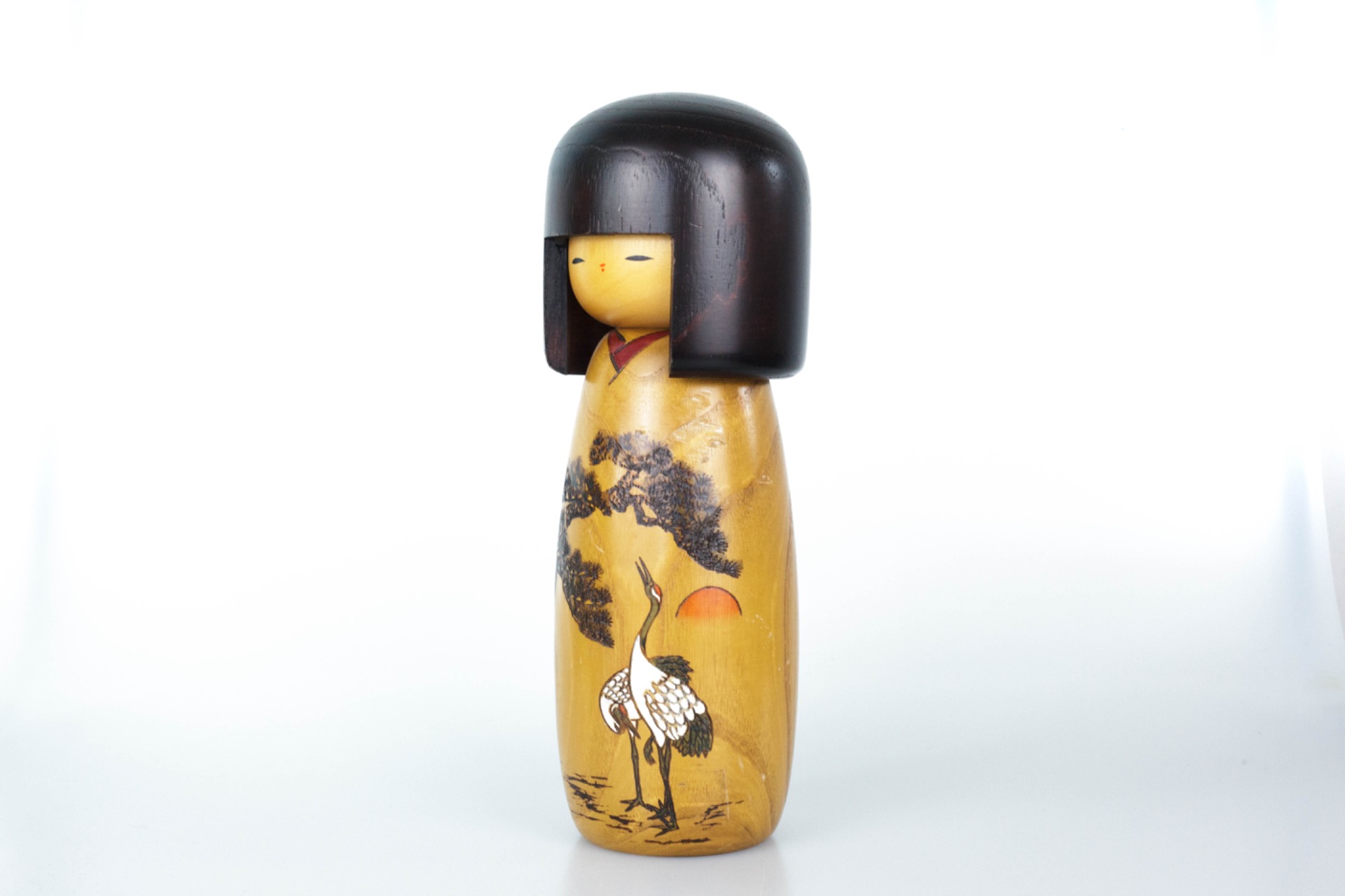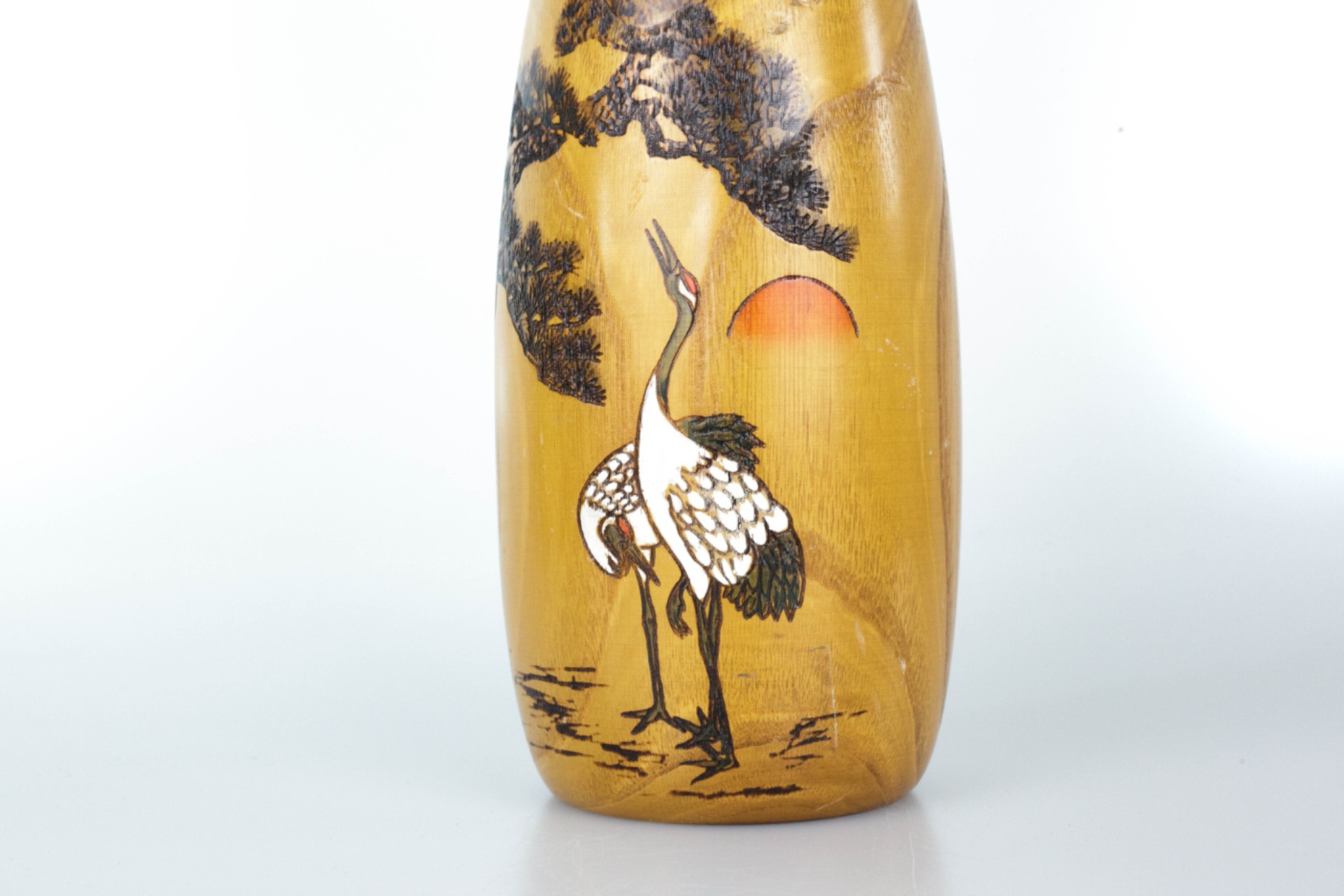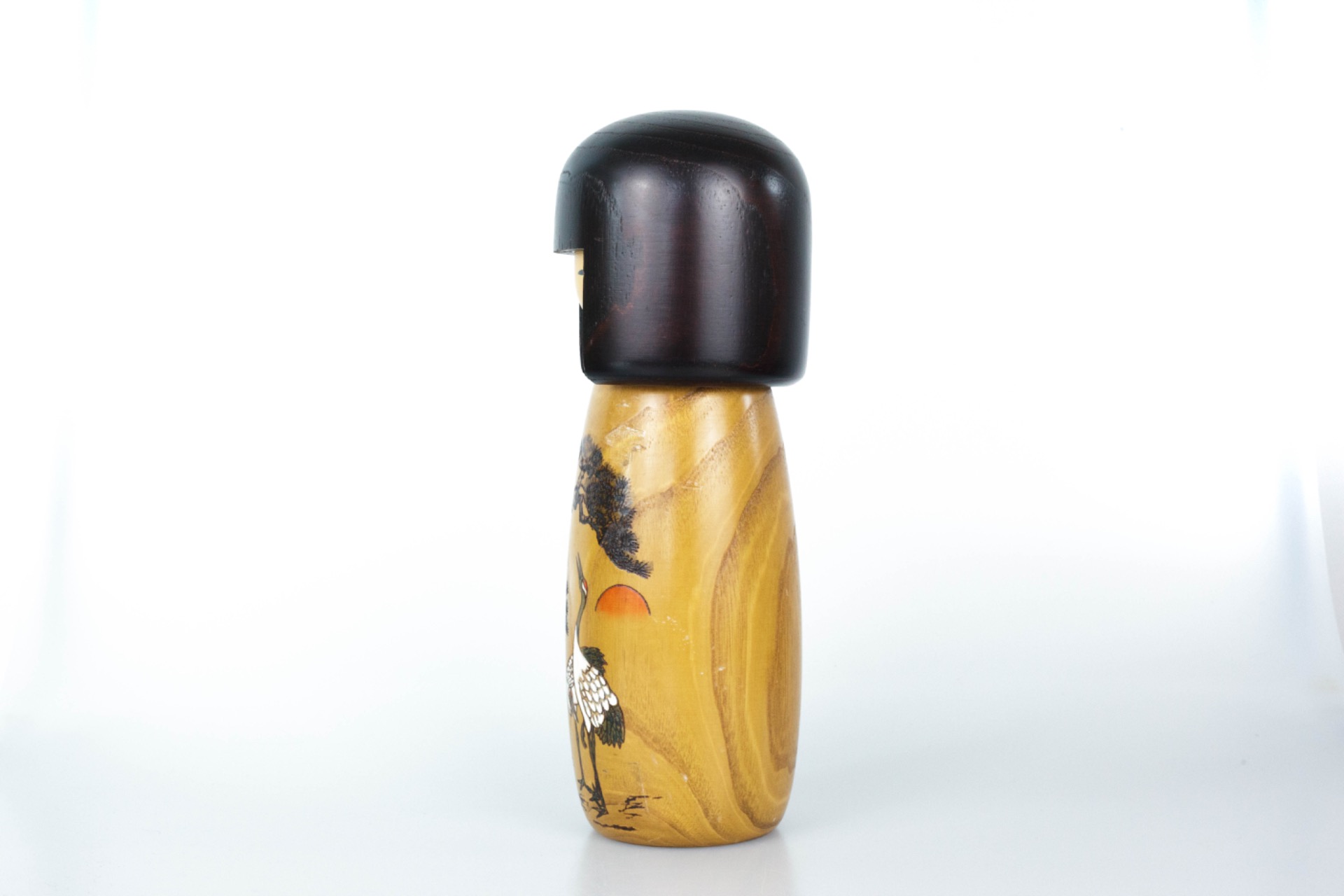 This elegant Kokeshi by Usaburō (卯三郎) captures the essence of Japanese symbolism in wood. Cranes and a pine tree, both icons of long life and prosperity, are painted on the kimono. The rising red sun adds a sense of strength and serenity.