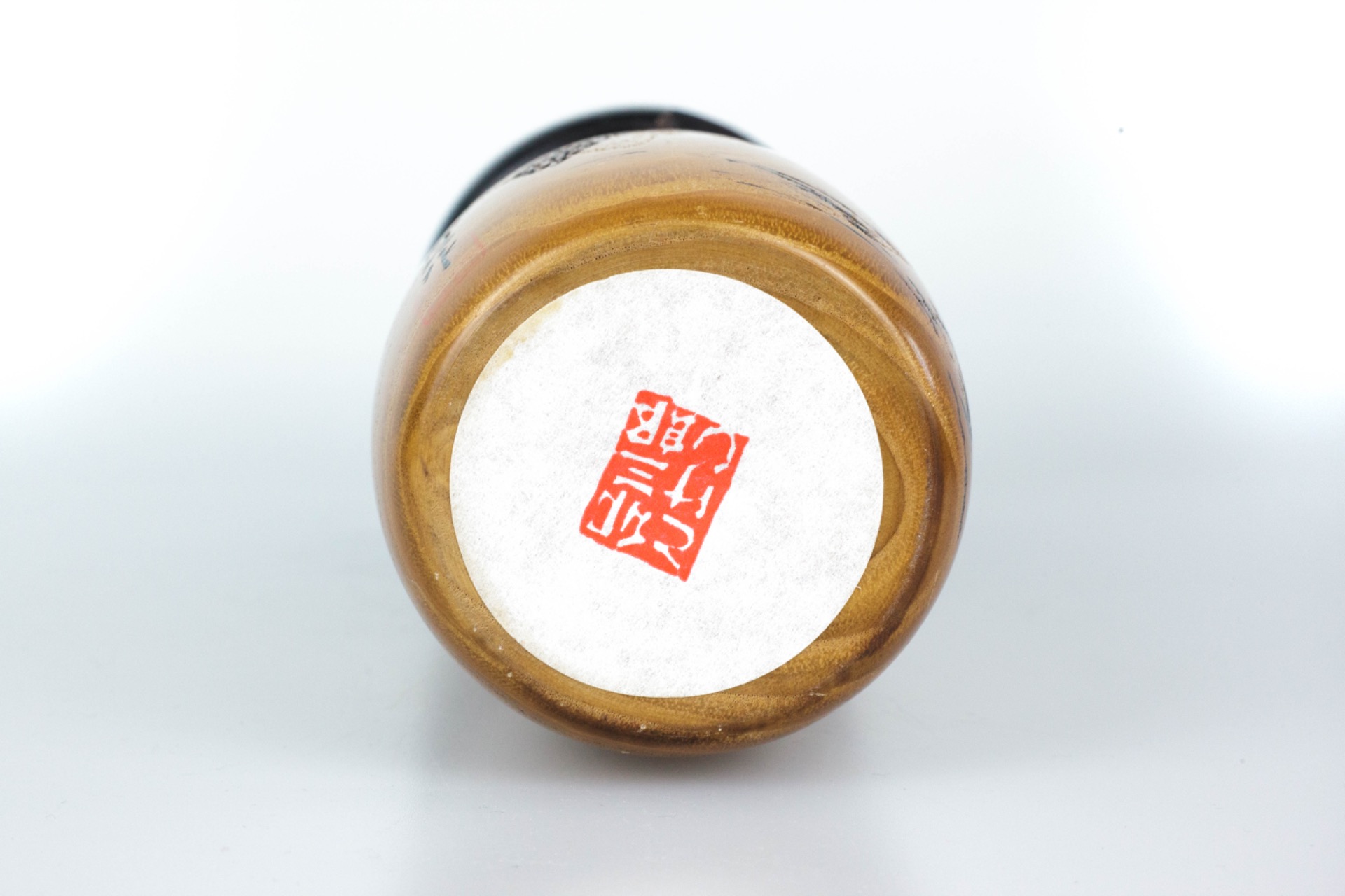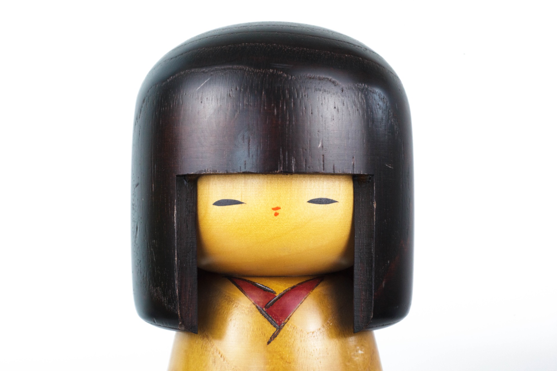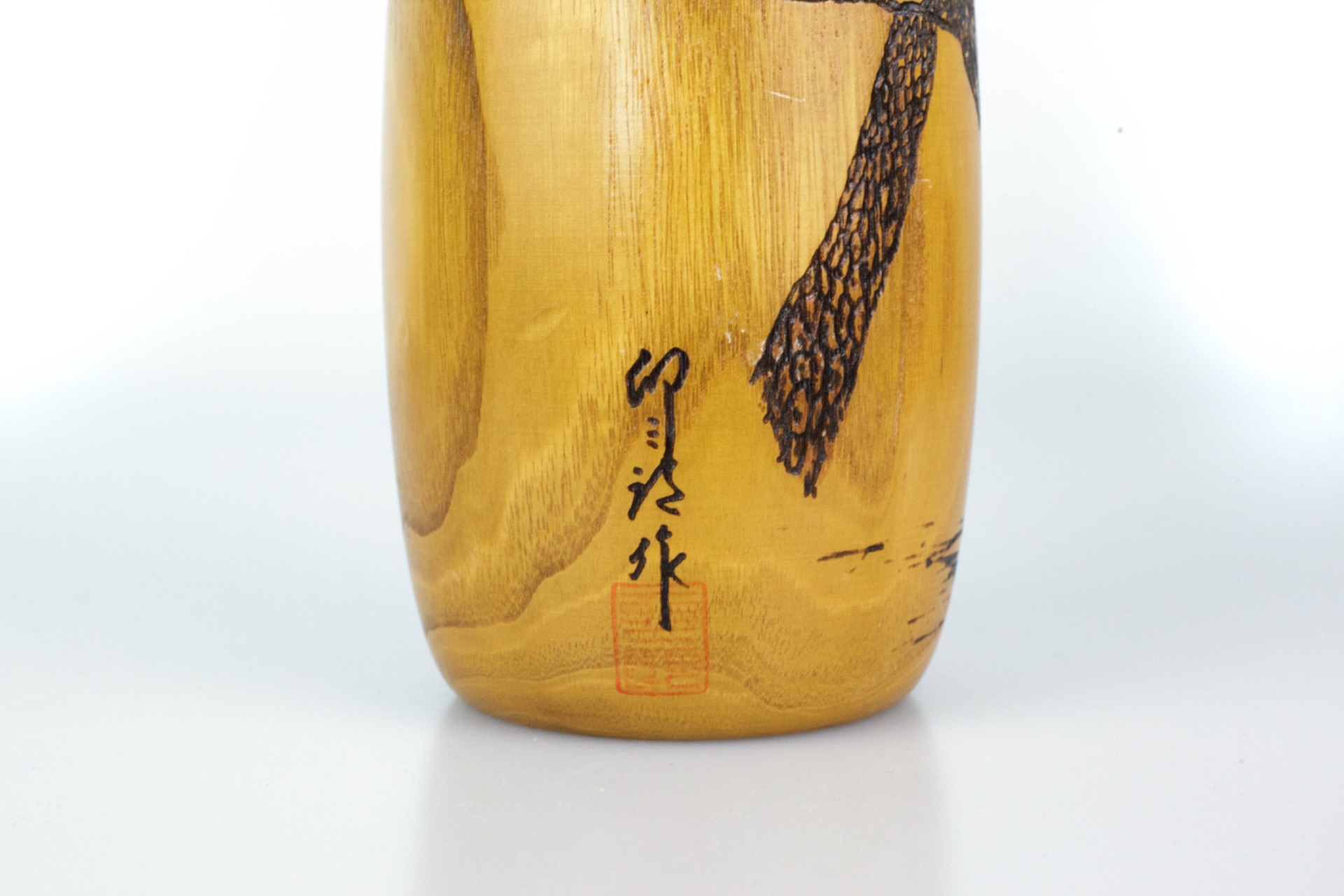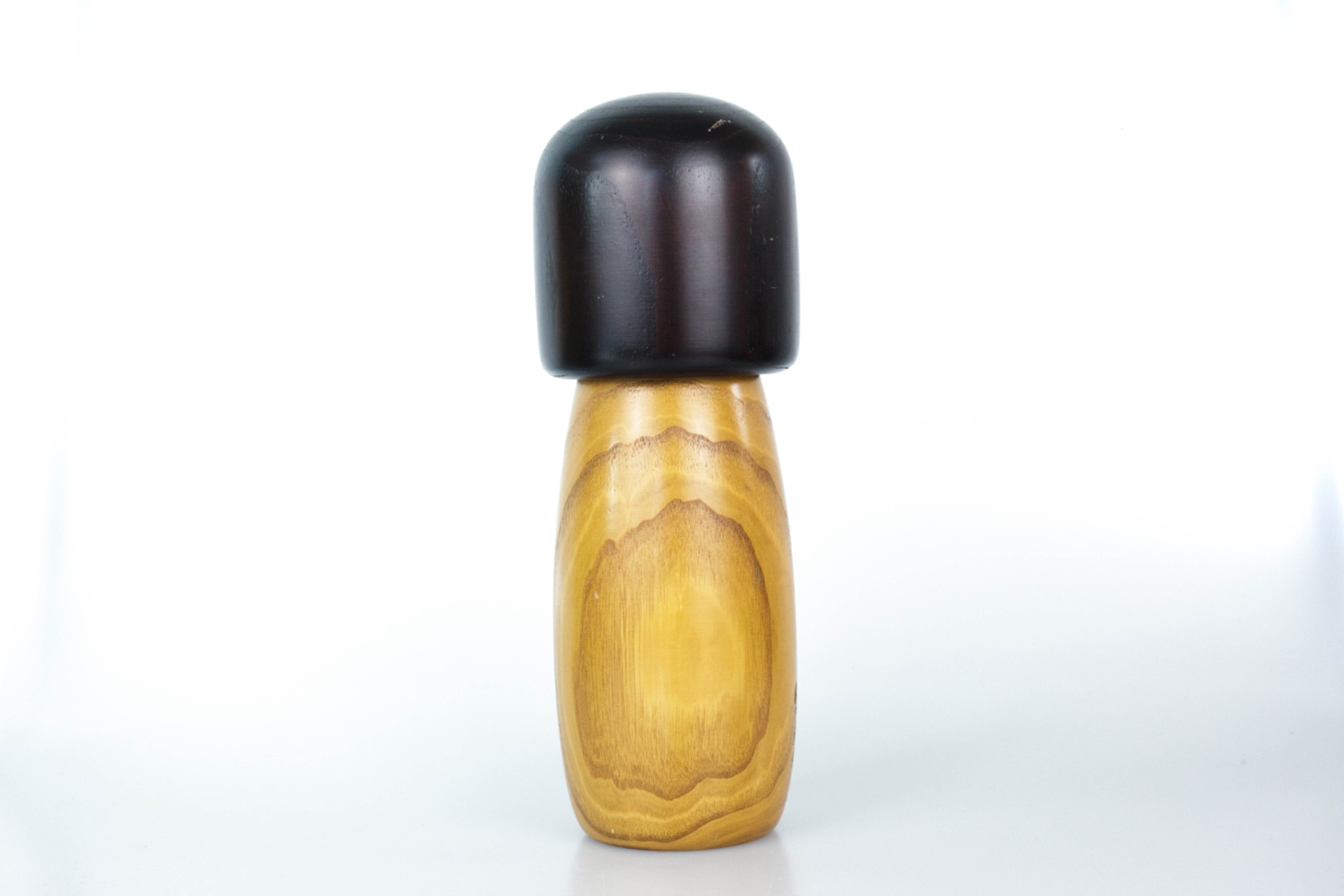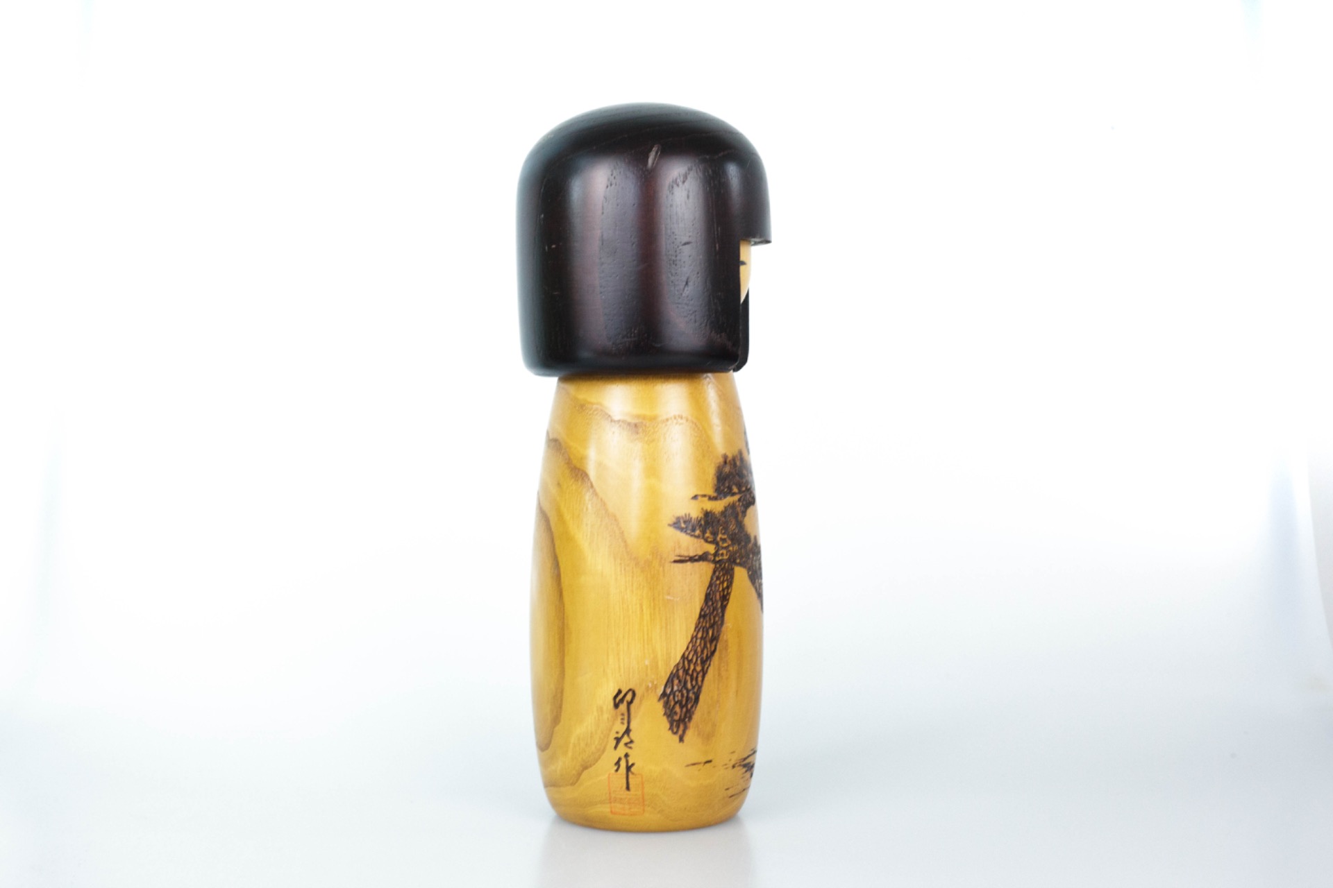 This elegant Kokeshi by Usaburō (卯三郎) captures the essence of Japanese symbolism in wood. Cranes and a pine tree, both icons of long life and prosperity, are painted on the kimono. The rising red sun adds a sense of strength and serenity.