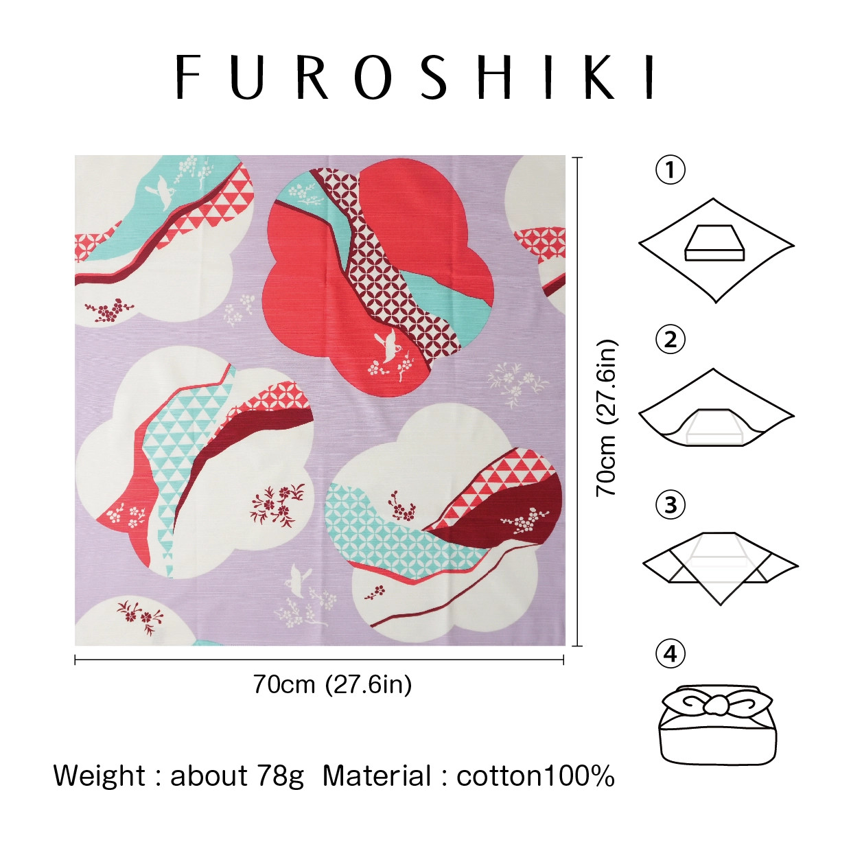 Deze furoshiki brengt meteen een zachte, speelse energie met zich mee. Het ontwerp wordt gedragen door grote, gestileerde ume-bloemen, een motief dat in Japan symbool staat voor het vroege voorjaar, veerkracht en een nieuw begin.