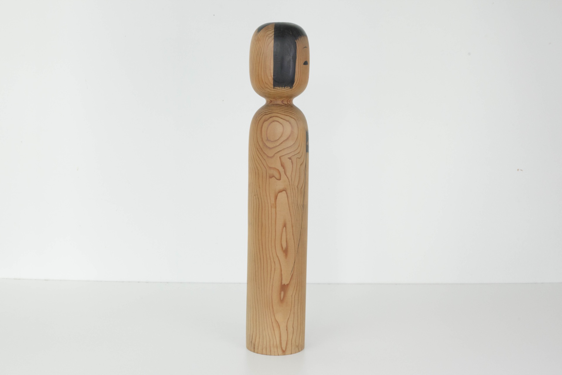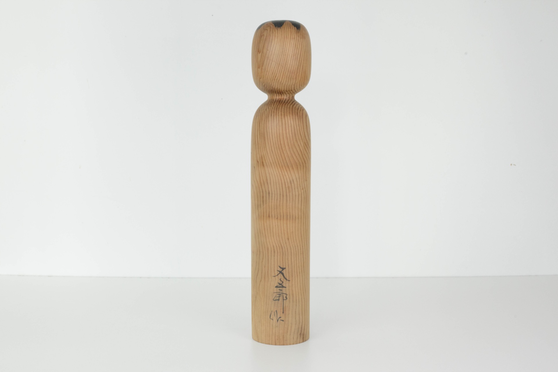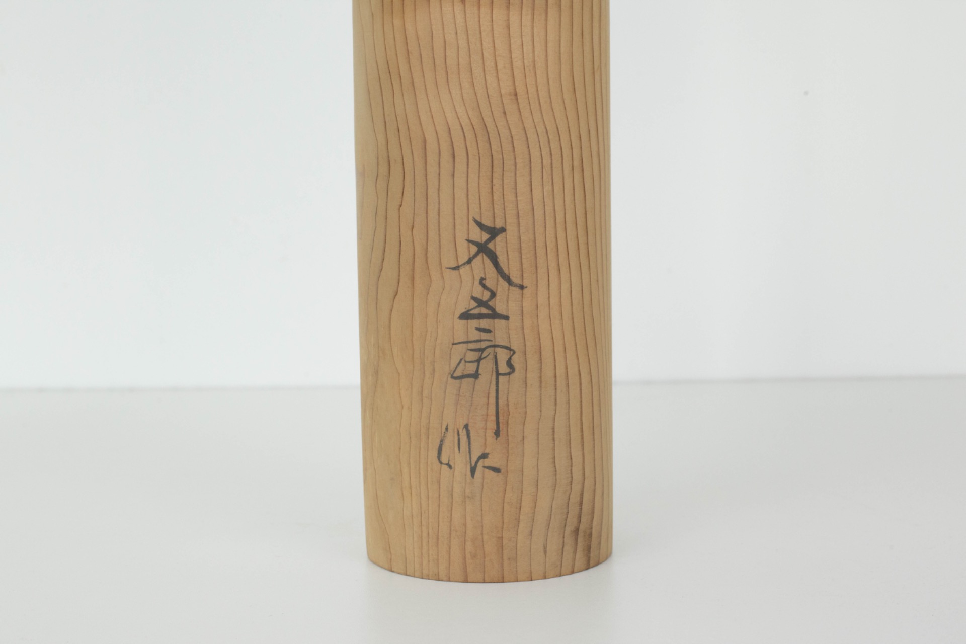 A tall cedar wood kokeshi by Matagorō Yashima (又五郎), with a serene expression and visible wood grain. An understated, authentic piece with strong wabi-sabi character.