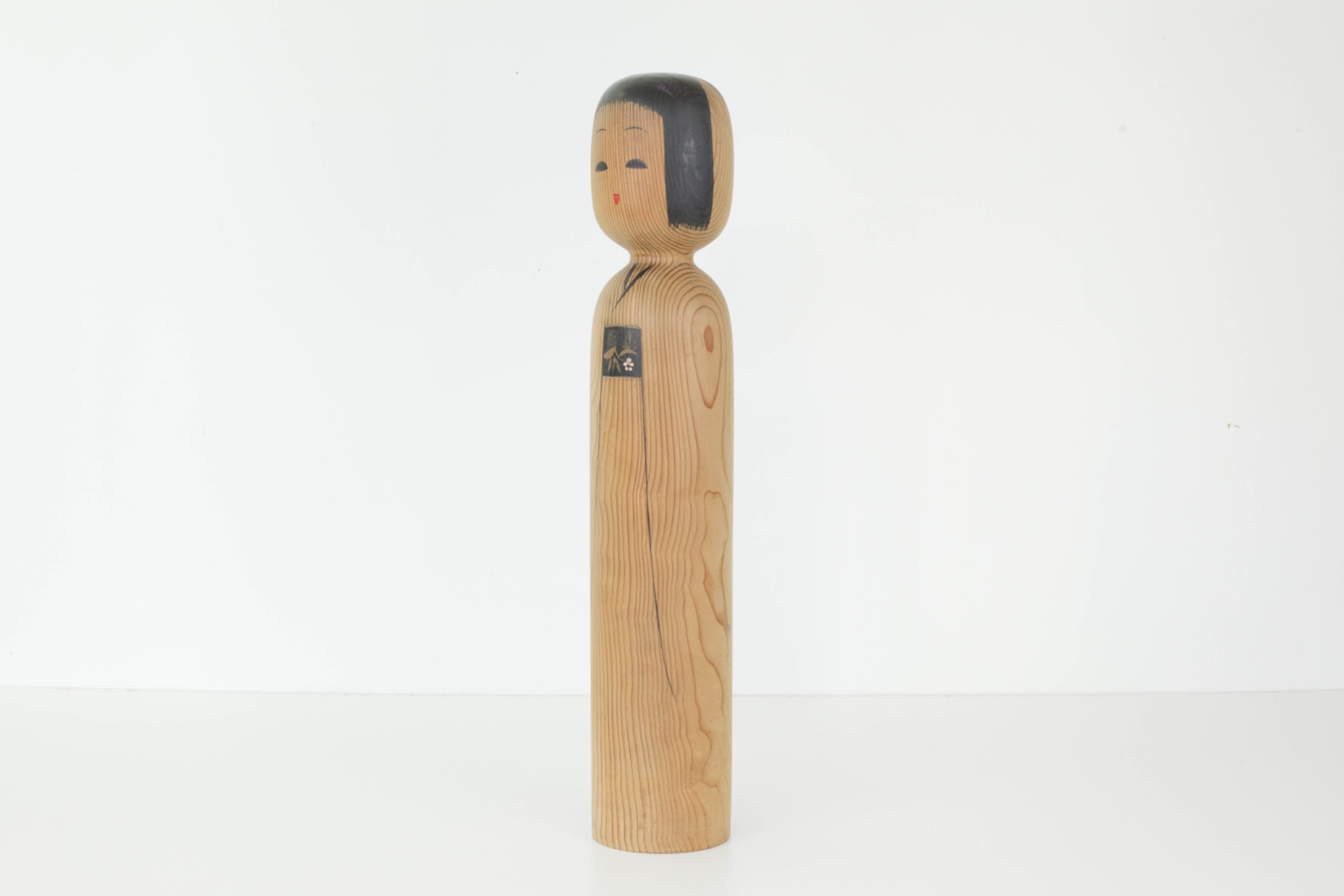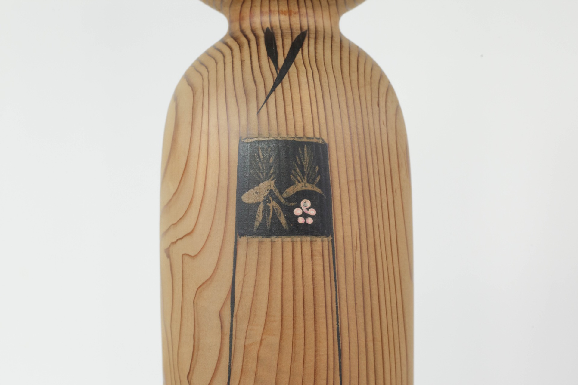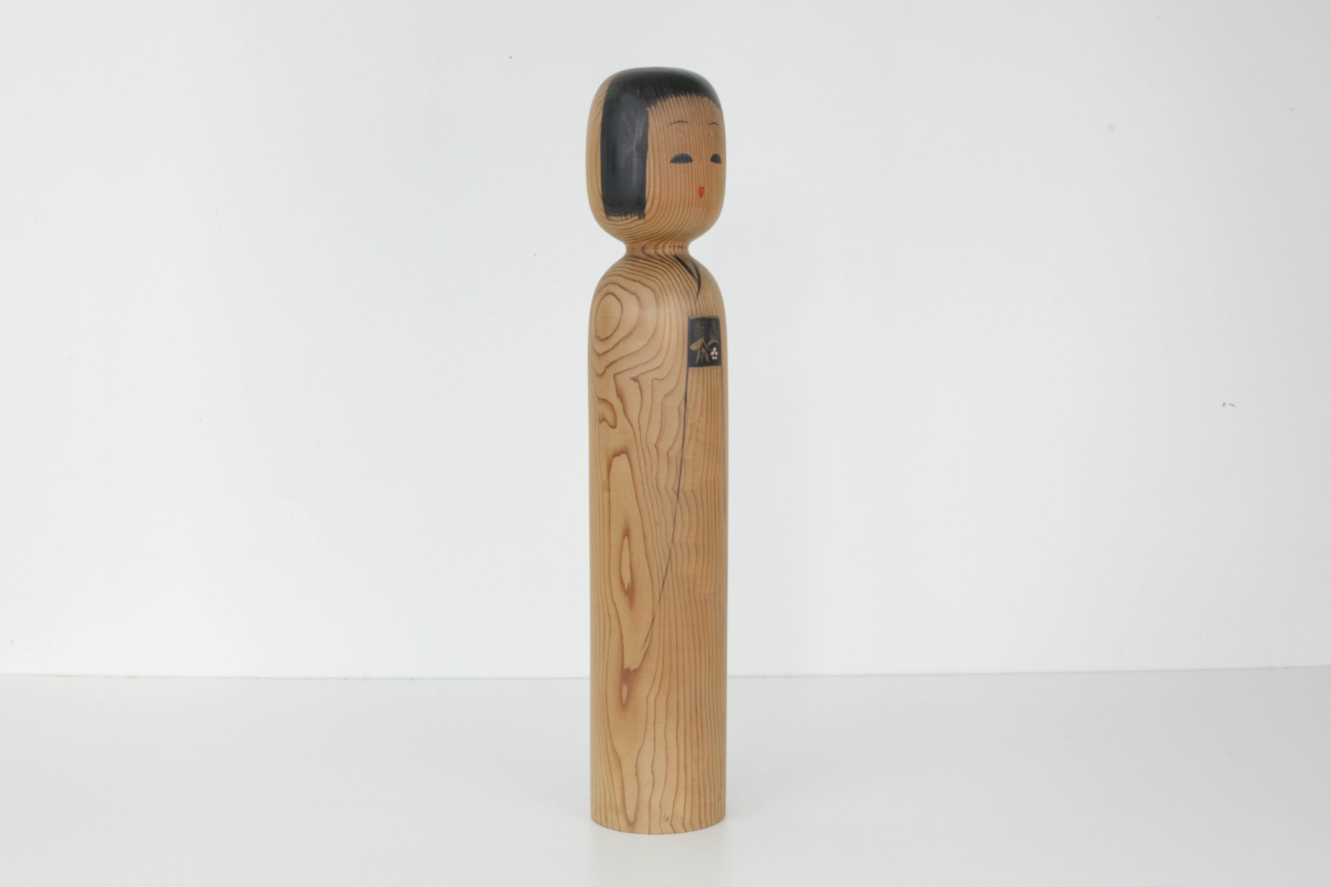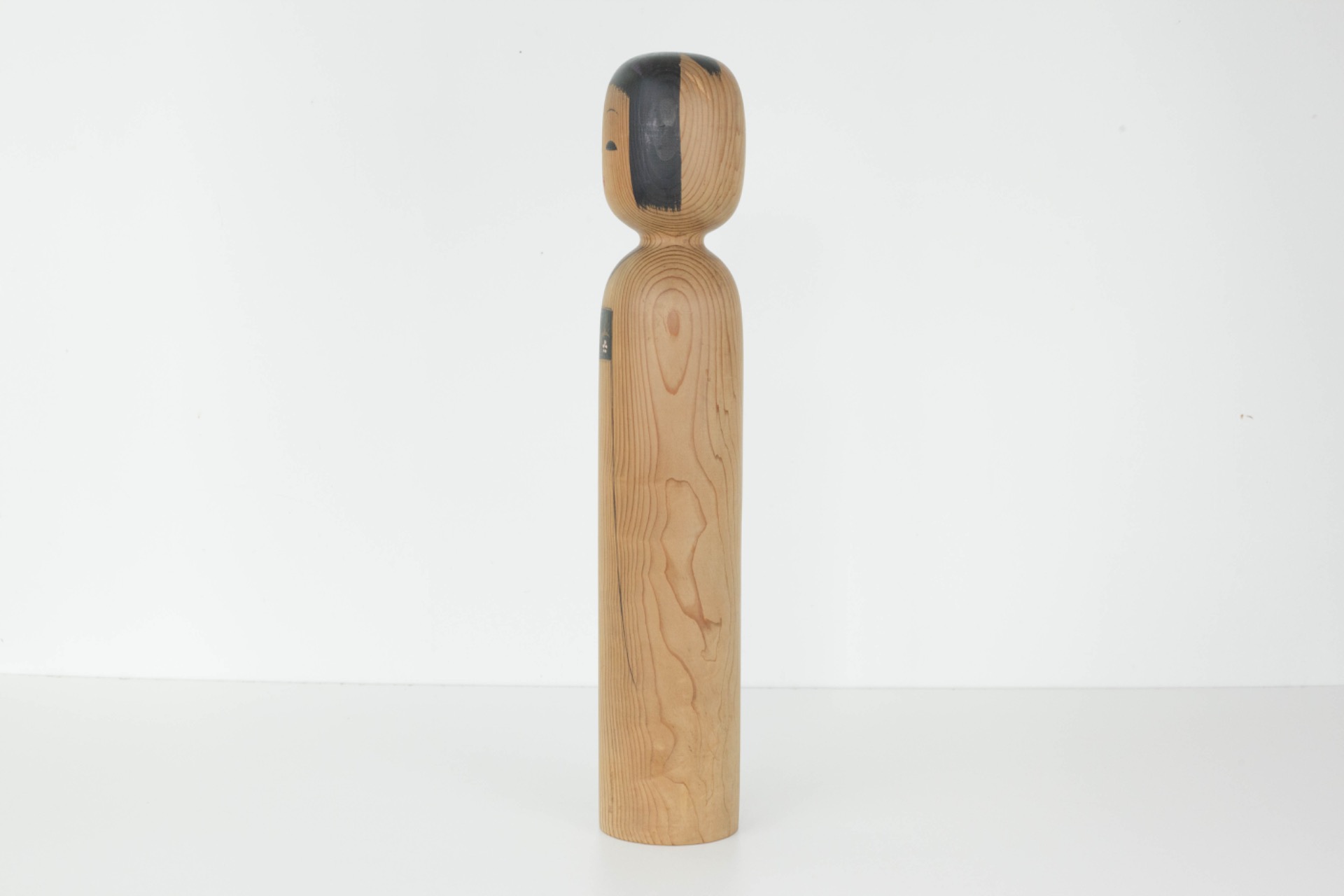 A tall cedar wood kokeshi by Matagorō Yashima (又五郎), with a serene expression and visible wood grain. An understated, authentic piece with strong wabi-sabi character.