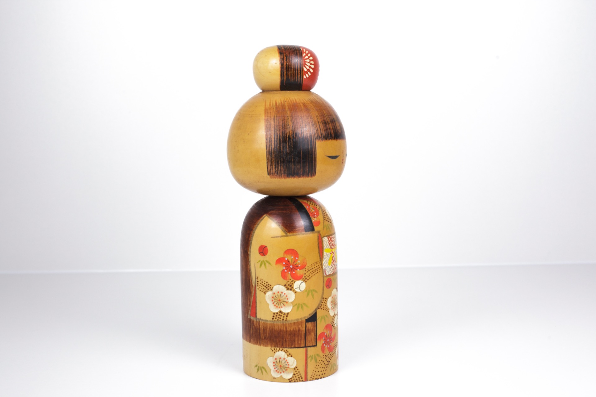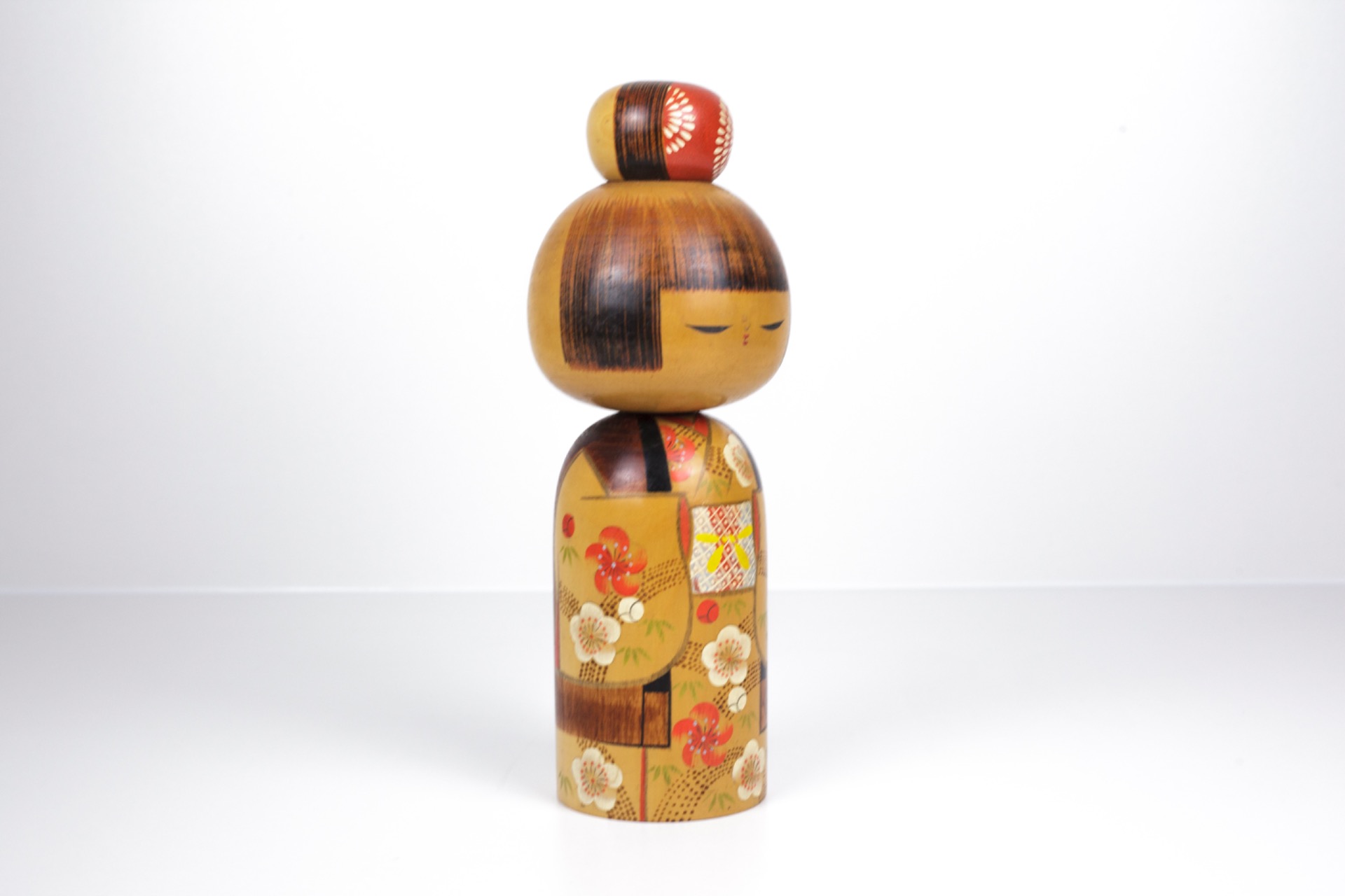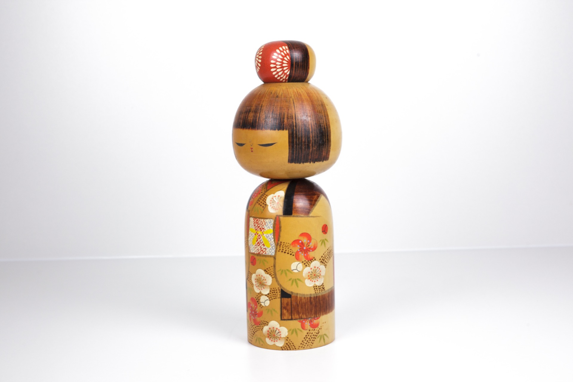Deze Kokeshi straalt rust, elegantie en verfijning uit. De combinatie van warme kleuren, gedetailleerde schildering en serene expressie maakt dit een sterk decoratief stuk met duidelijke artistieke waarde.
