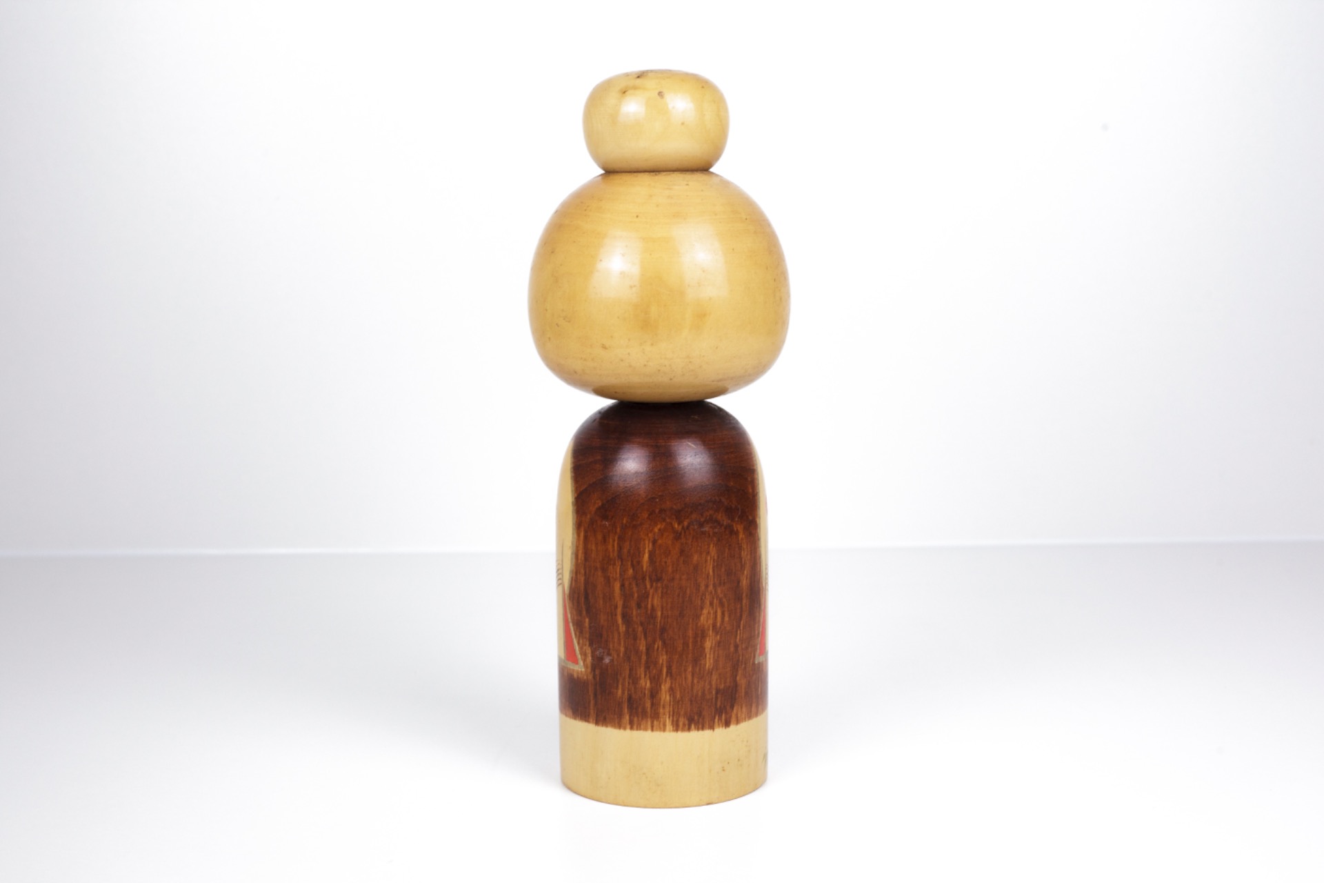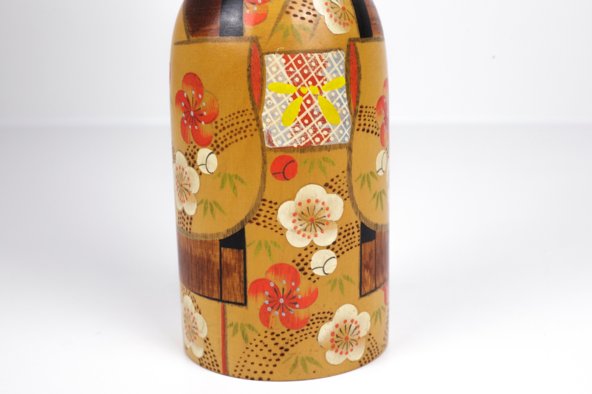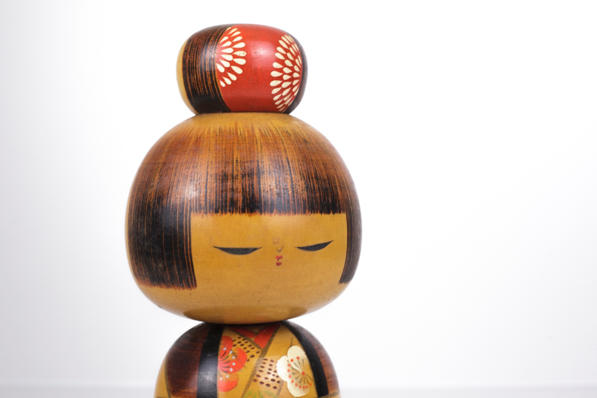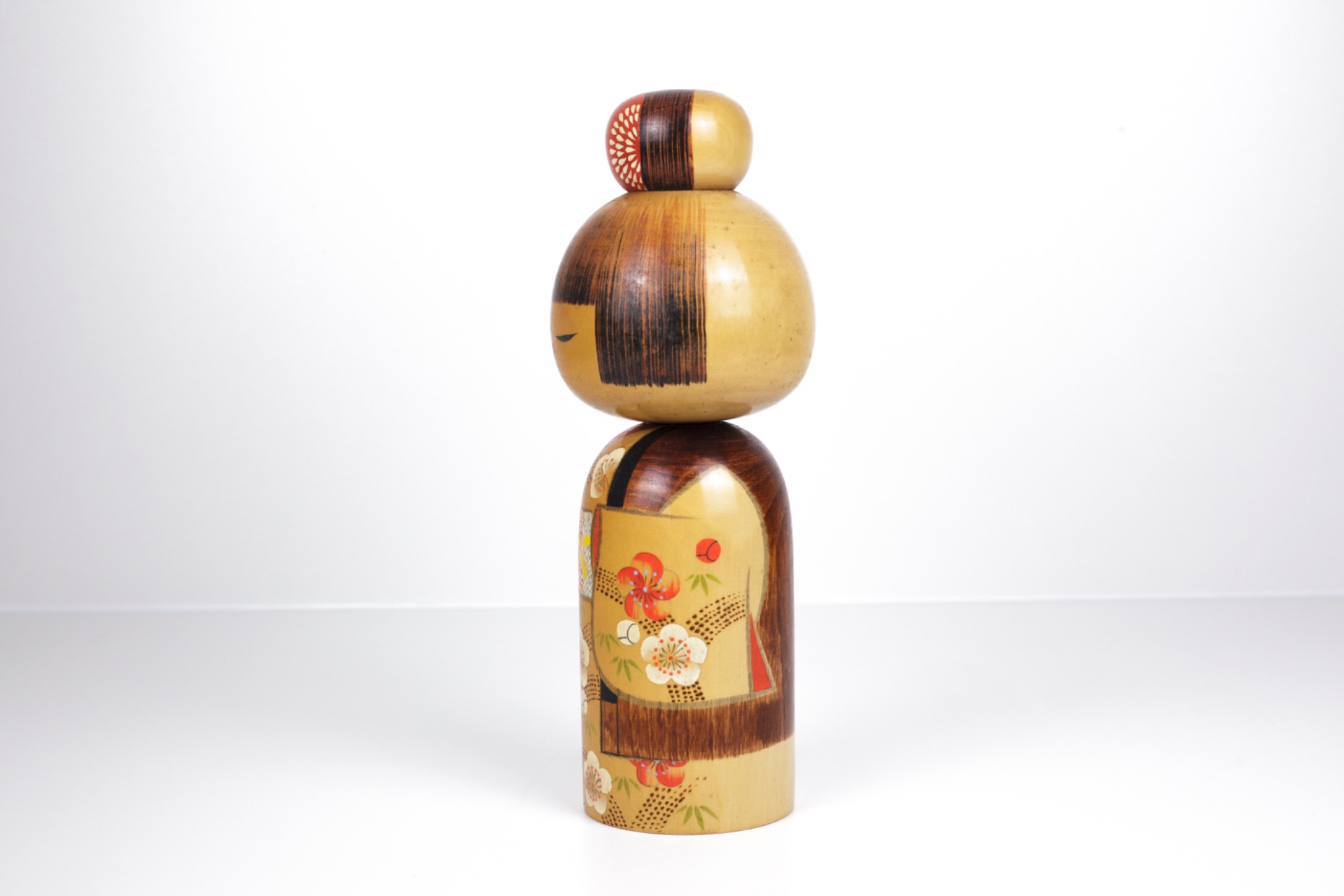 Deze Kokeshi straalt rust, elegantie en verfijning uit. De combinatie van warme kleuren, gedetailleerde schildering en serene expressie maakt dit een sterk decoratief stuk met duidelijke artistieke waarde.
