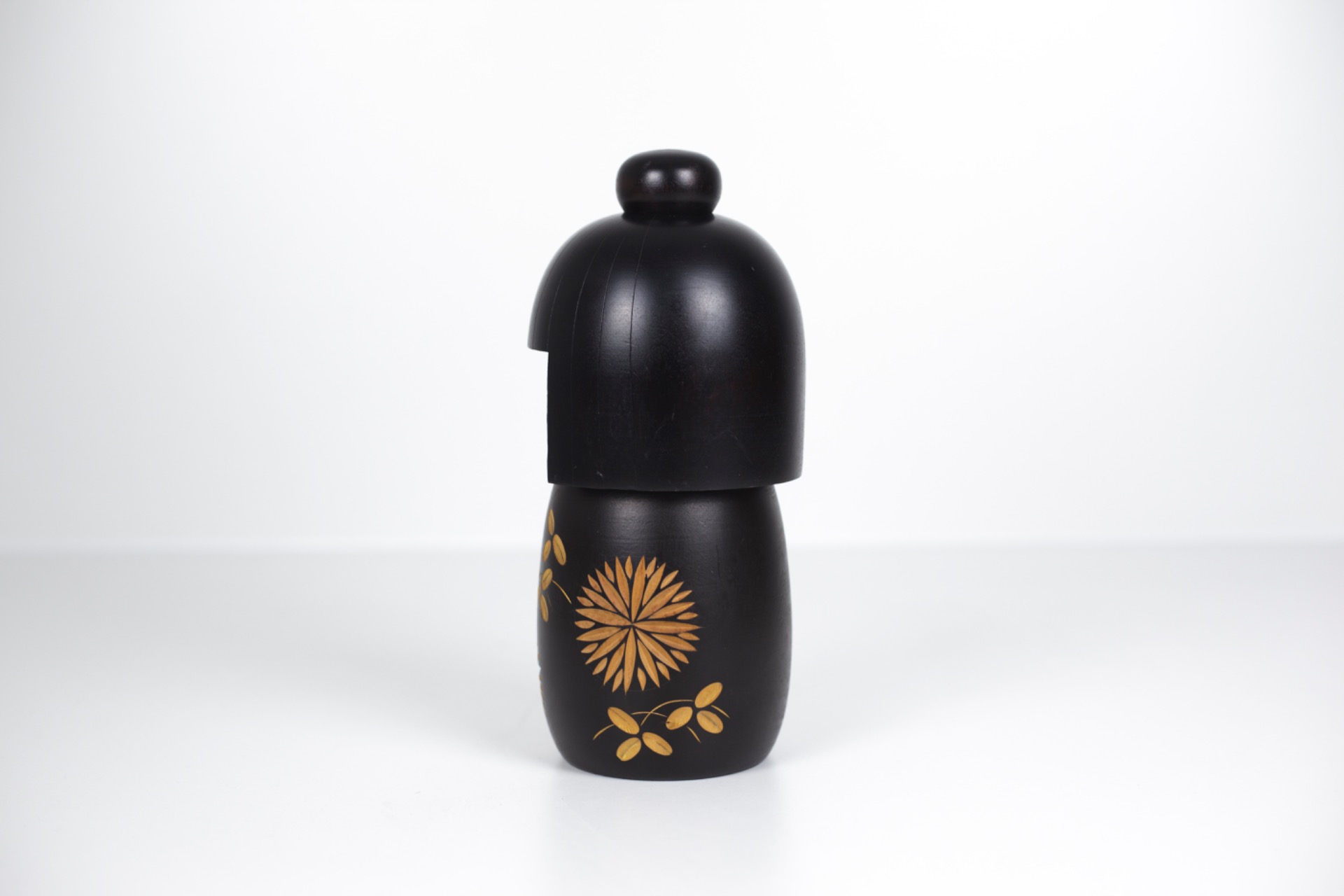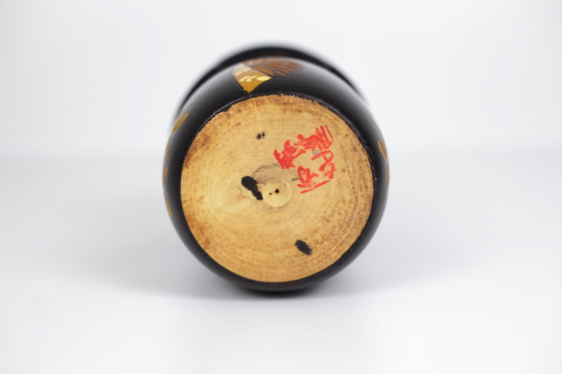Deze creatieve Kokeshi is vervaardigd door Kazuo Takamizawa (高見澤一夫), een Japanse kokeshi-kunstenaar die bekendstaat om zijn verfijnde vormgeving en elegante decoratieve stijl binnen het sōsaku (creatieve) Kokeshi-segment.