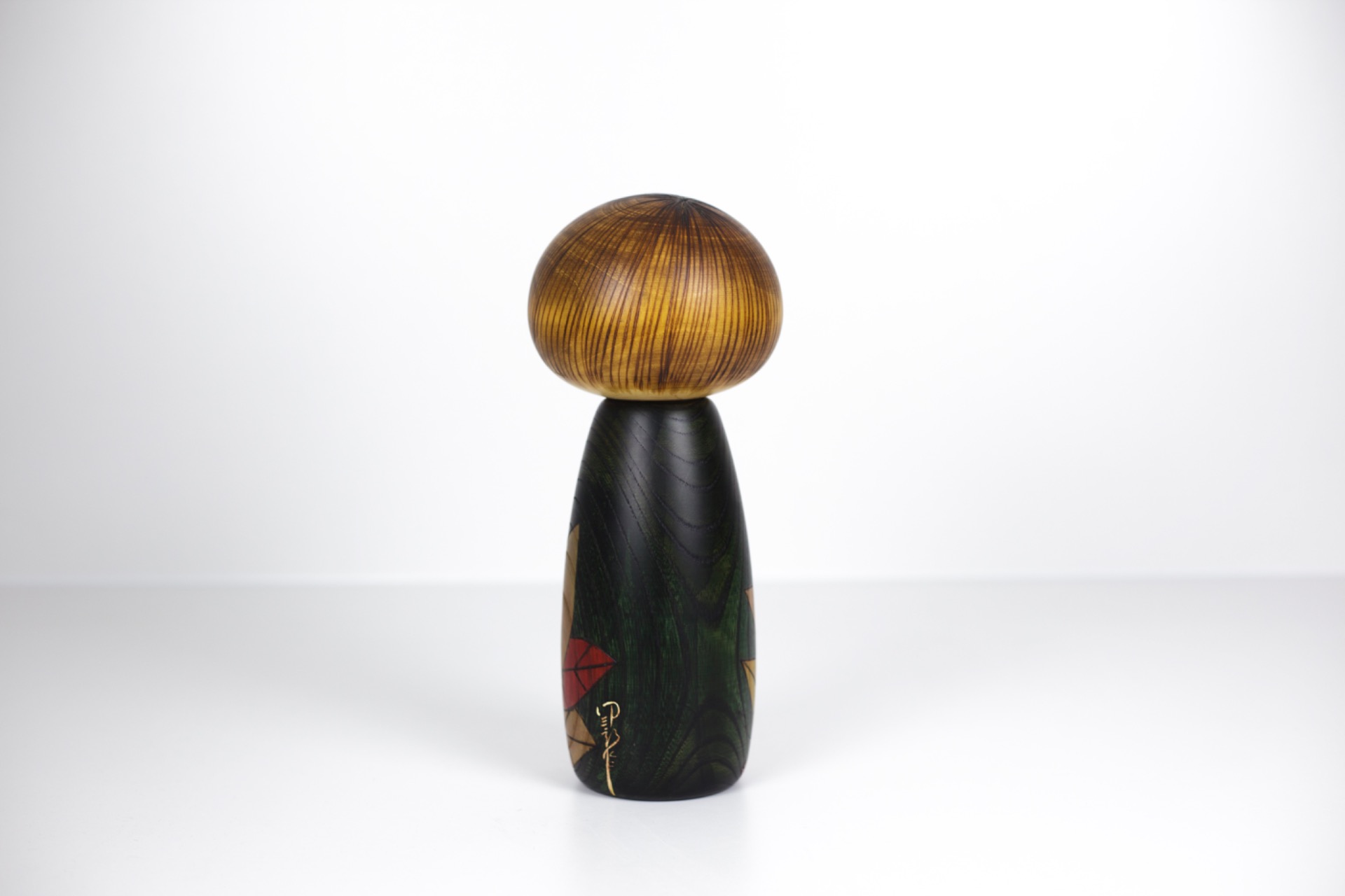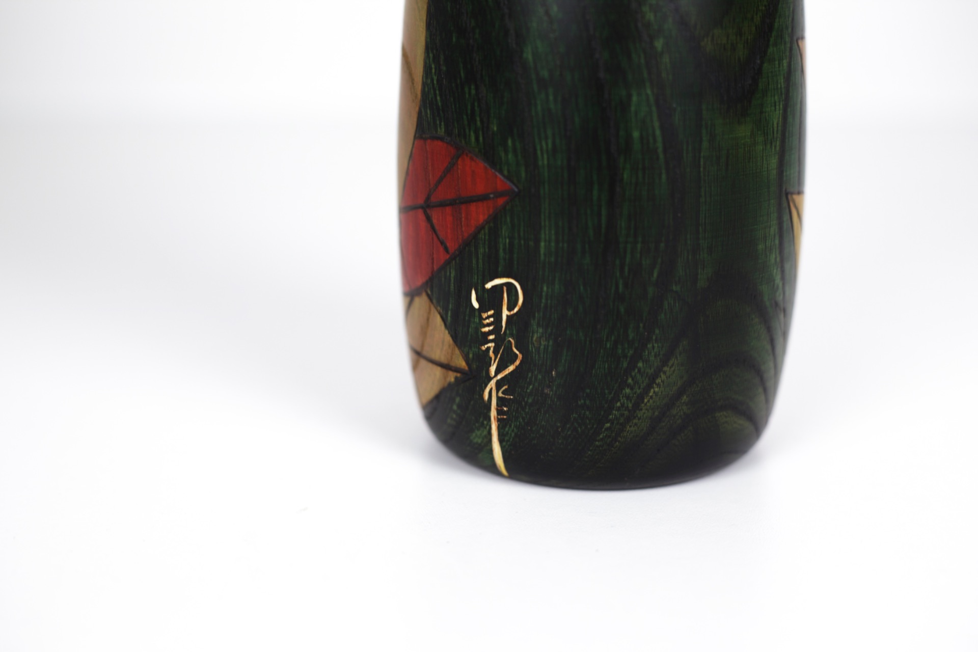 Deze creatieve Kokeshi is vervaardigd door Usaburo (卯三郎) zelf. De goudkleurige handtekening op de achterzijde luidt 卯三作 (Usaburo saku), wat letterlijk betekent "gemaakt door Usaburo".