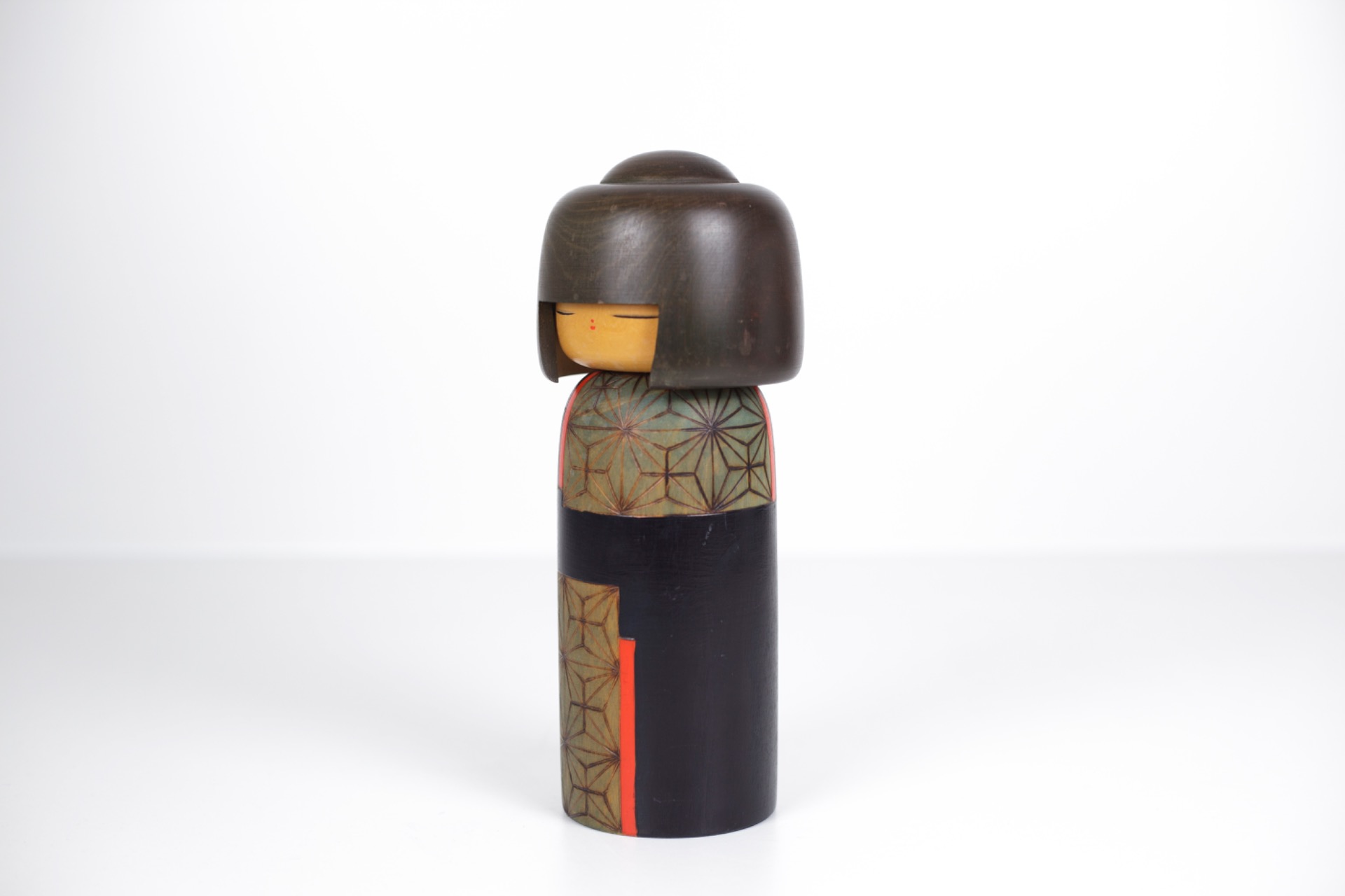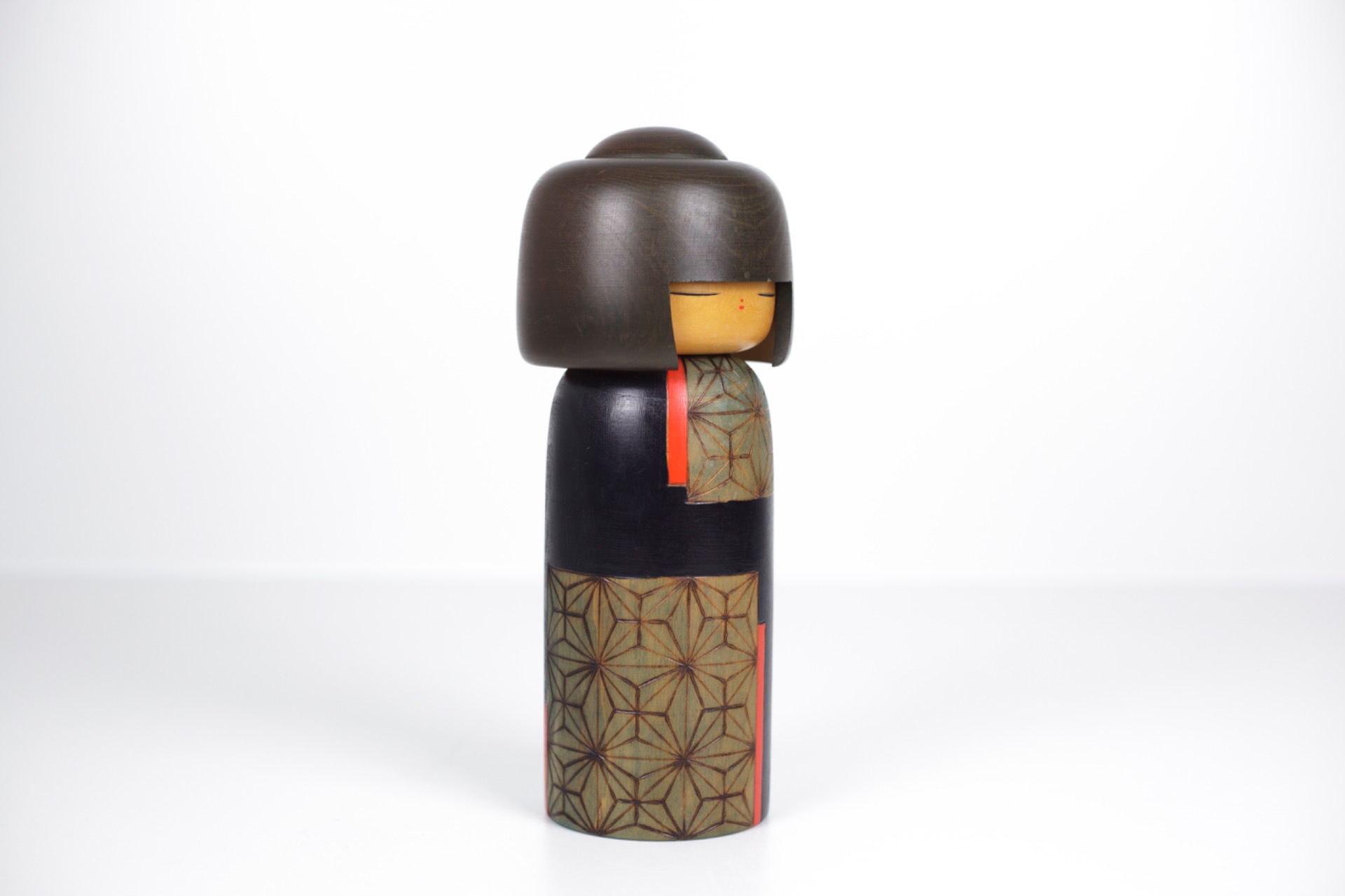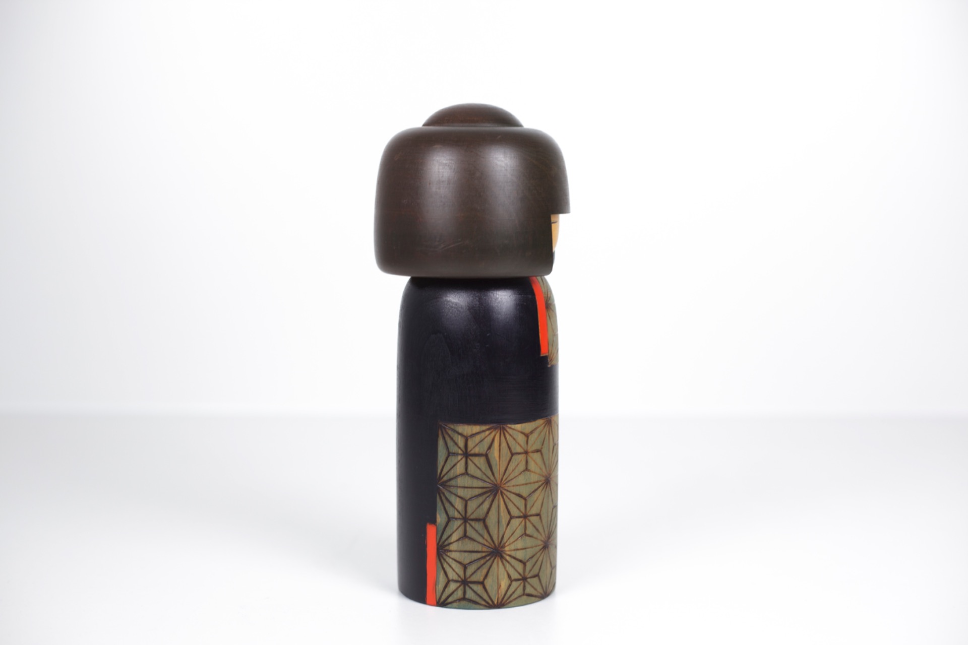 Deze Kokeshi straalt rust en concentratie uit. De gesloten ogen, het slanke silhouet en het evenwicht tussen donkere tonen en subtiele kleurvlakken maken dit tot een sterk artistiek object.