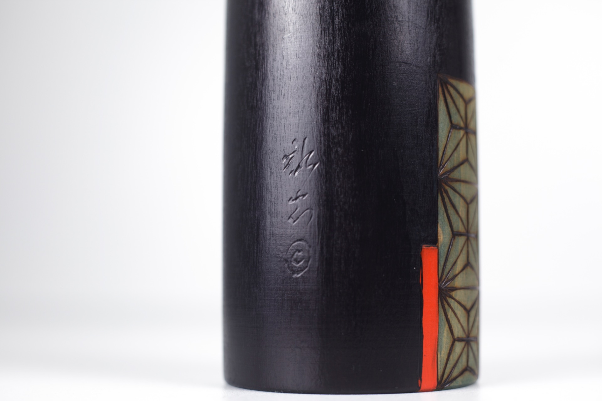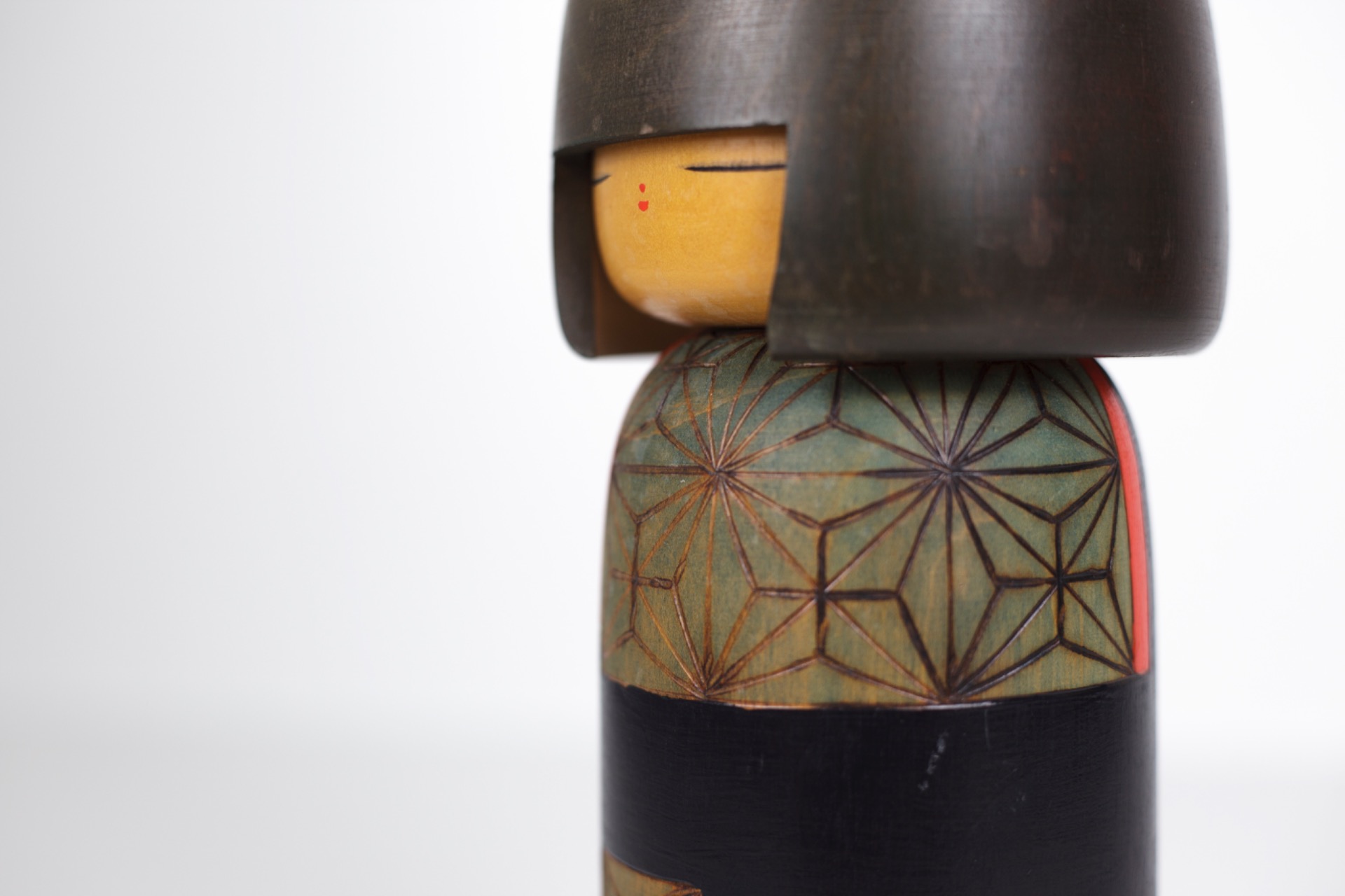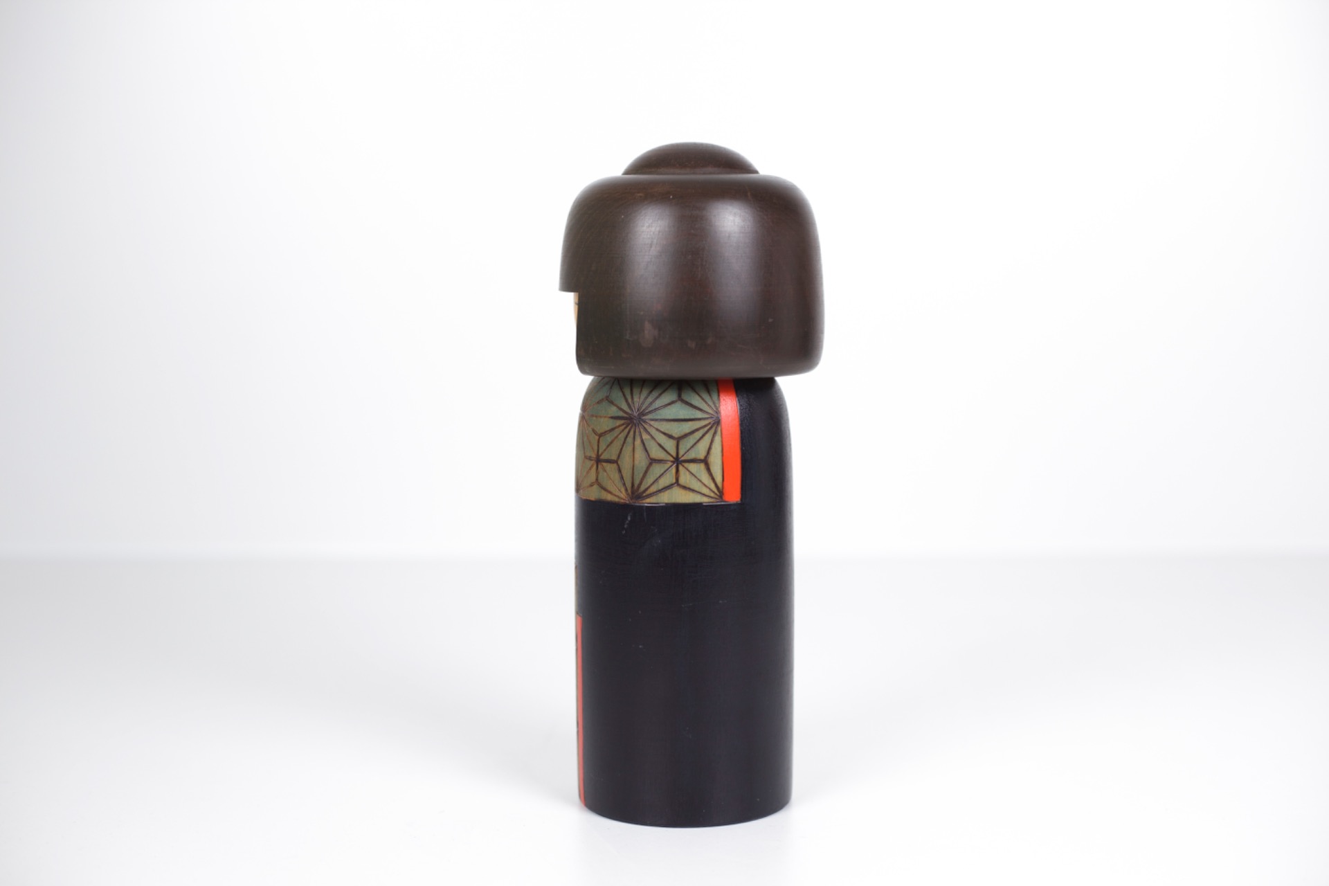 Deze Kokeshi straalt rust en concentratie uit. De gesloten ogen, het slanke silhouet en het evenwicht tussen donkere tonen en subtiele kleurvlakken maken dit tot een sterk artistiek object.