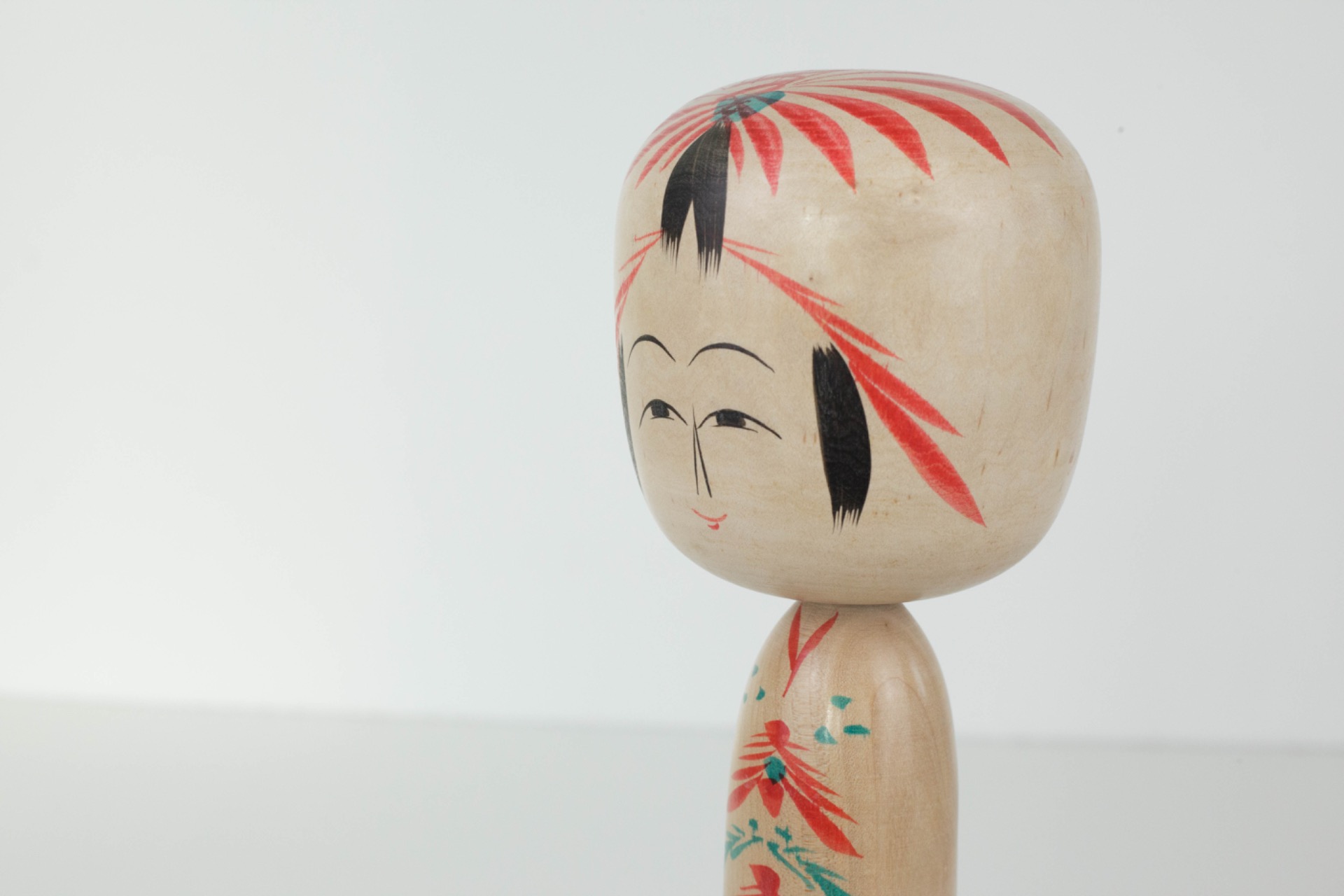 A refined Togatta Kokeshi with vivid red floral decoration and a gentle expression.