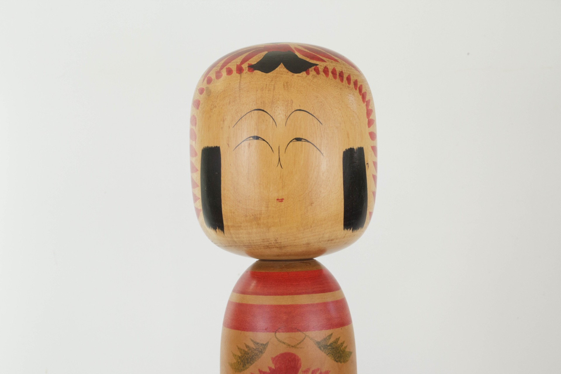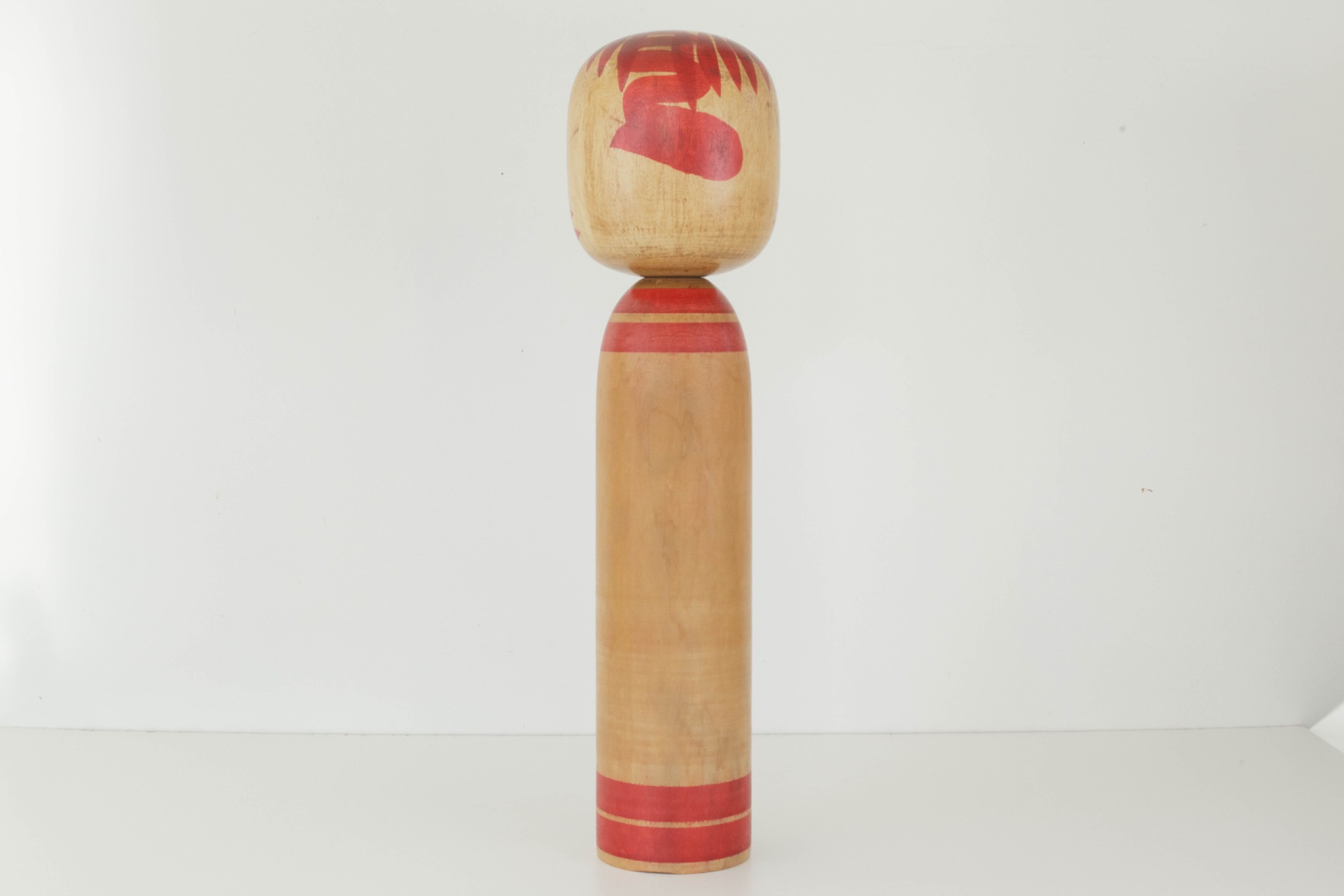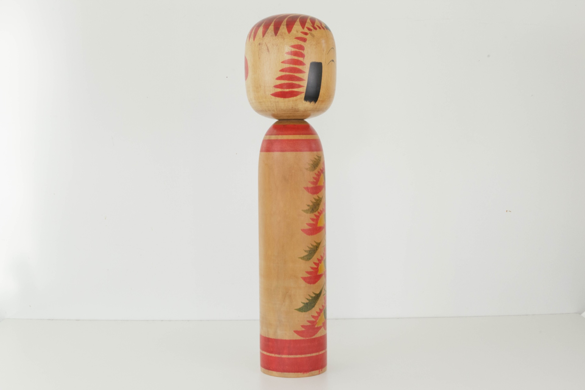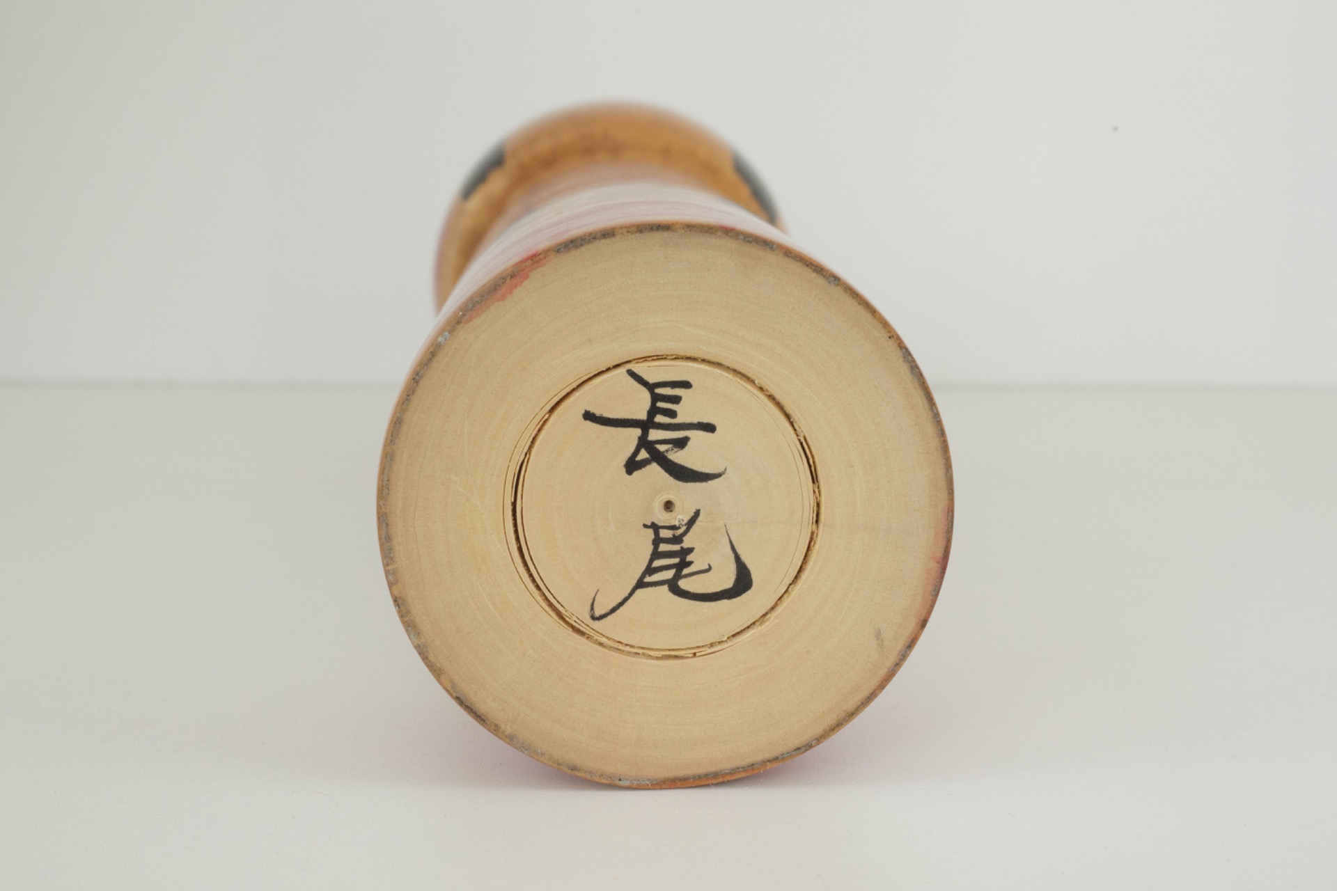 Deze uitzonderlijk grote traditionele Kokeshi is gesigneerd 長尾 (Nagao) en behoort tot de Tōgatta-stijl (遠刈田系), afkomstig uit de prefectuur Miyagi.