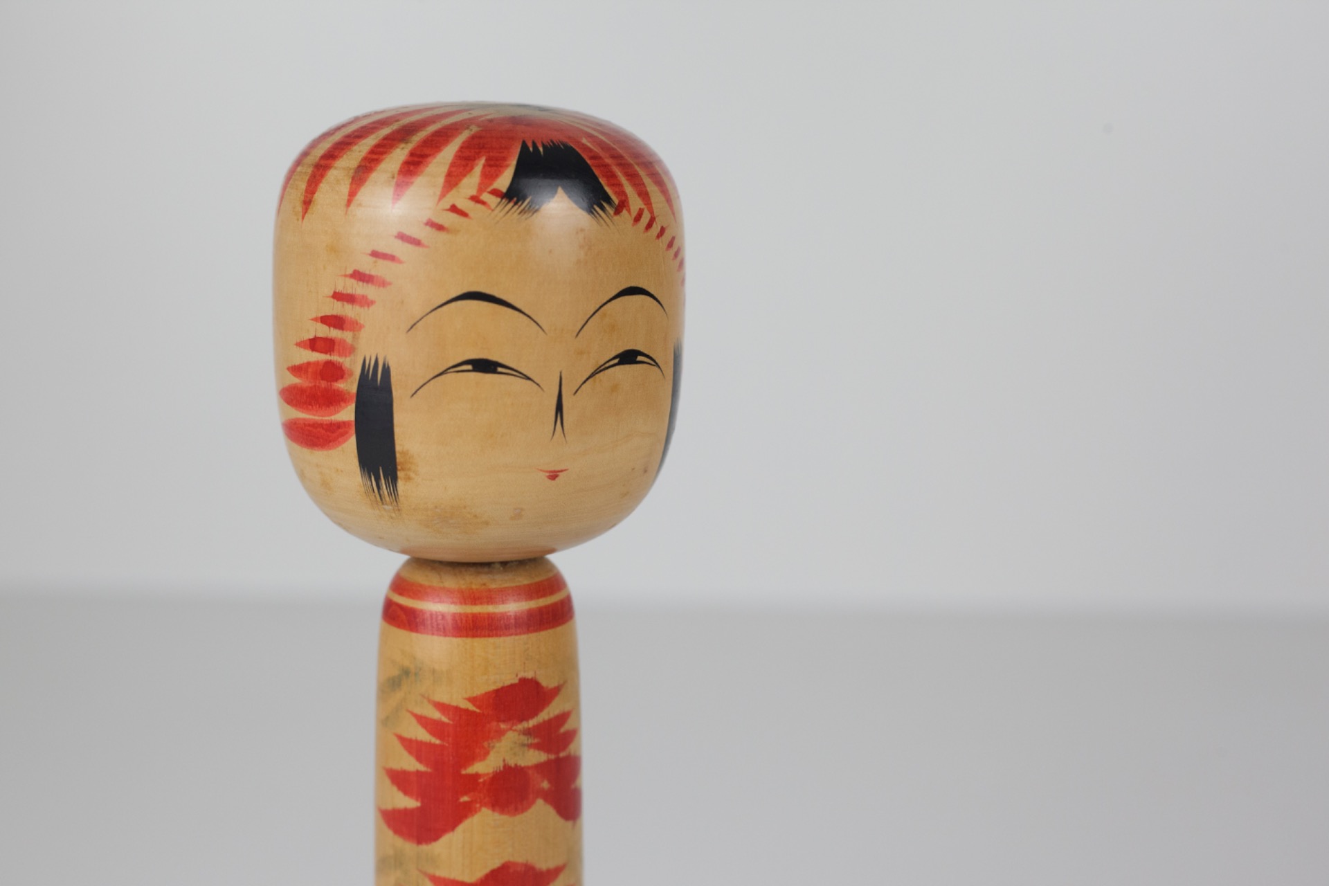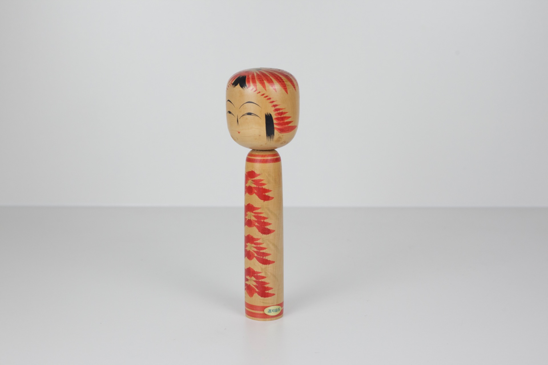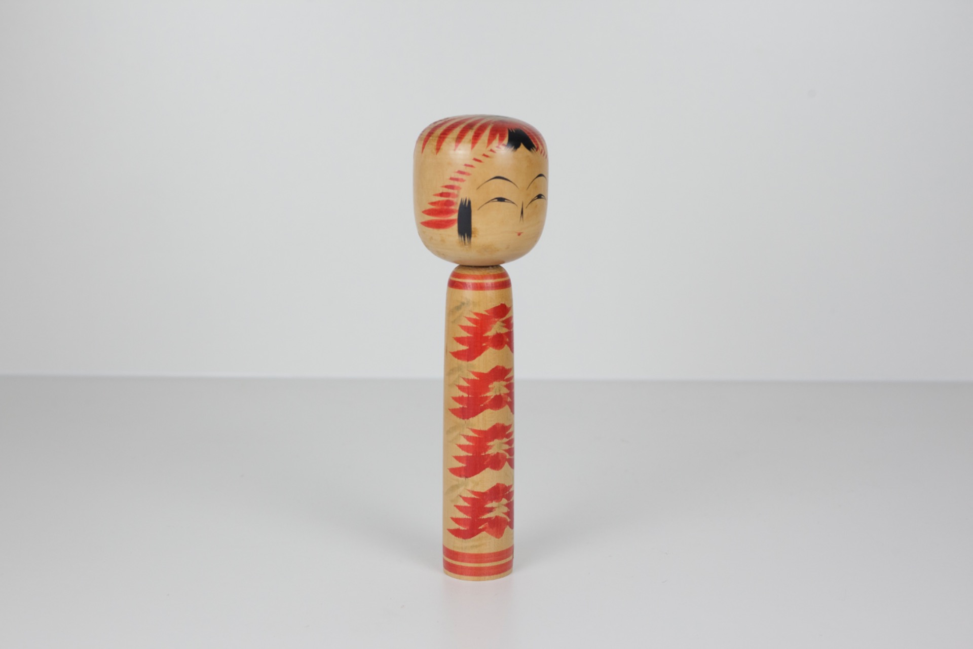 Deze traditionele Kokeshi straalt rust en verfijning uit door haar slanke vorm en het ritmische bloemmotief dat zich over het lichaam verspreidt. De combinatie van natuurlijk hout en helder rood zorgt voor een warm en tijdloos geheel.