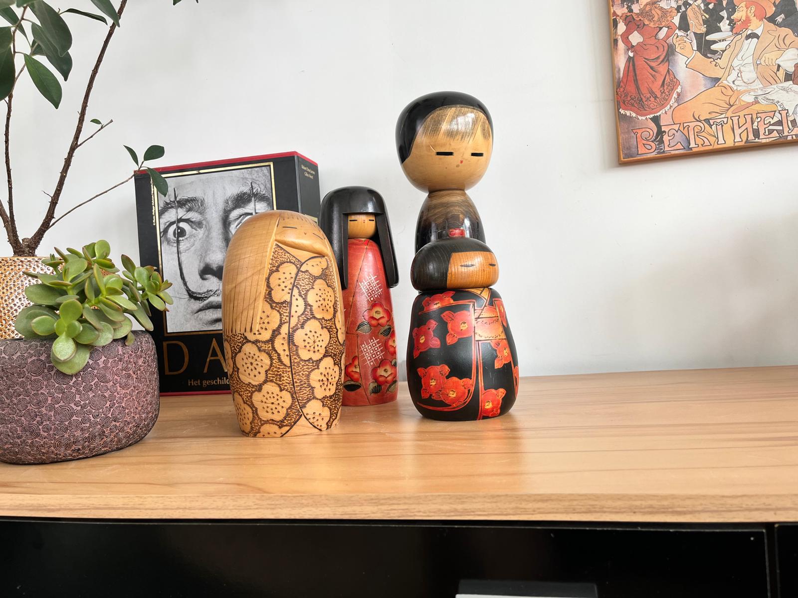 Deze gracieuze Kokeshi van meester Yoshio Otani draagt de titel Ume no Sato – "het dorp van de pruimenbloesems". Haar kimono is rijkelijk versierd met een patroon van bloesems, zorgvuldig ingebrand in het hout. De fijne afwerking en sobere expressie weerspiegelen een diepe verbondenheid met de natuur en de seizoenen – een thema dat vaak terugkomt in het werk van Otani. Dit unieke stuk combineert technische verfijning met een ingetogen uitstraling, en vormt een prachtig eerbetoon aan de Japanse lente.