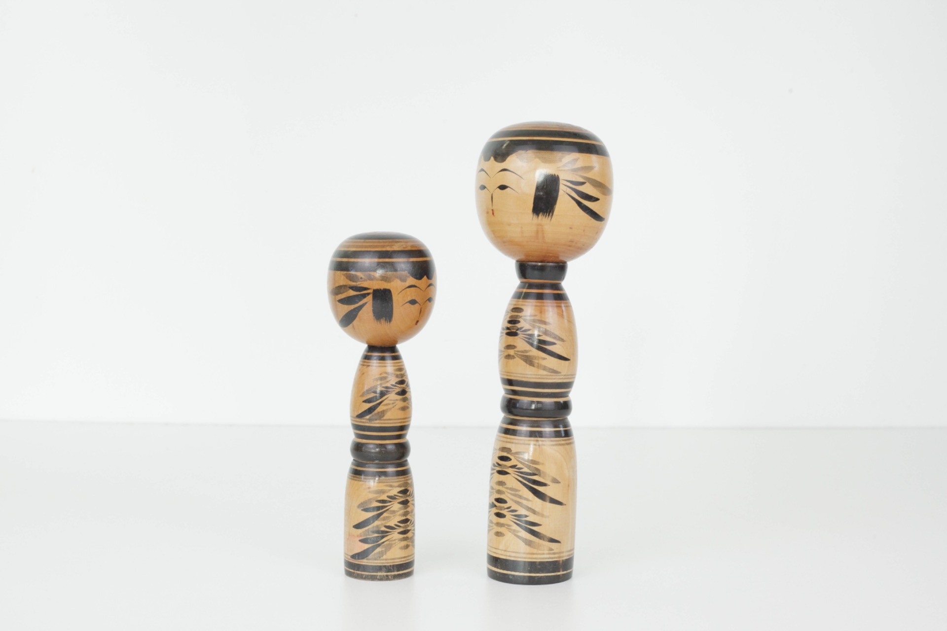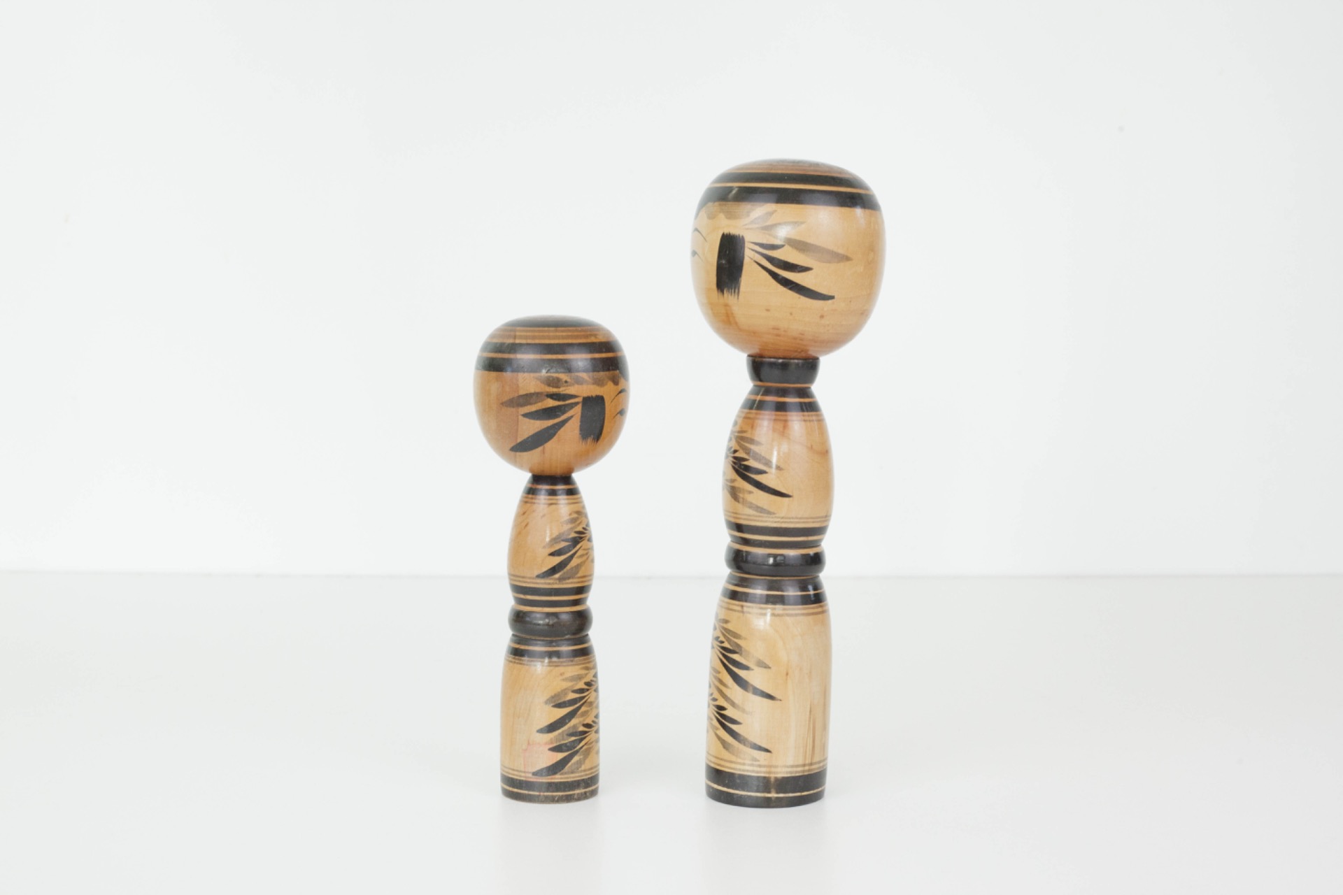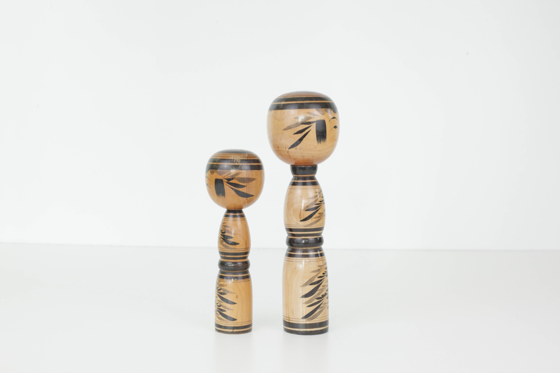 A pair of classic Yajirō-style Kokeshi by Naoki Satō (佐藤尚紀). The contrast of natural wood and deep black, combined with the vertical leaf pattern, makes this set instantly recognisable within the Yajirō lineage.