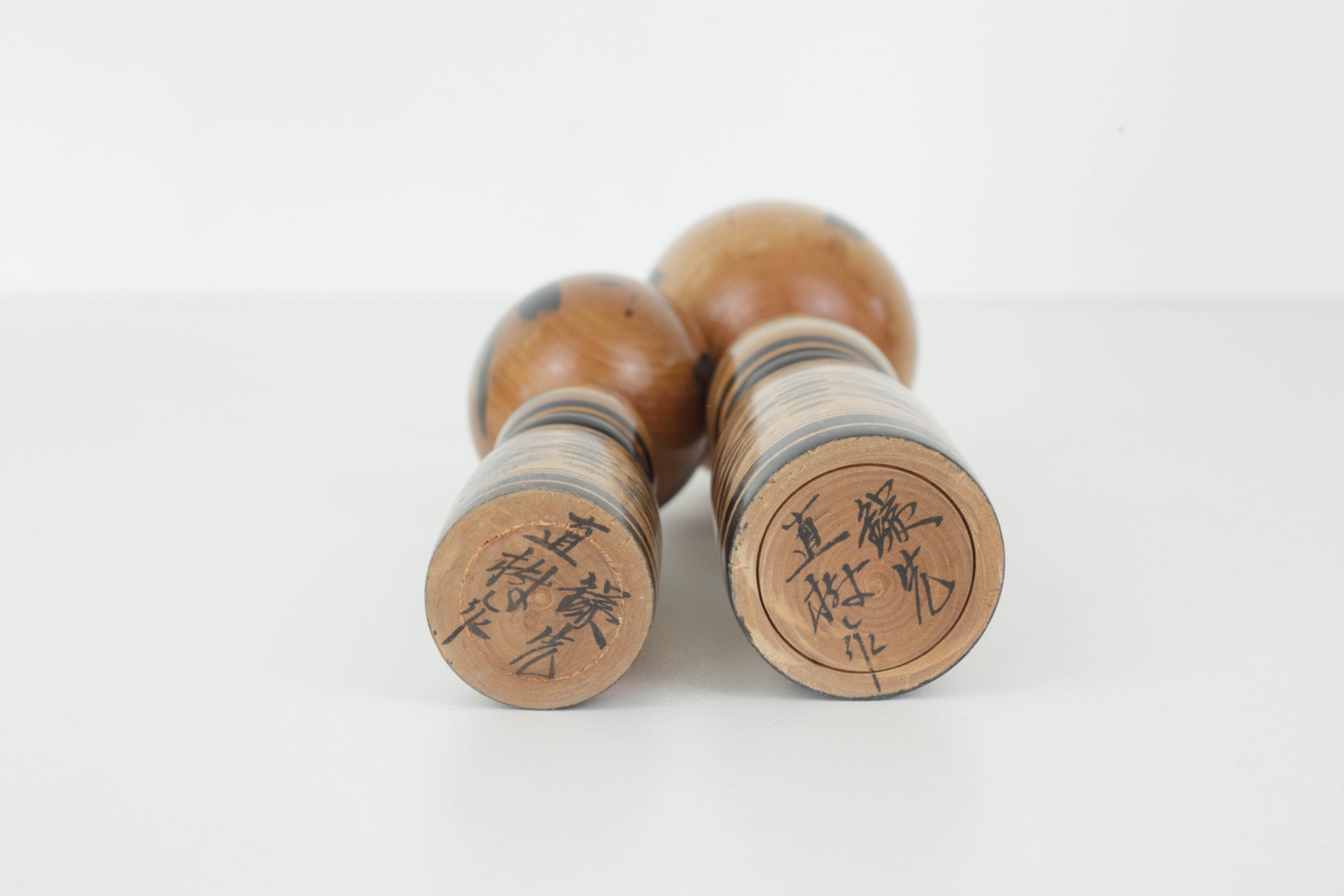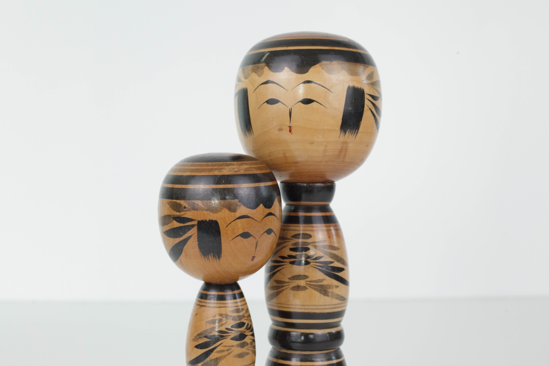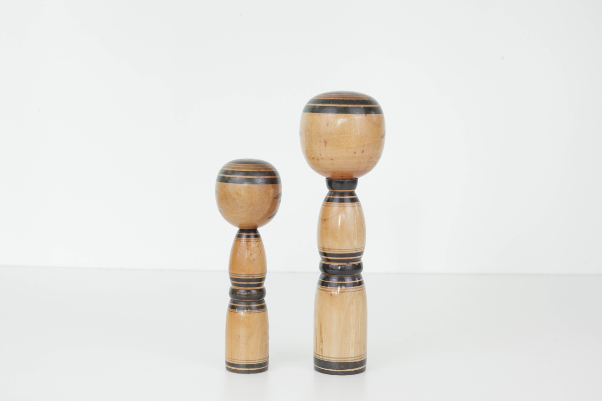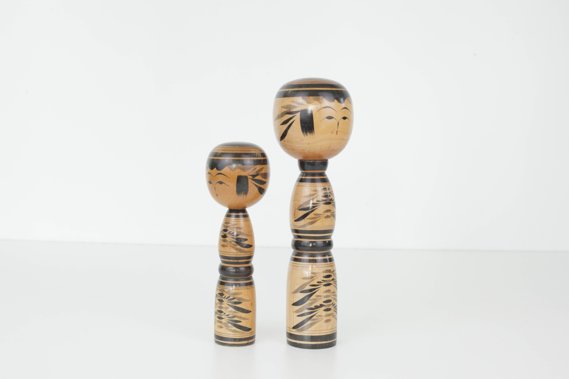 A pair of classic Yajirō-style Kokeshi by Naoki Satō (佐藤尚紀). The contrast of natural wood and deep black, combined with the vertical leaf pattern, makes this set instantly recognisable within the Yajirō lineage.